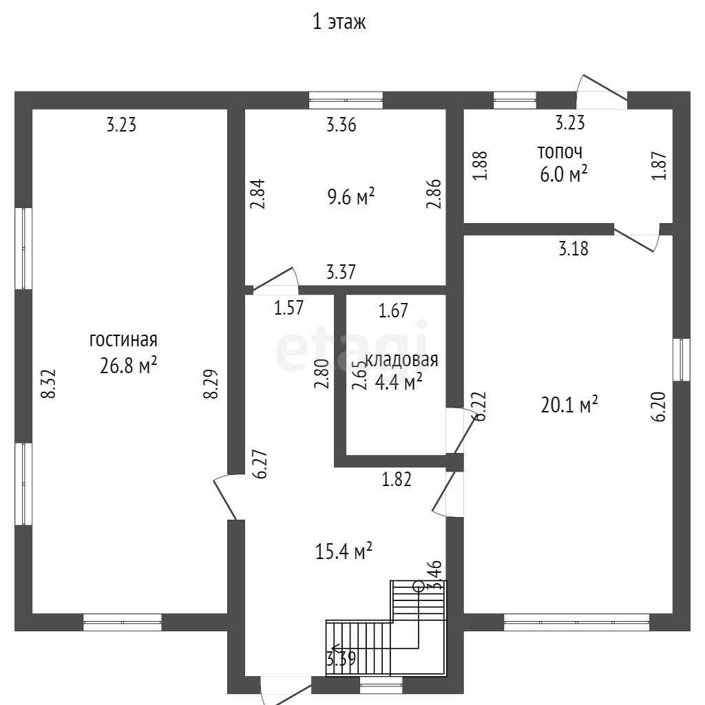 Удобный и функциональный проект общей площадью 167,4 кв.м. – большая гостиная, кухня, кладовая и топочная на первом этаже, две жилые комнаты с гардеробными на втором, а также два санузла, два холла и большой подвал.
