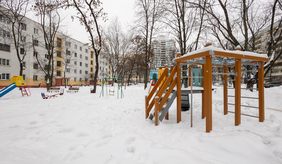 Тихий благоустроенный двор и прилегающая территория, детская площадка во дворе дома.