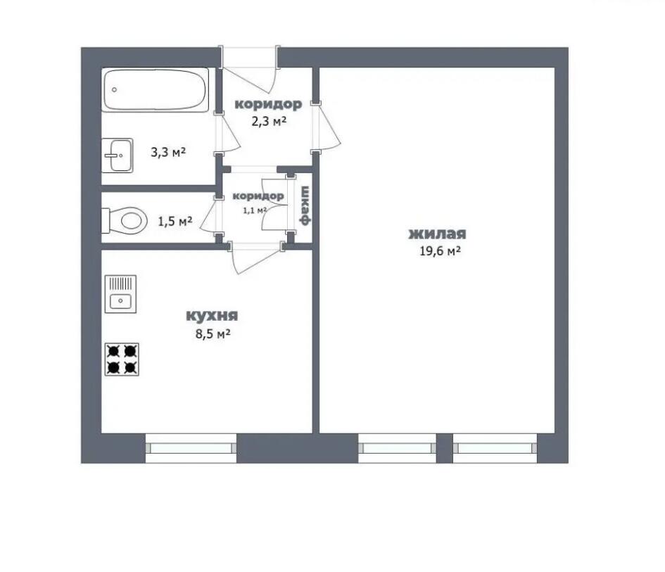 - Общая площадь квартиры 36,7 кв.м., жилая площадь 19,6 кв.м., площадь кухни 8,5 кв.м.