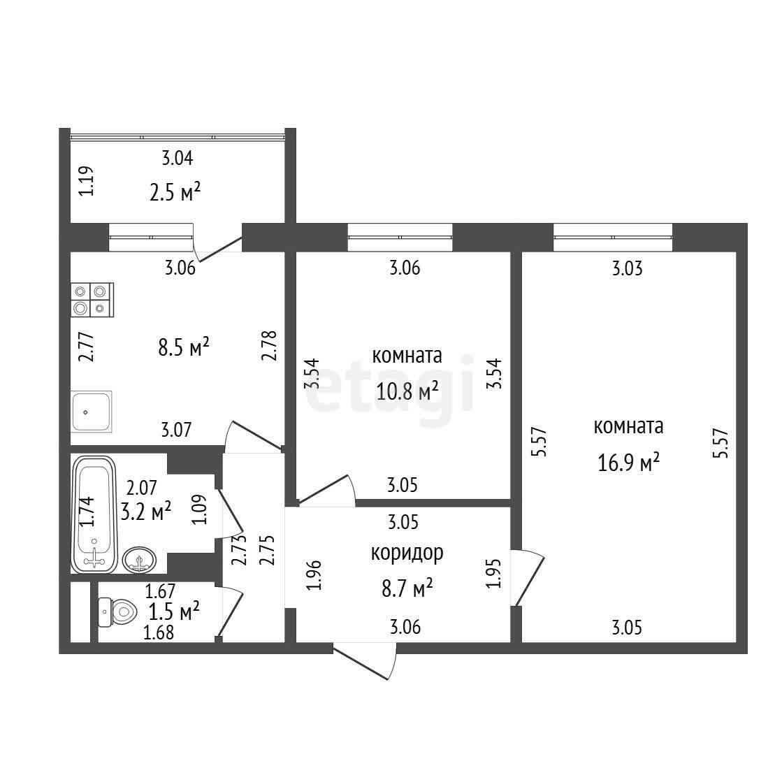 Комнаты: Две раздельные жилые зоны (16,9 м2 и 10,8 м2) для отдыха и работы.