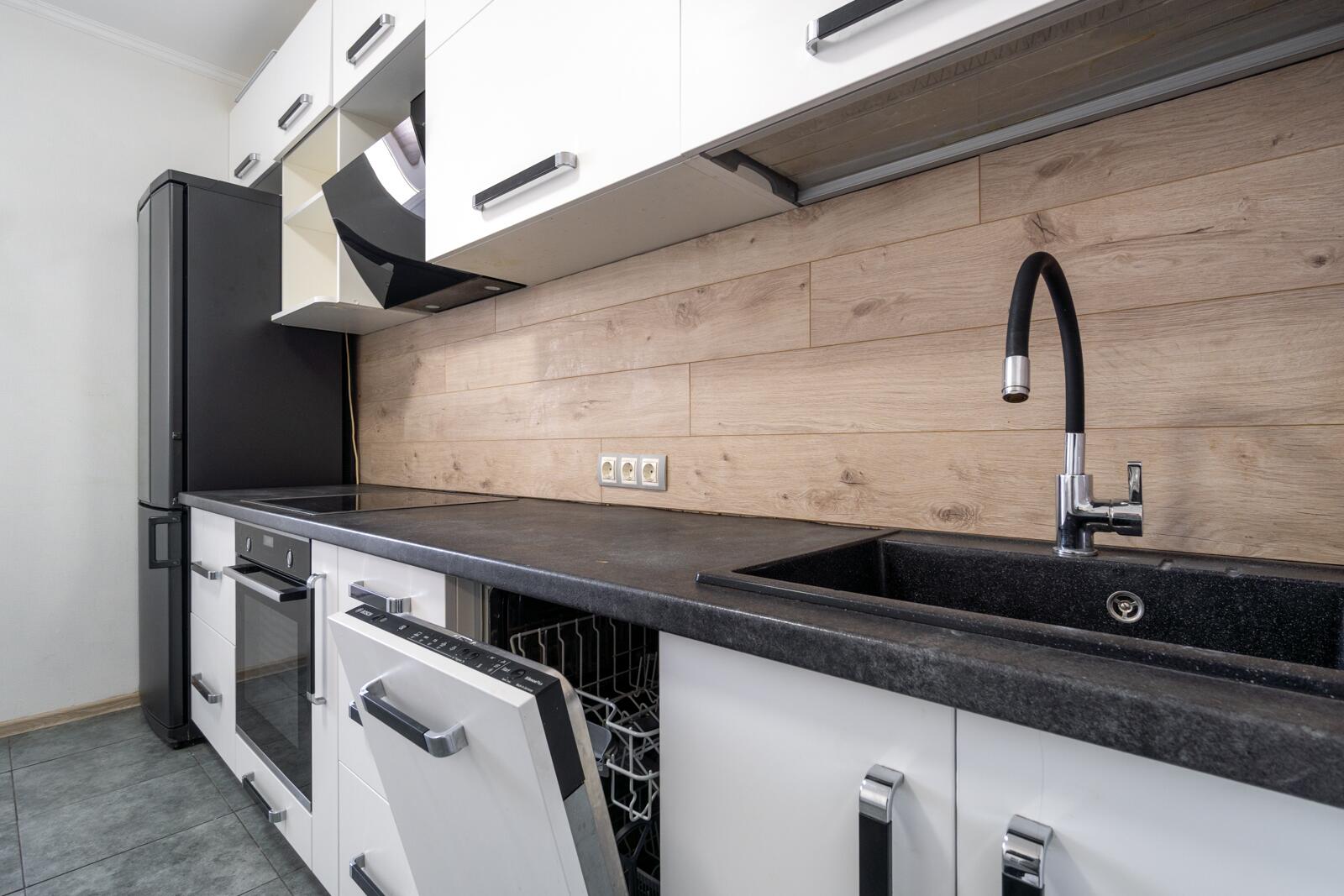 - Качественные материалы: ламинат и керамогранит, натяжные потолки.