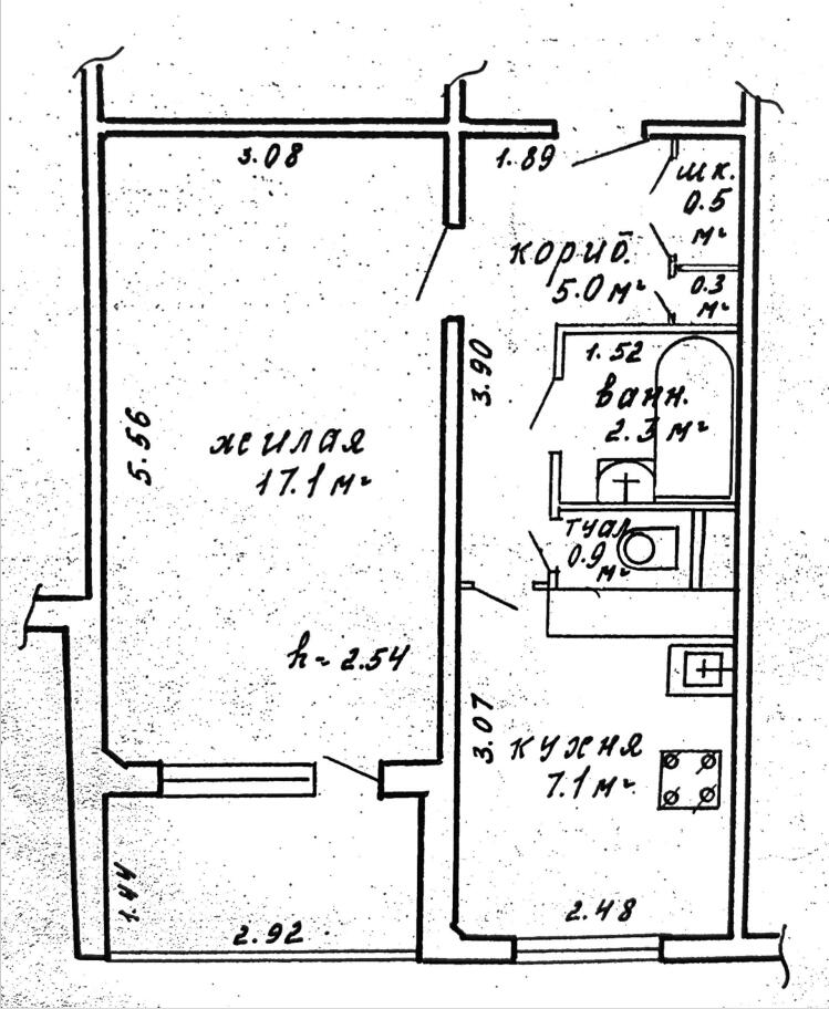 Площадь по СНБ — 33,2 м2Жилая — 17,1 м2Кухня — 7,1 м2Высота потолков — 2,55 м