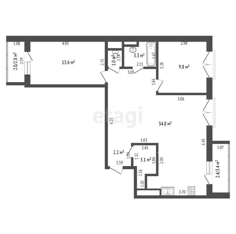 - кухня-гостиная 34.8 м2 и две отдельные спальни 9,8 и 13,6 с выходом на лоджию