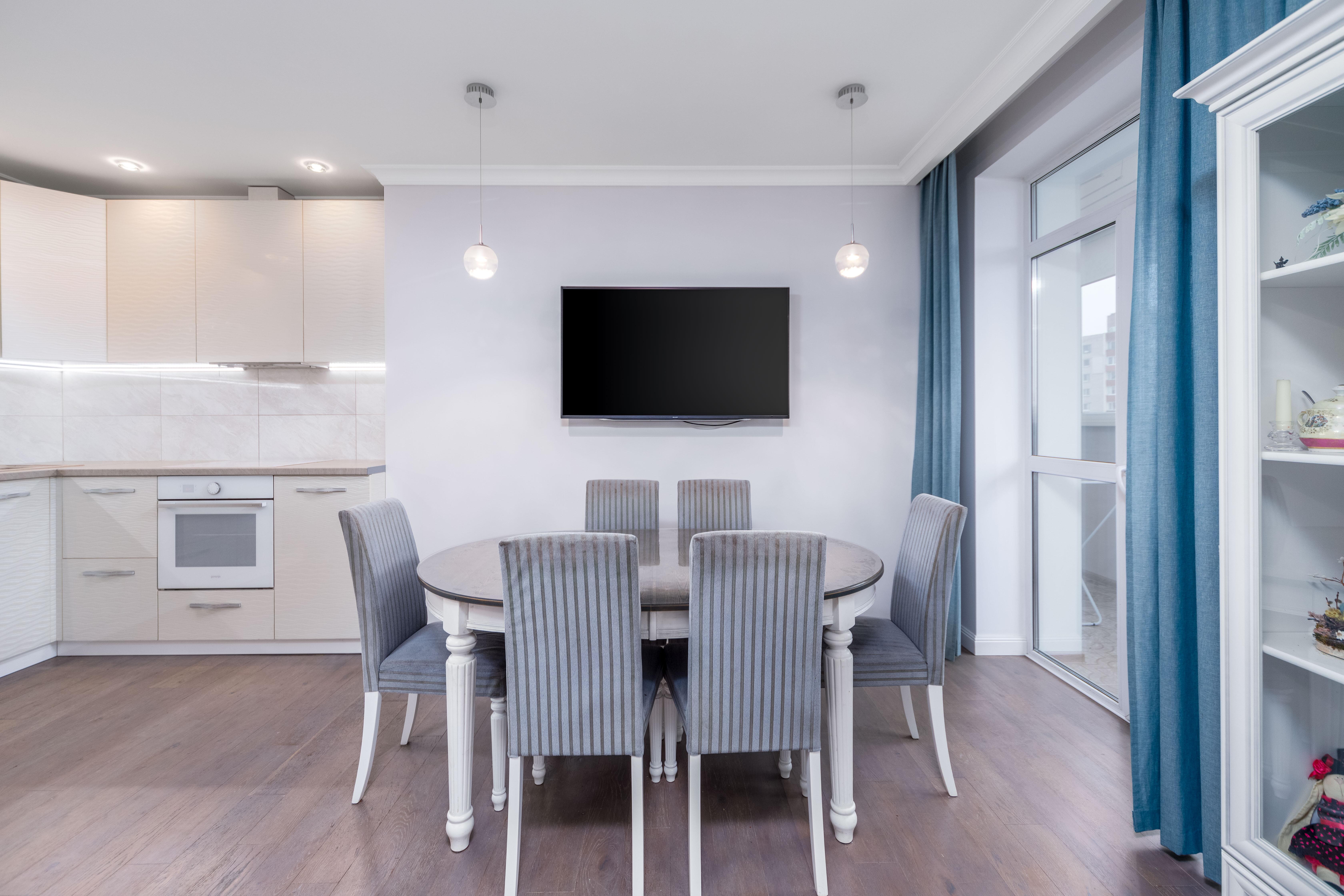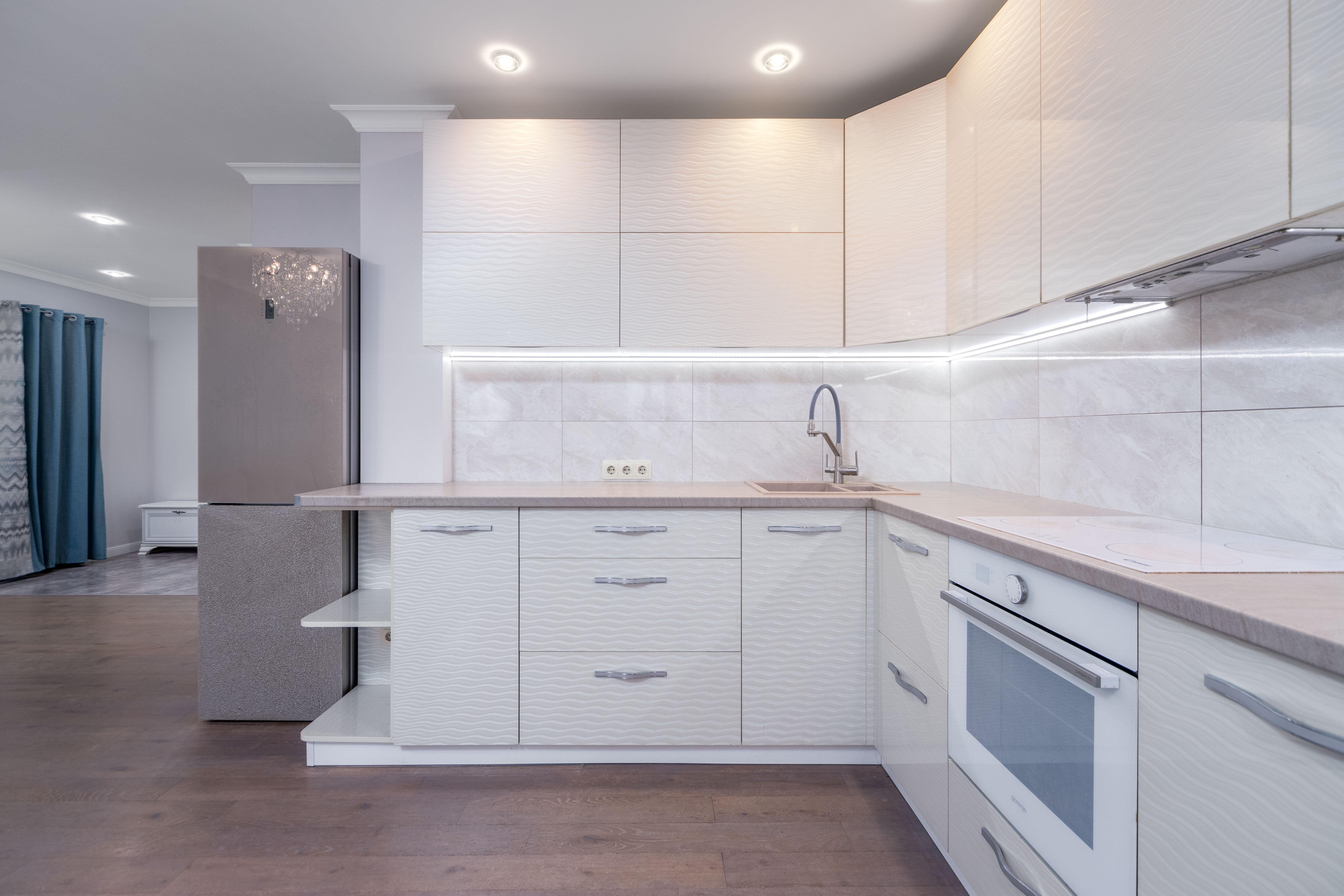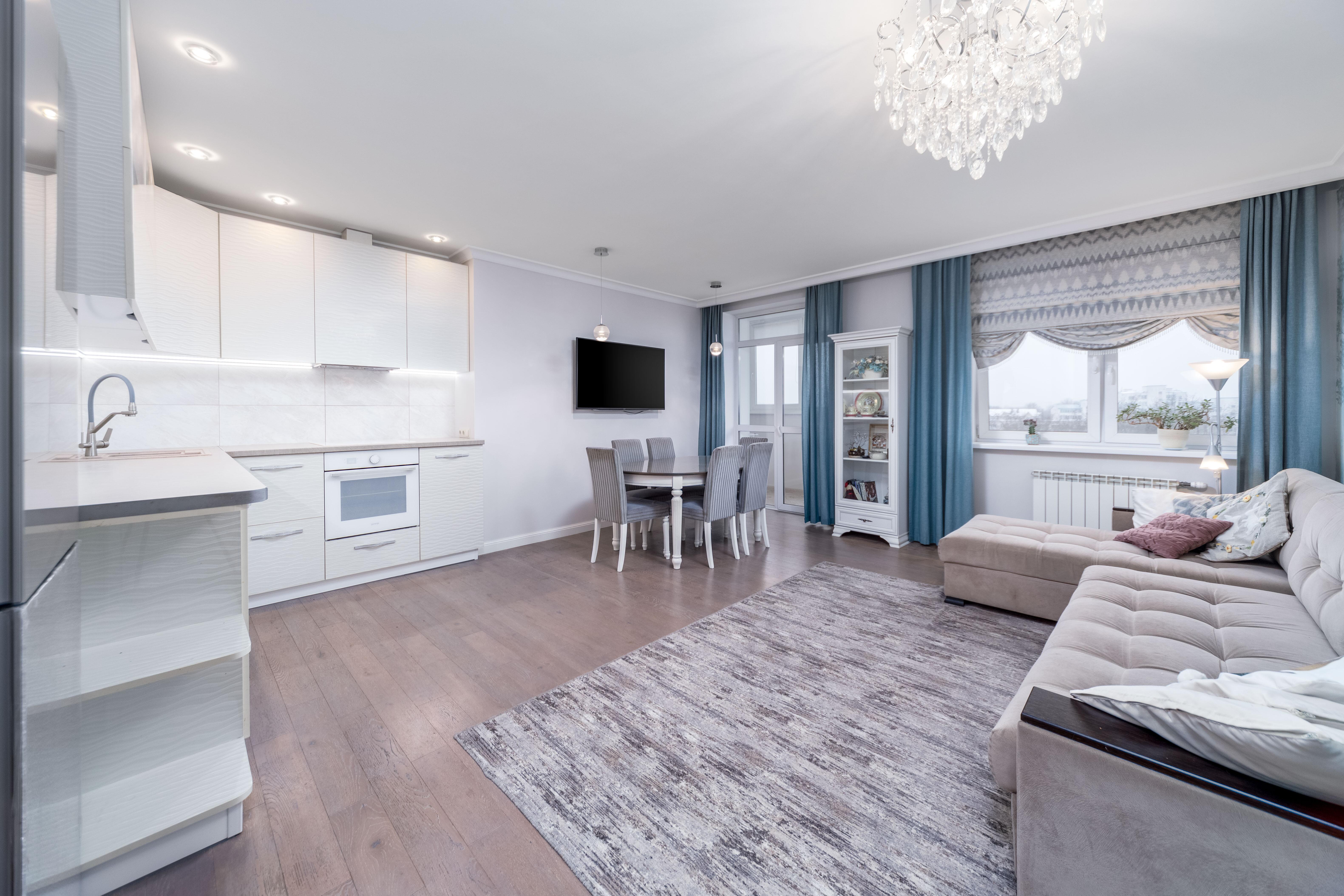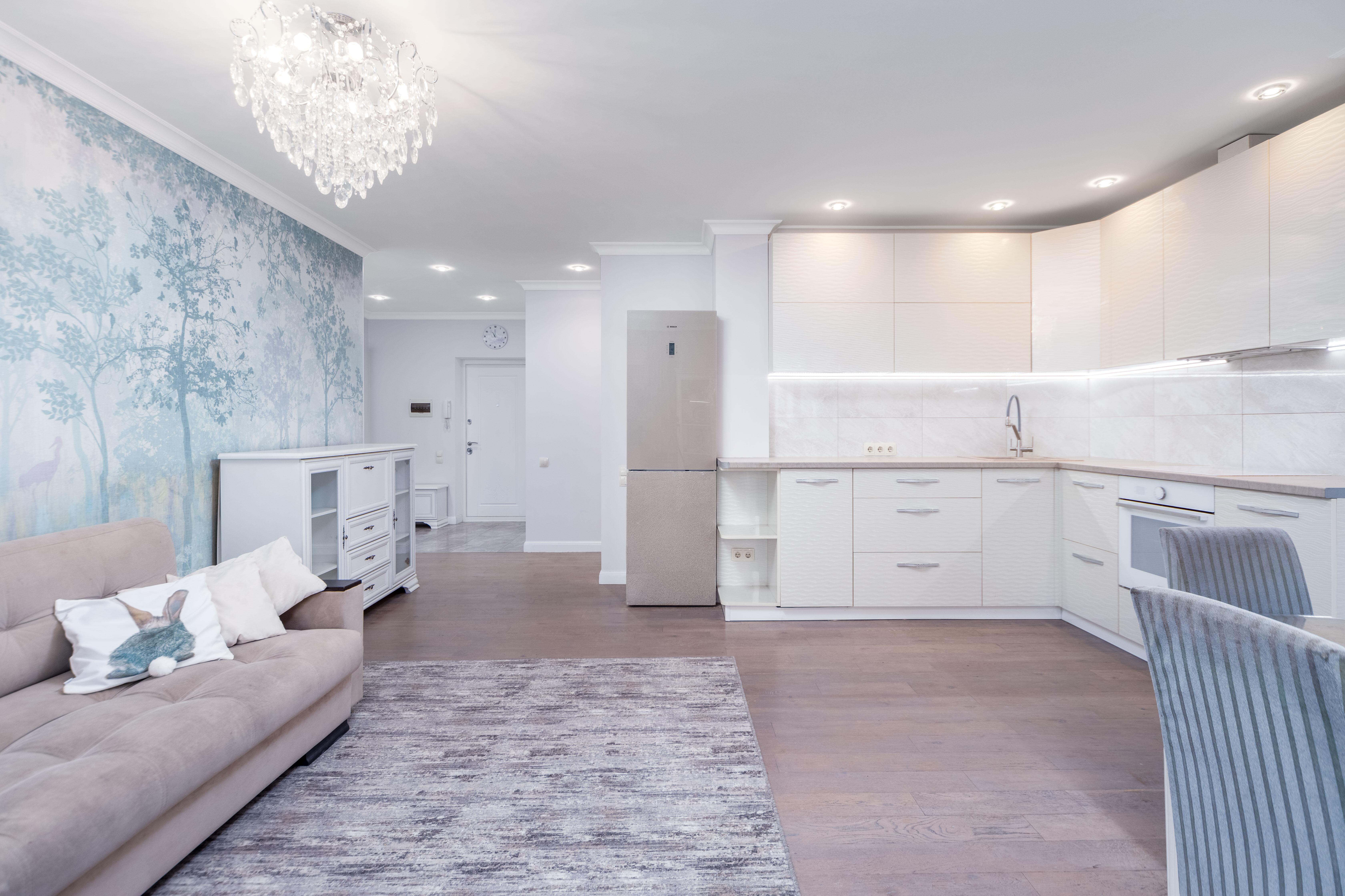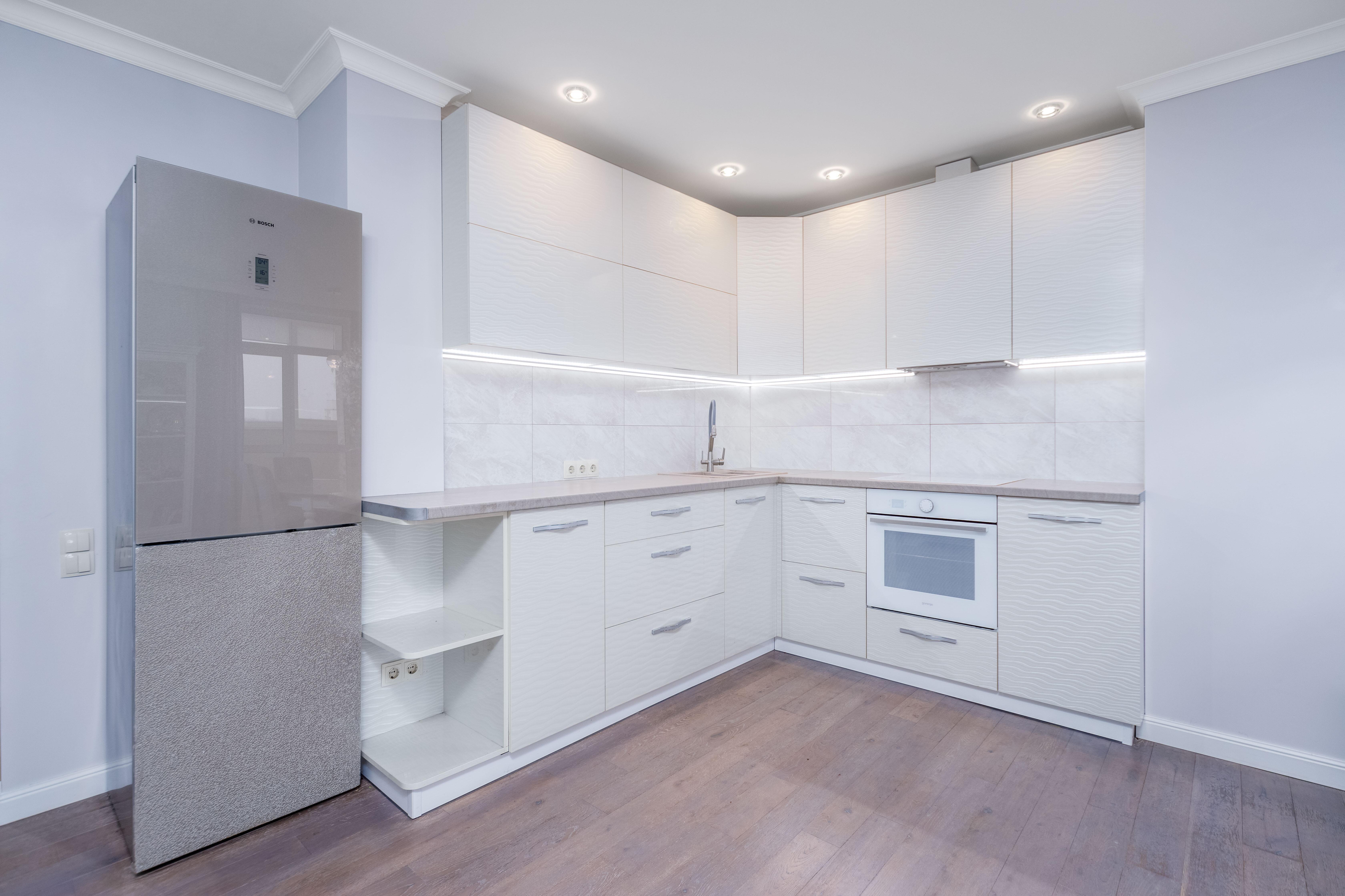 Просторная кухня-гостиная с выходом на застекленный балкон. Встроенная кухня с техникой: посудомоечная машина BOSCH, варочная панель, духовой шкаф Kandi , вытяжка, холодильник BOSCH. Грамотное зонирование пространства на обеденную зону и зону отдыха.