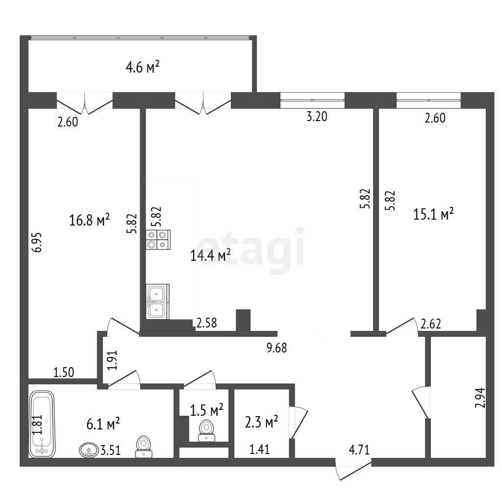 Две изолированные жилые комнаты 16,8 кв.м и 15,1 кв.м. Взрослая спальня и детская комната в противоположных сторонах квартиры.