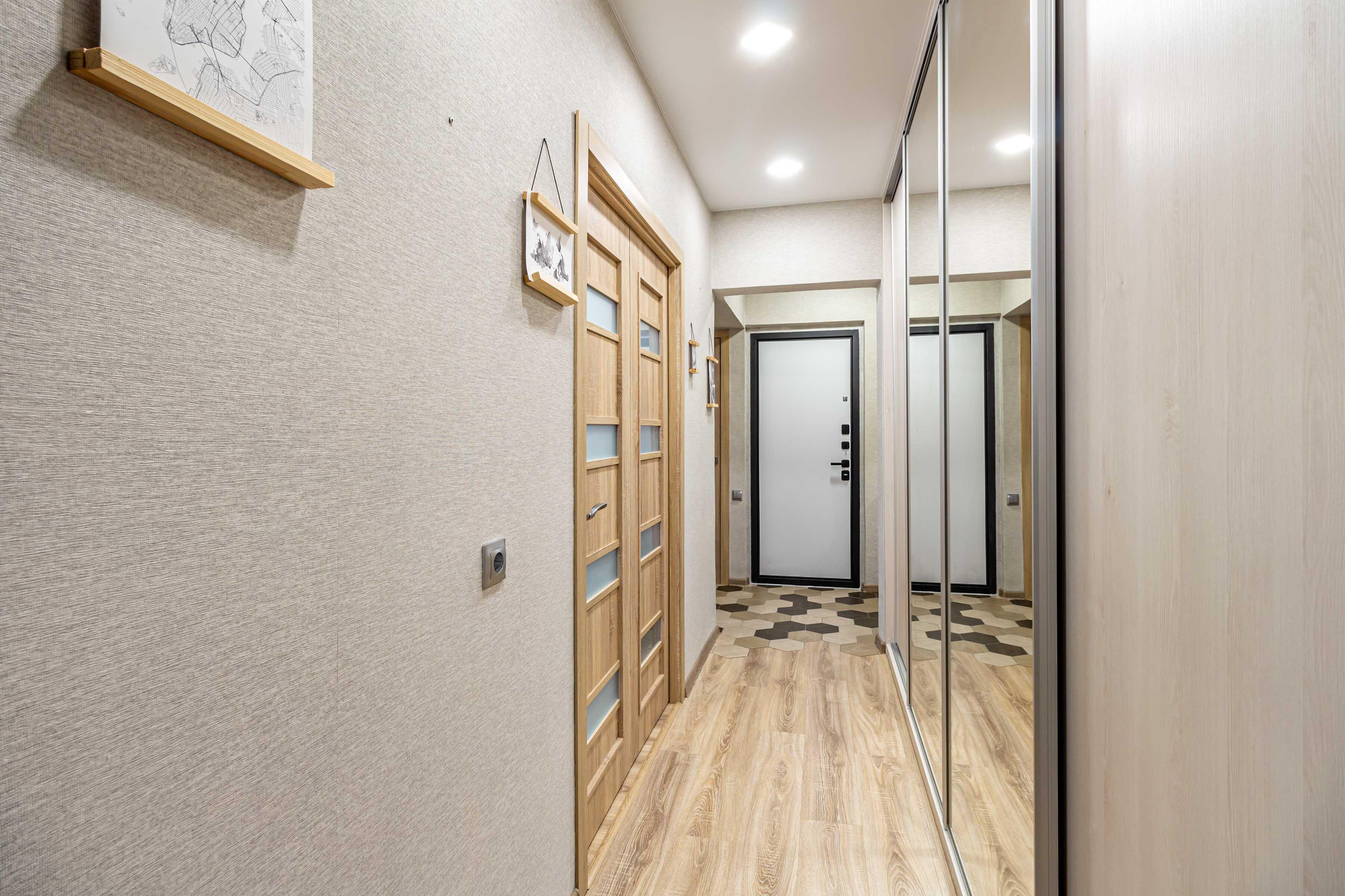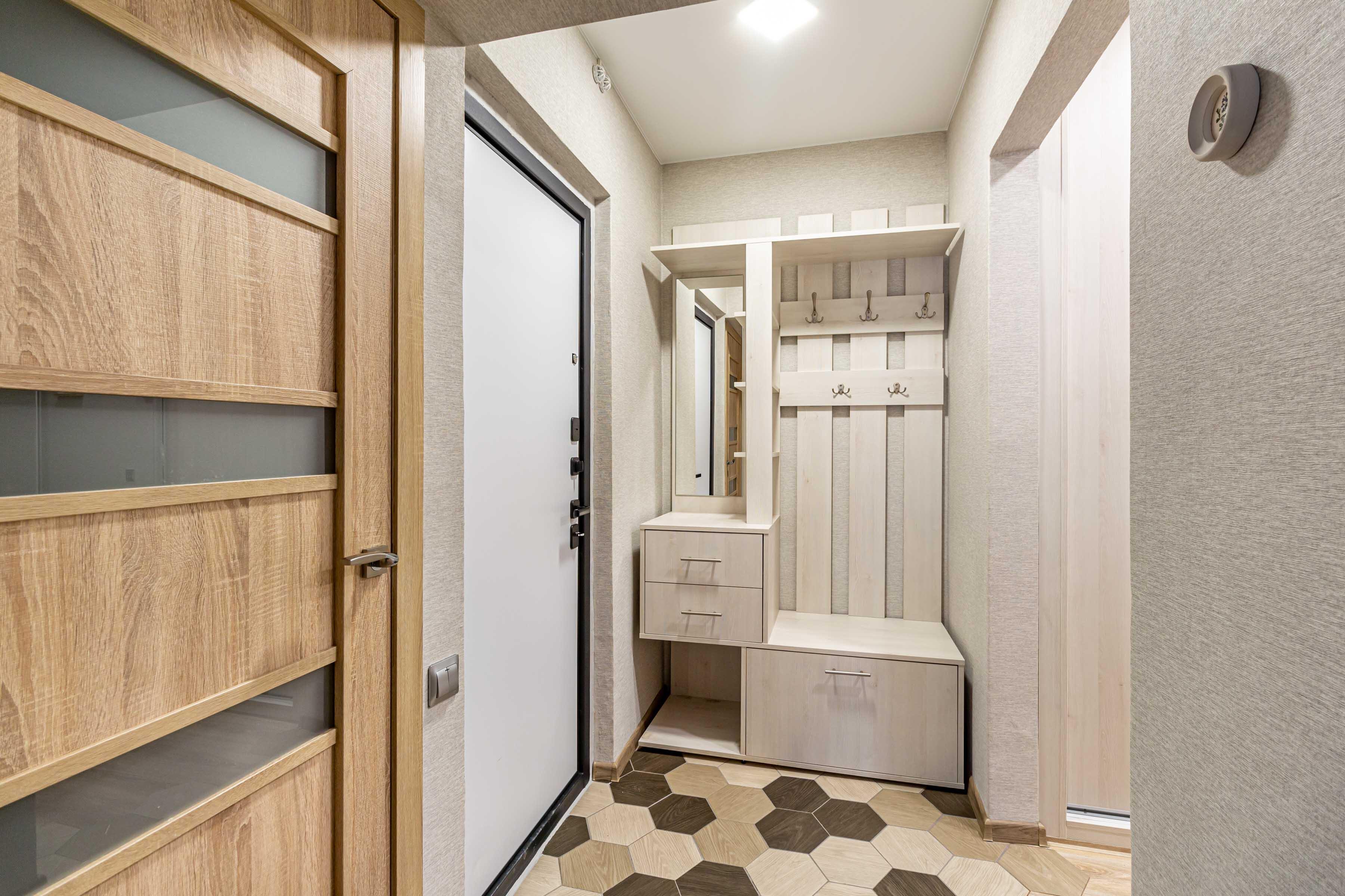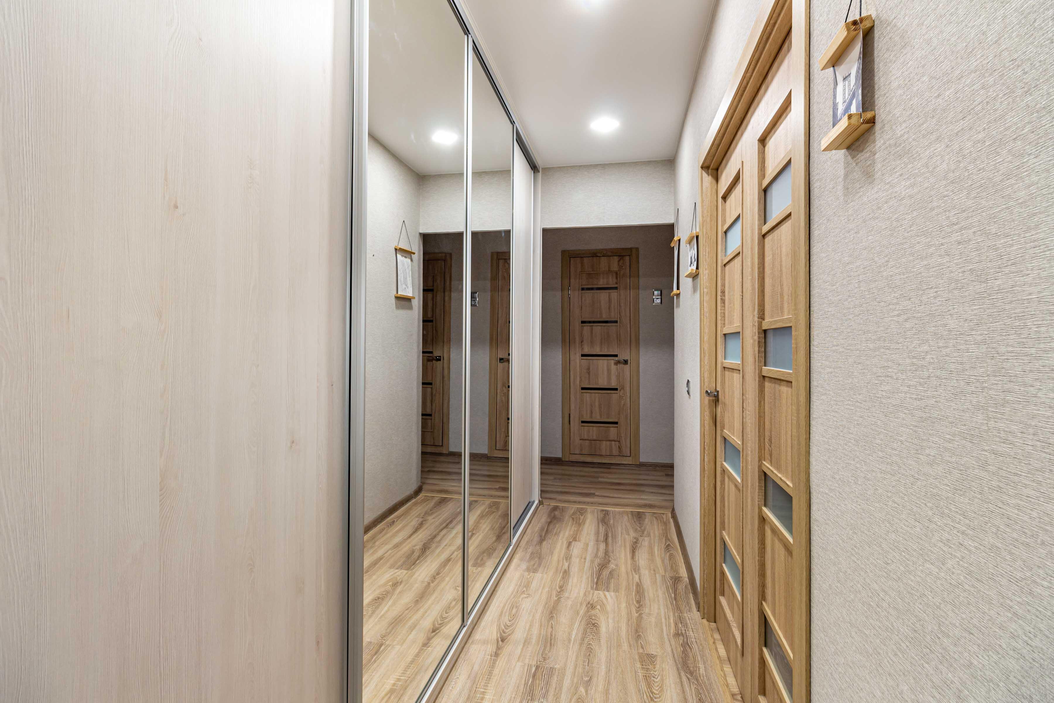 - Очень вместительный шкаф – купе в коридоре, в котором предусмотрены полки под все необходимые вещи