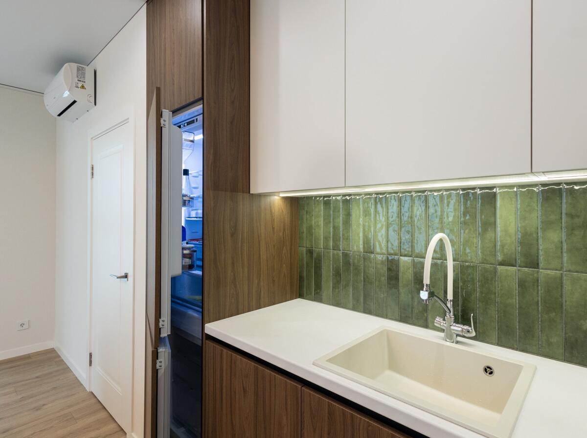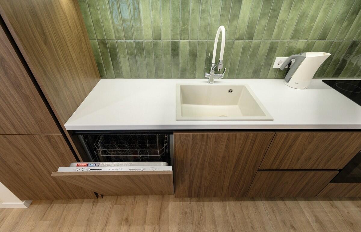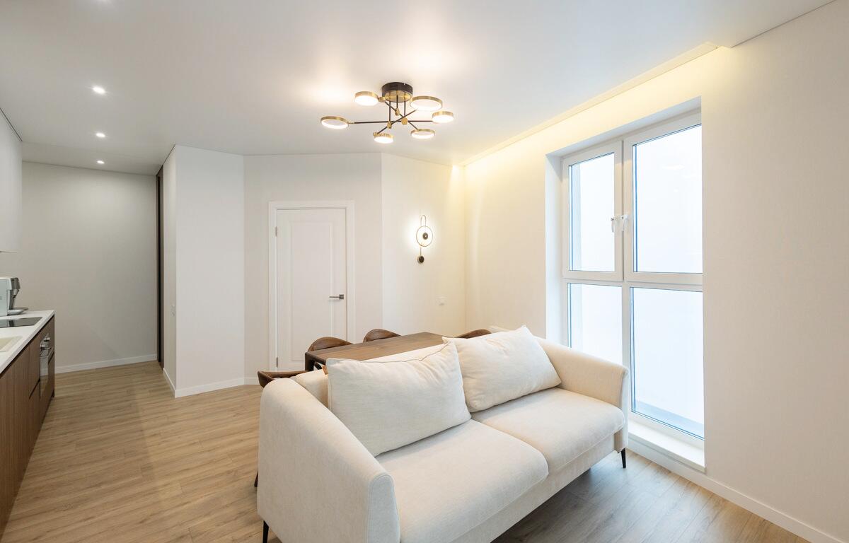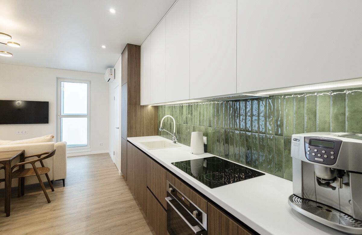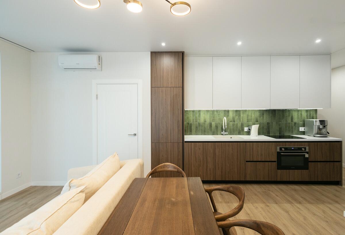 В квартире просторная гостиная с кухонным оборудованием, где может собираться вся семья для совместного отдыха. Кухня оборудована всей необходимой техникой.