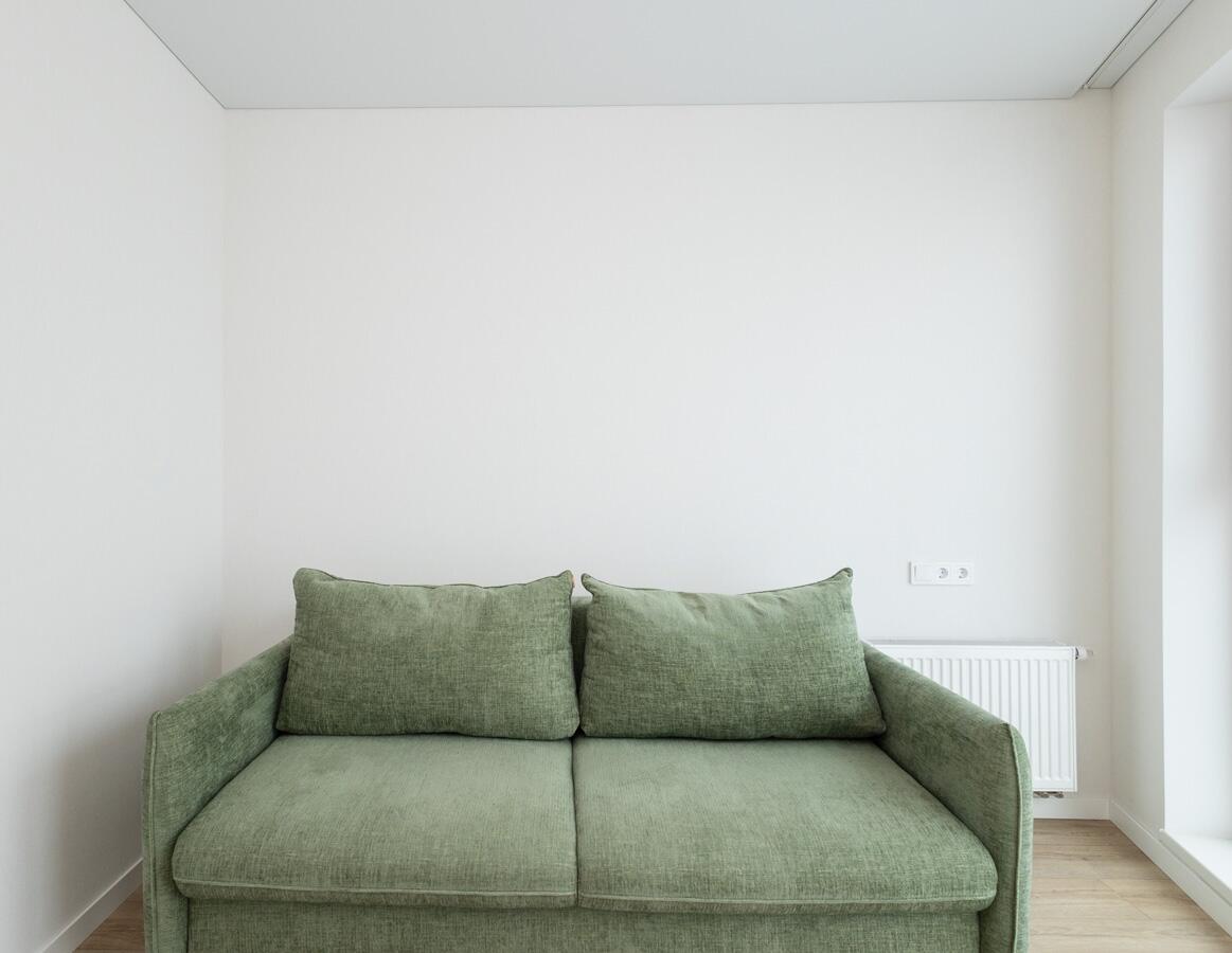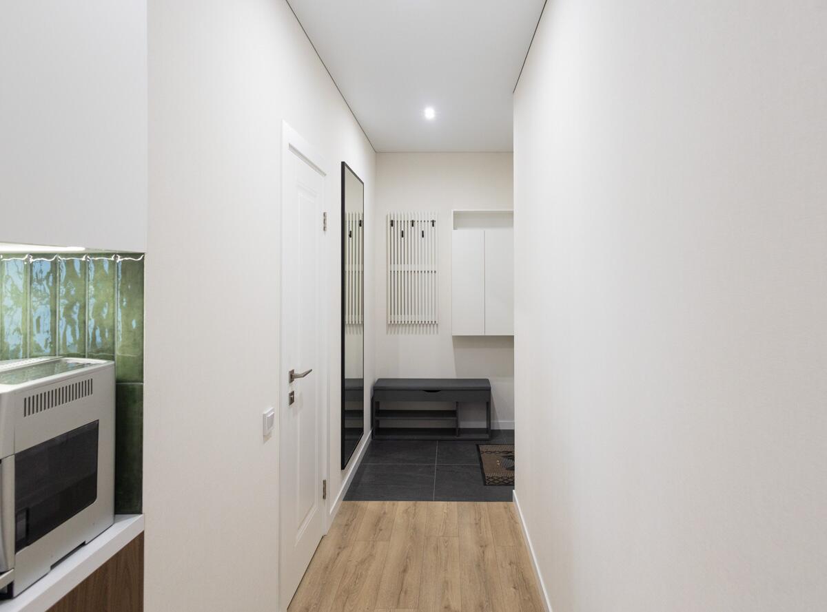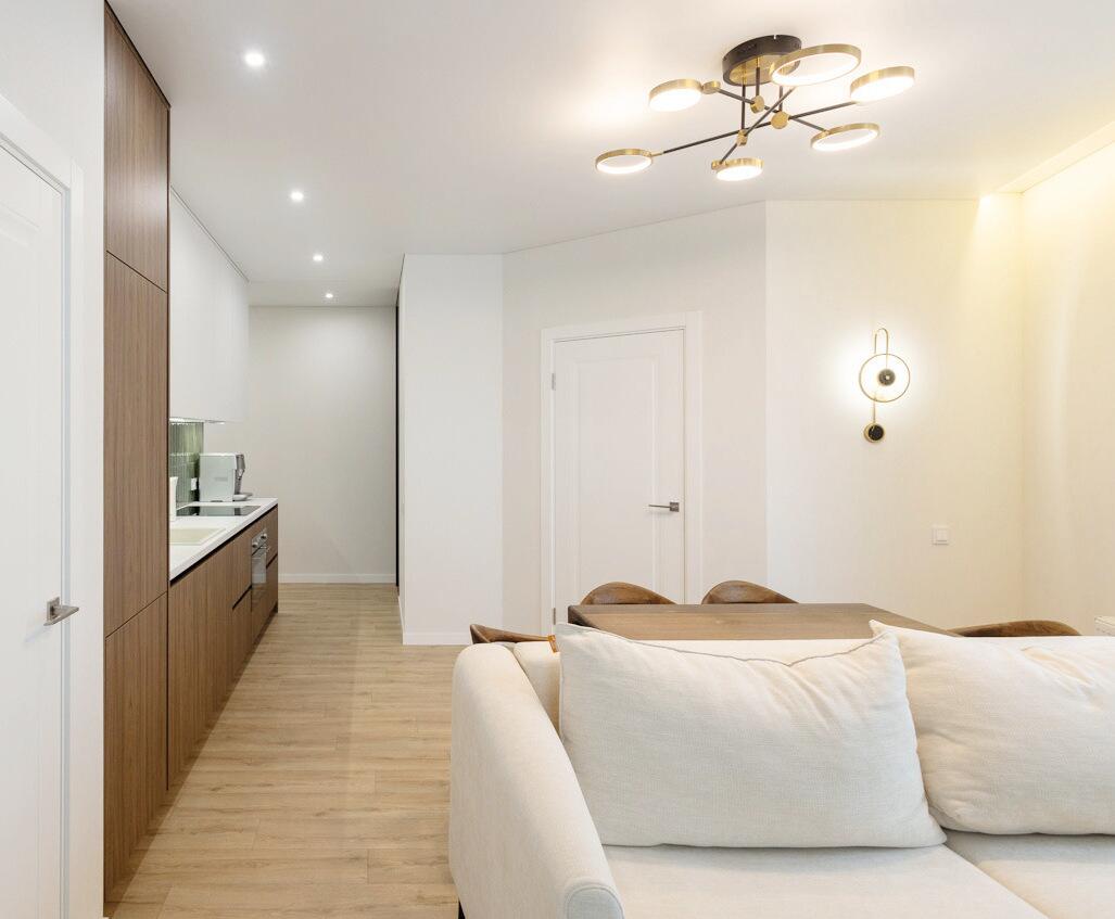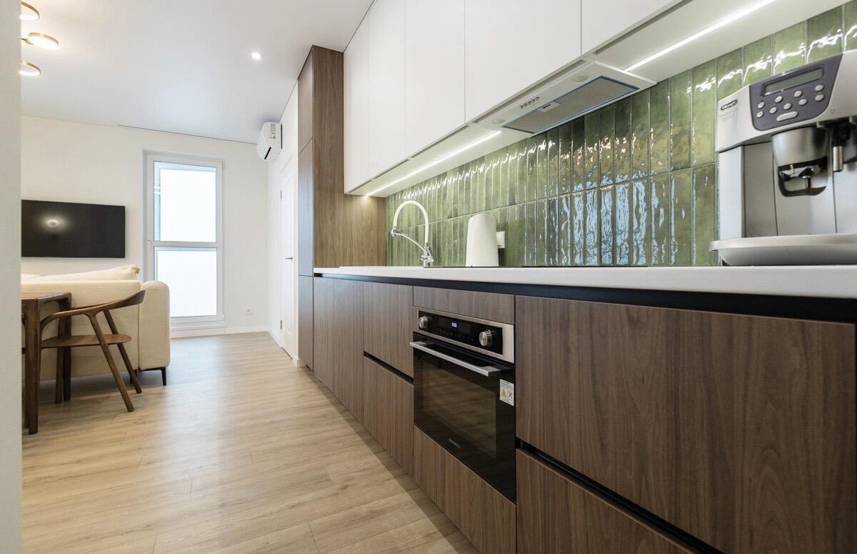 В квартире просторная гостиная с кухонным оборудованием, где может собираться вся семья для совместного отдыха. Кухня оборудована всей необходимой техникой.