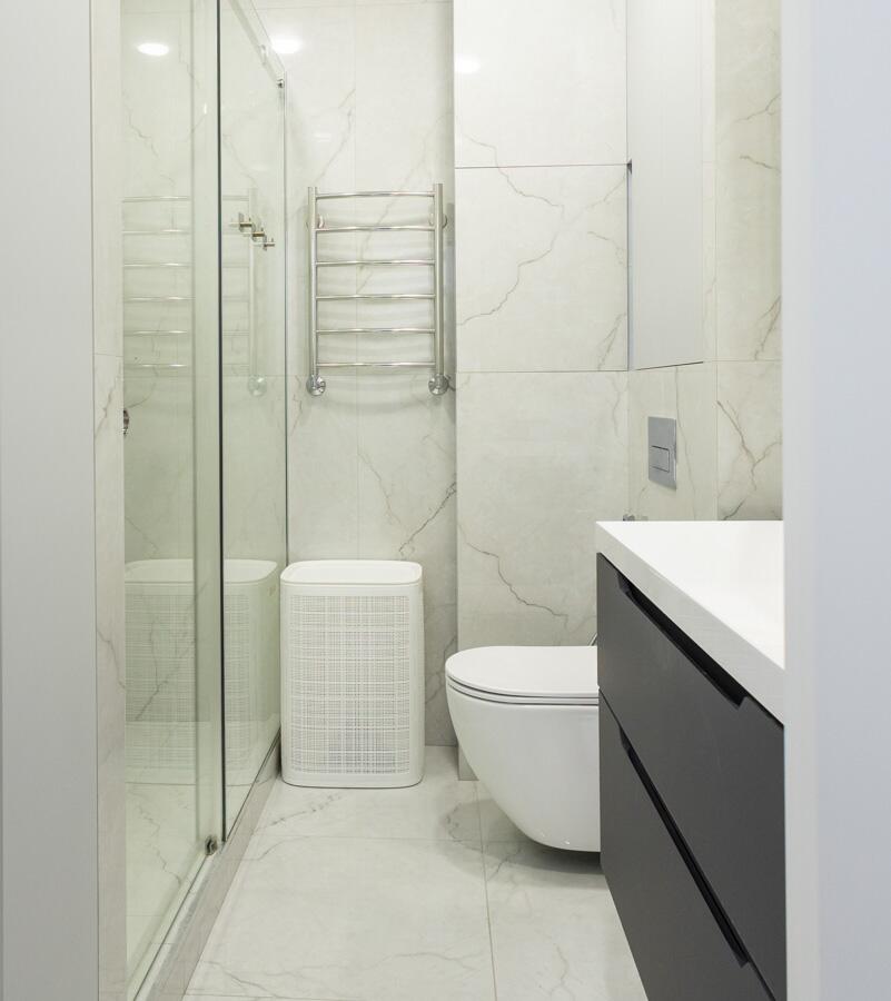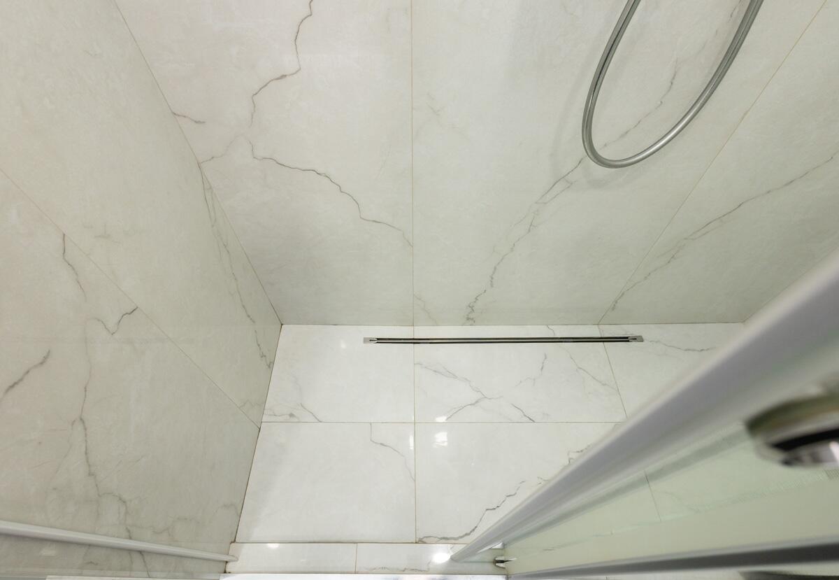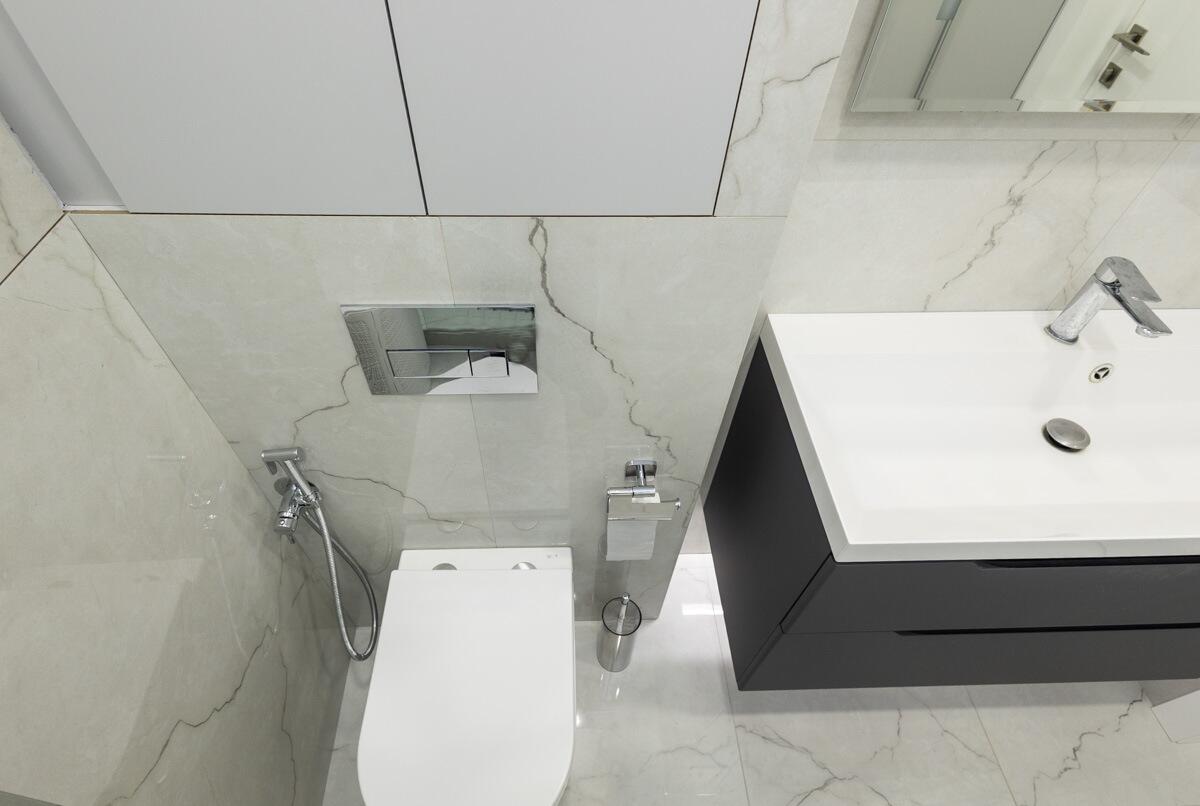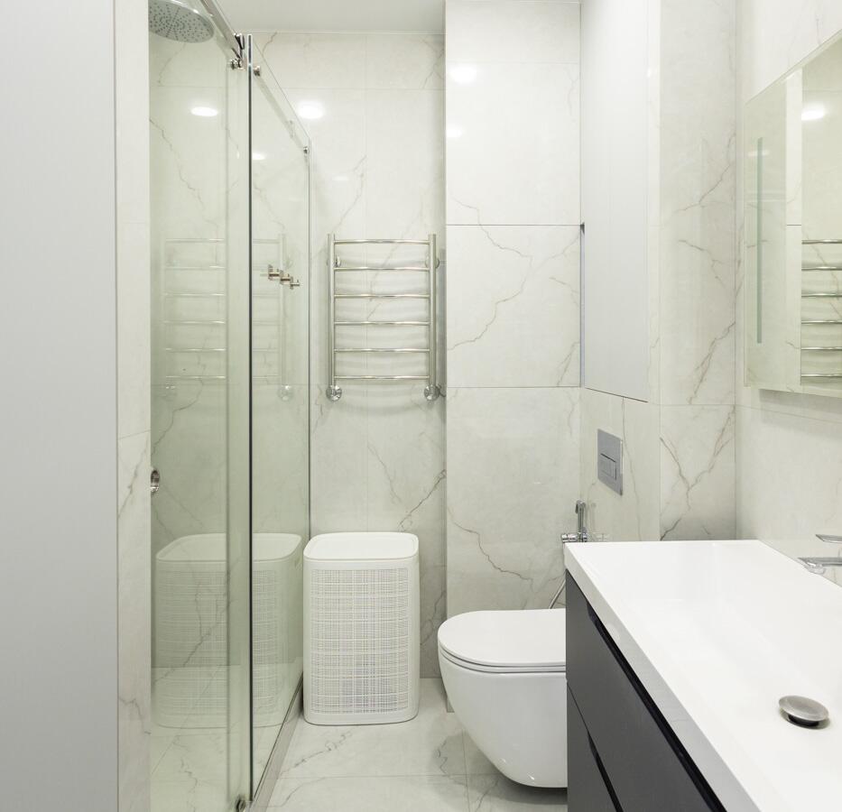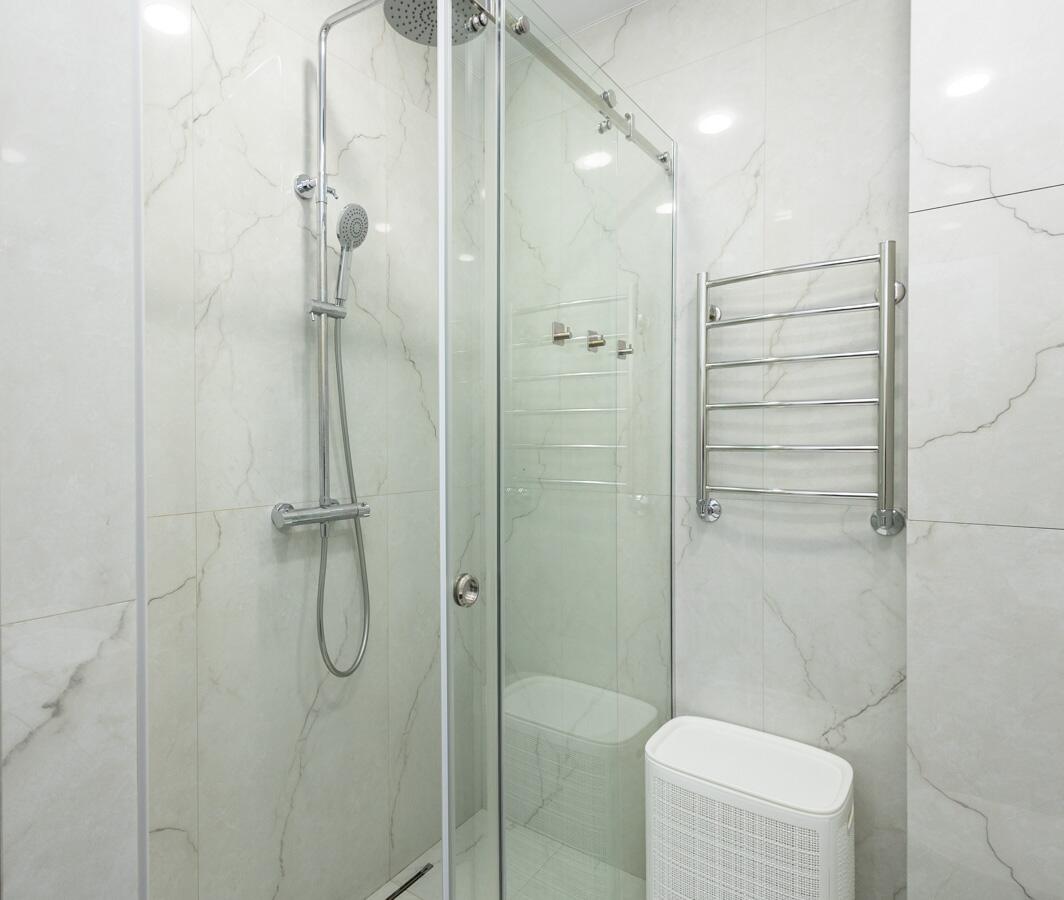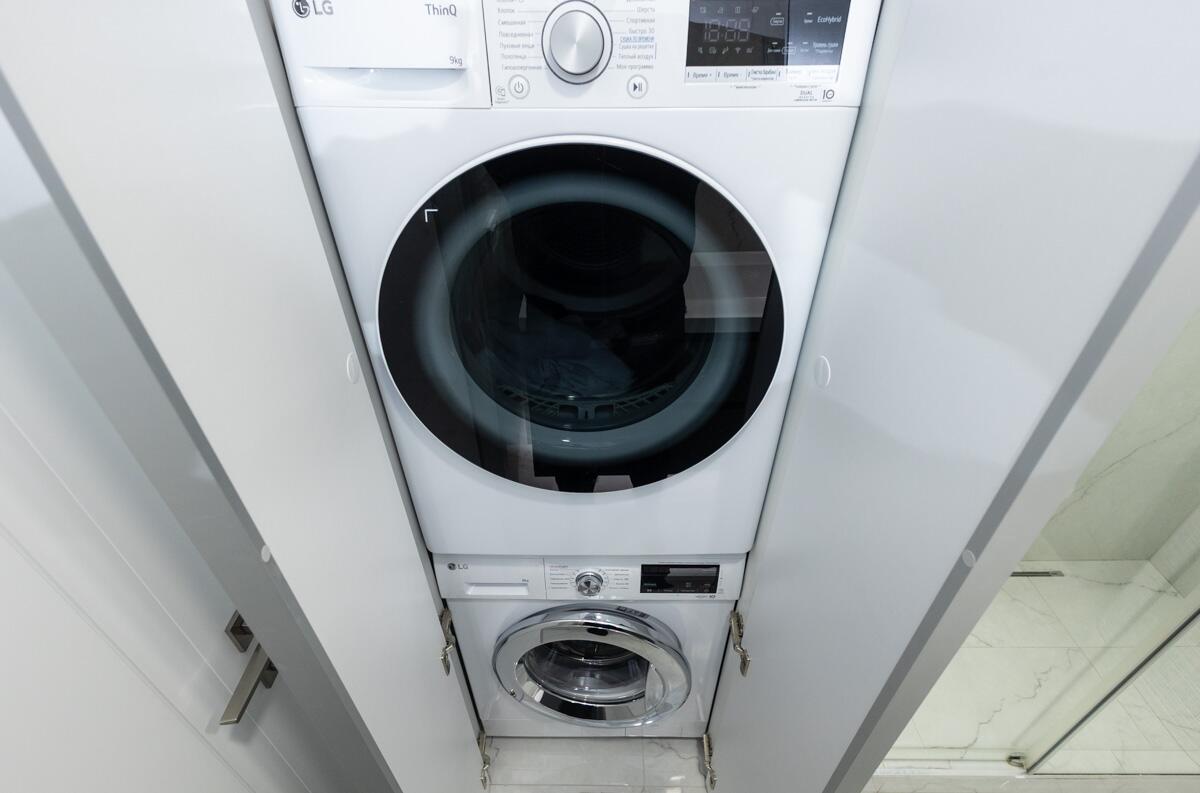 Совмещенный просторный санузел с большой душевой кабиной, стиральной и сушильной машиной.
