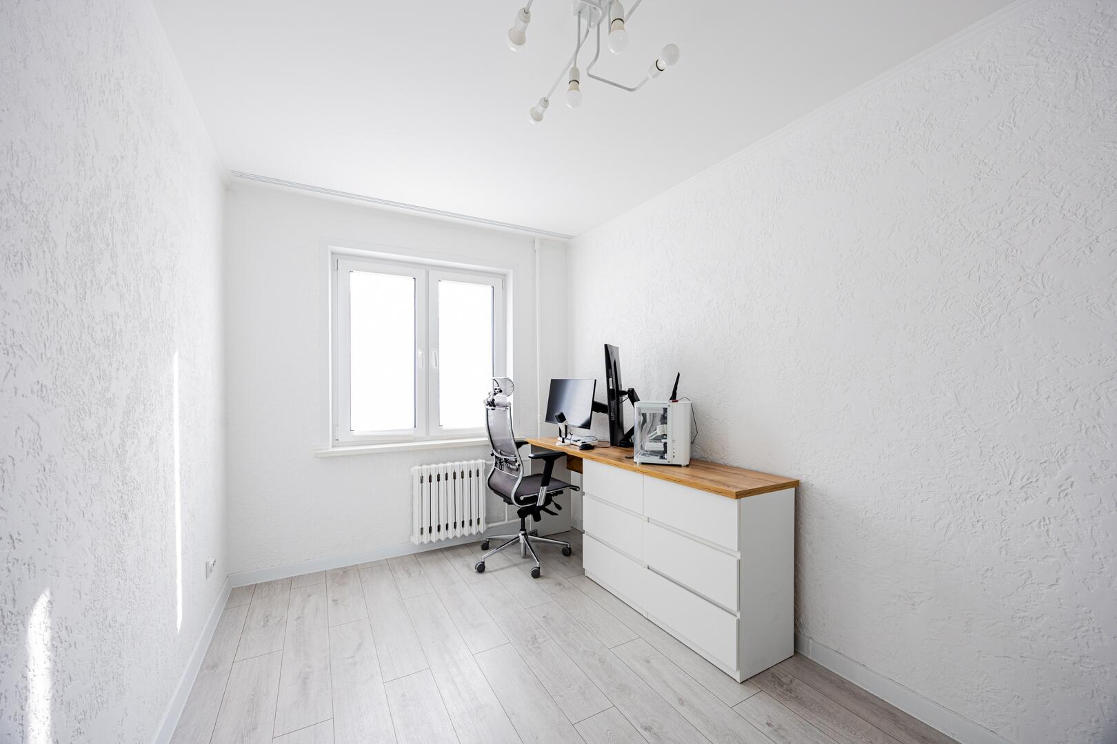 Ремонт выполнен основательно: новая стяжка по всей квартире (без порожков), заменена вся электрика и сантехника, выровненные и окрашенные потолки (не натяжные), декоративная штукатурка на стенах. Установлены новые окна, на кухне – с тонировкой. Москитные сетки во всех окнах.