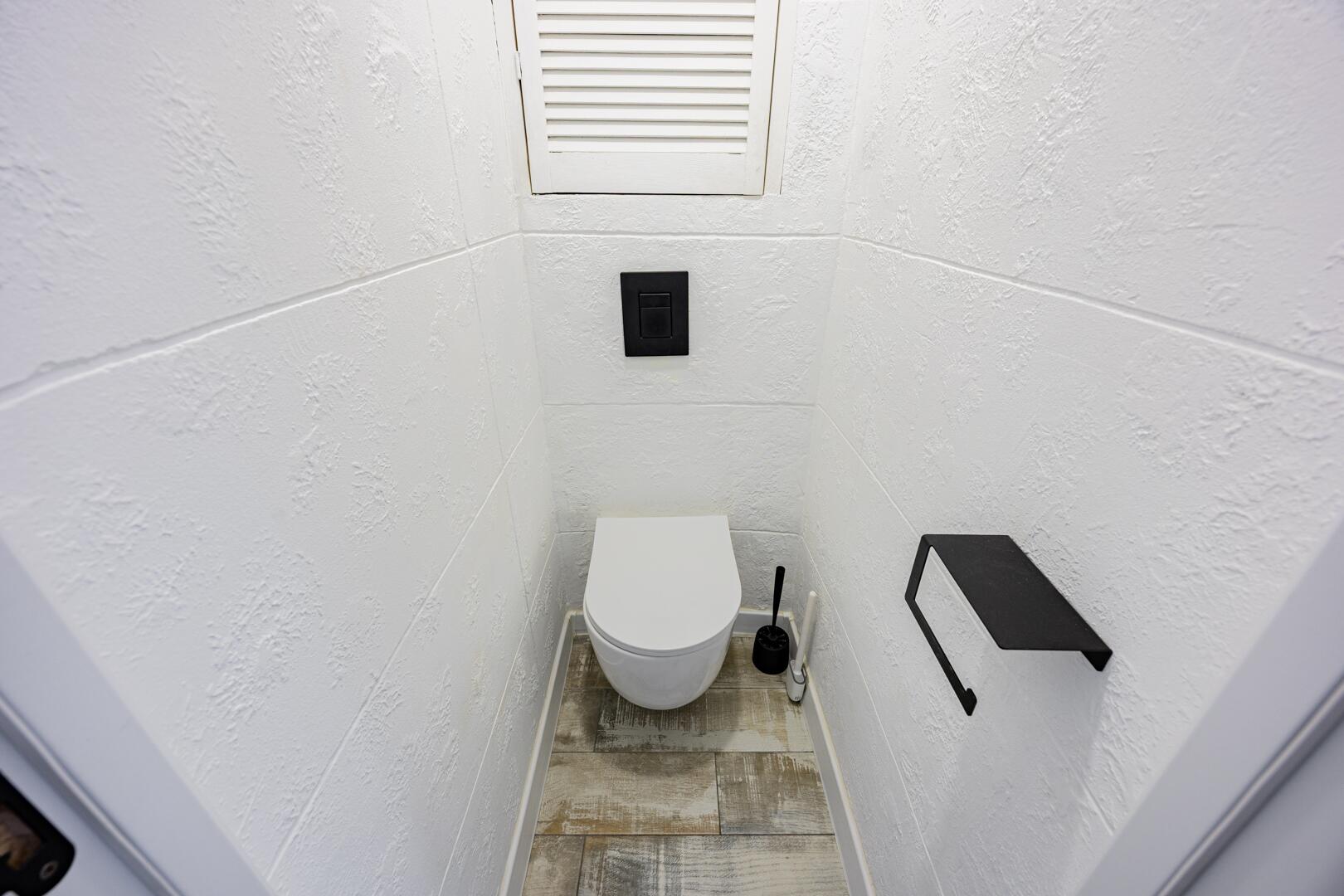 Санузел выполнен в декоративной штукатурке с покрытием эпоксидной смолой – современное влагостойкое решение.