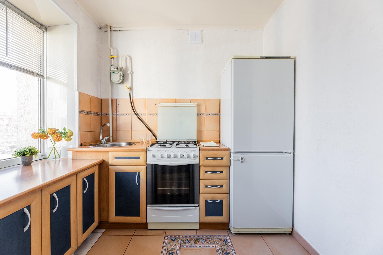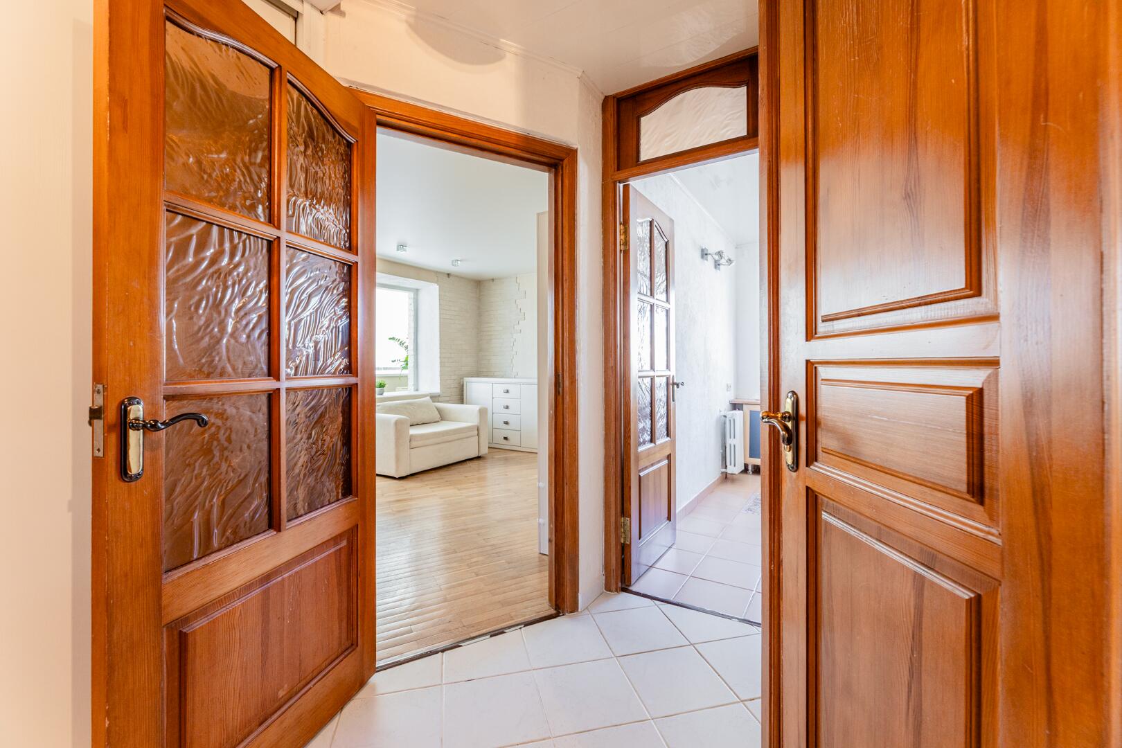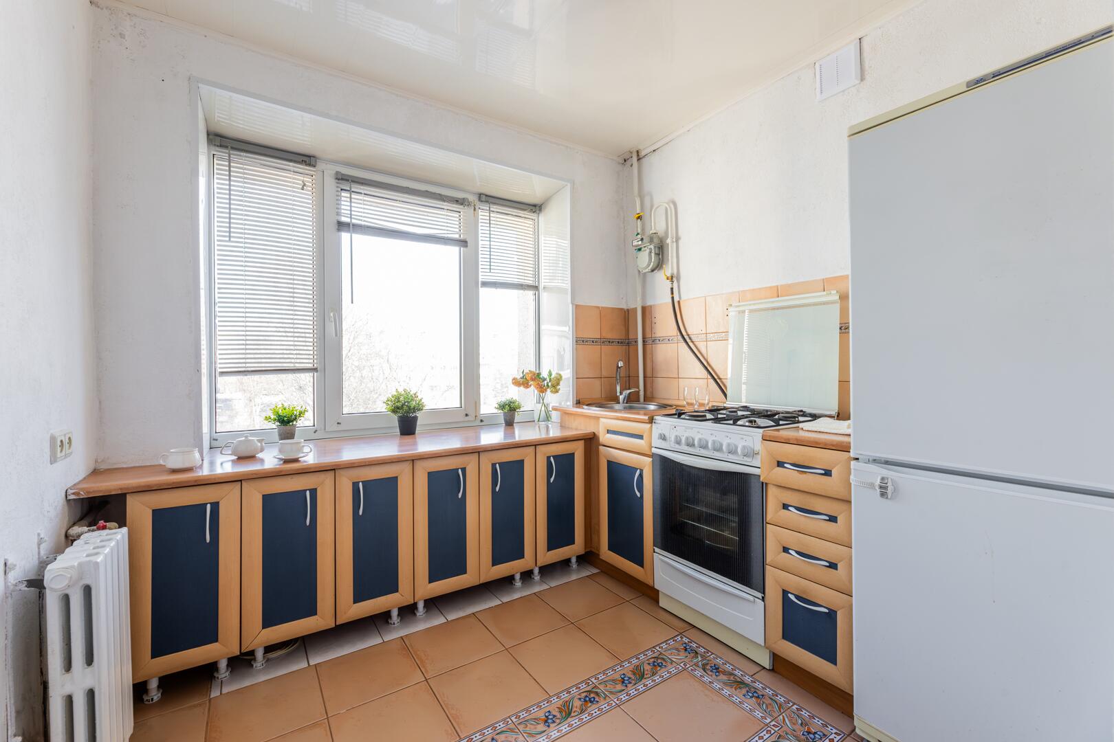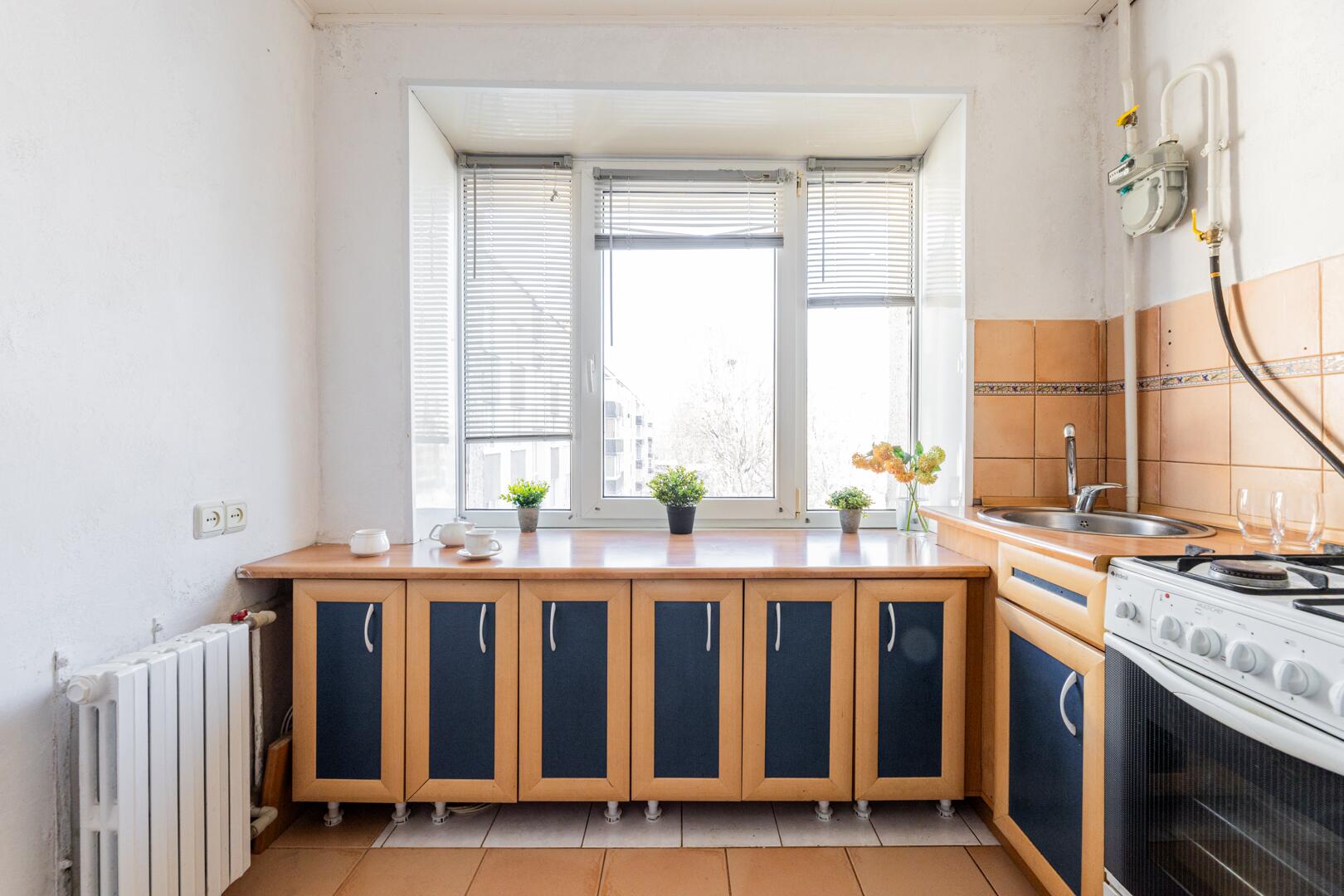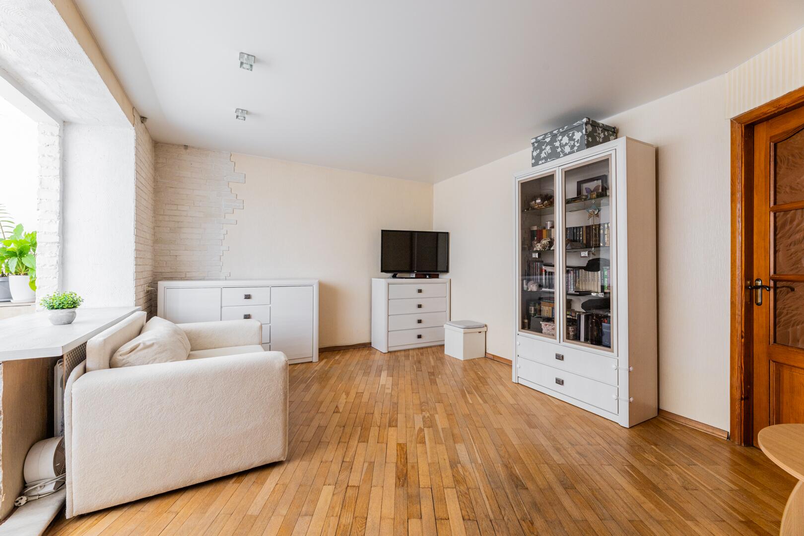 Толстые кирпичные стены надёжно сохраняют тепло, средний этаж, солнечная сторона. Из окна кухни вид во двор, а окна комнаты смотрят на парковую зону.