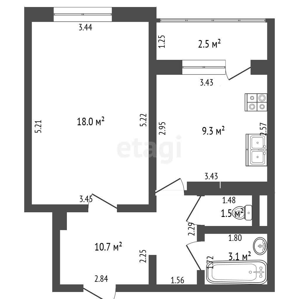 - отдельная кухня 9,3 кв.м.;