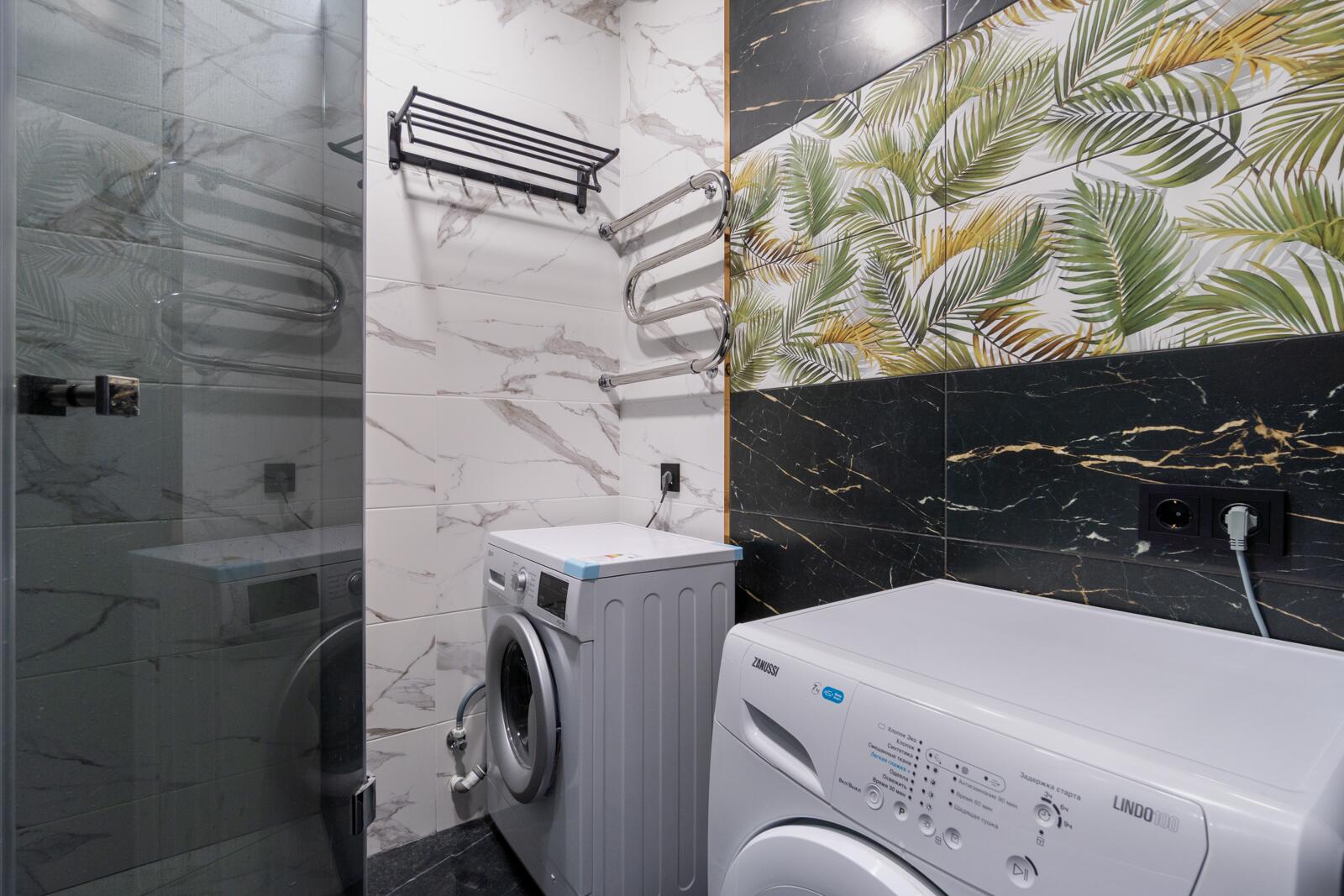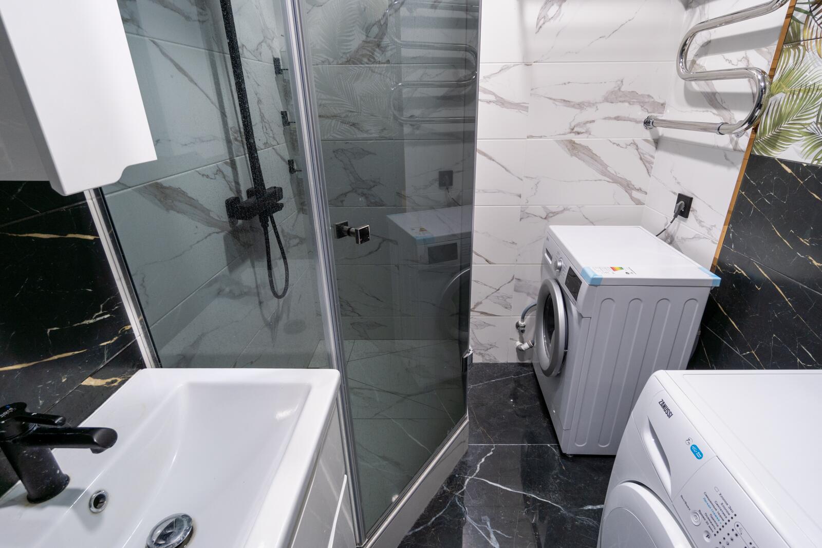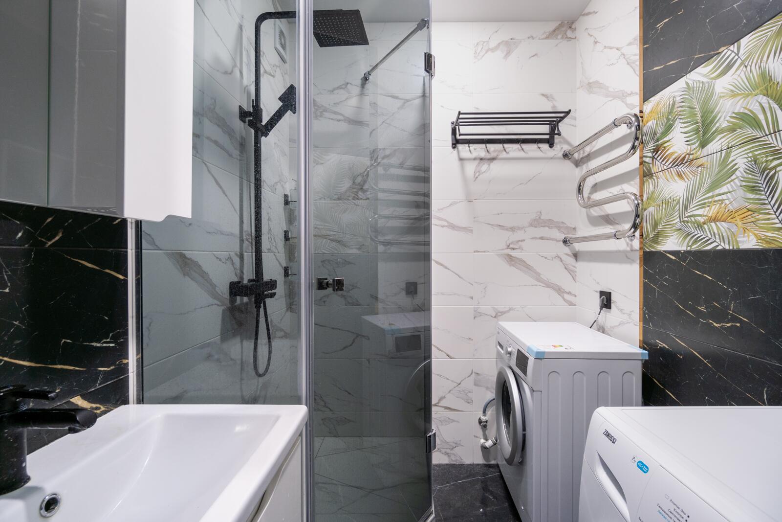 Хочется отдельно выделить душевую, так как она выполнялась по индивидуальному проекту, установлено закаленное стекло и удобная система тропического душа.