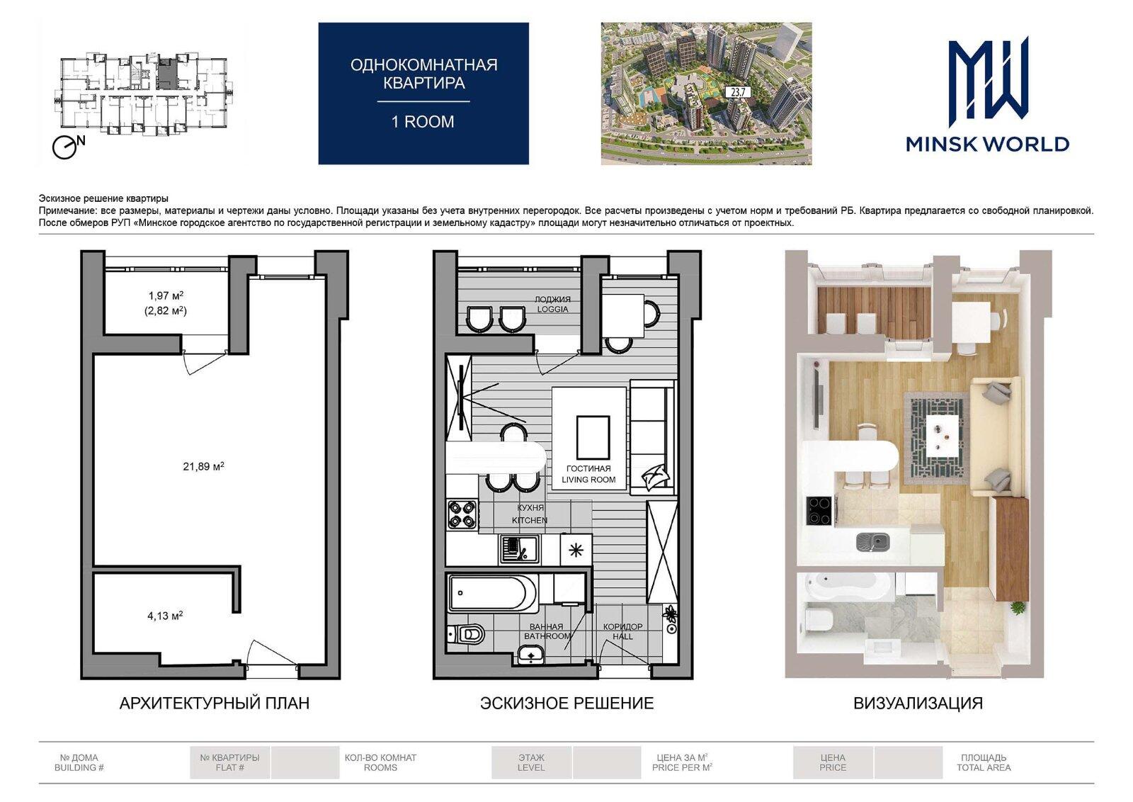 Продается светлая и просторная квартира в современном и перспективном районе г. Минска, площадь – общая 23,86; жилая 21,89; СНБ 27,99 (кв.м)