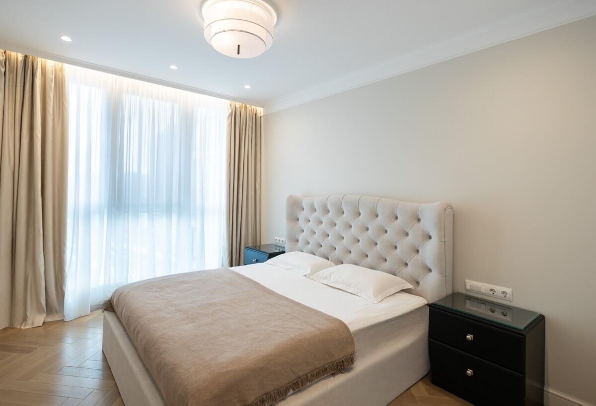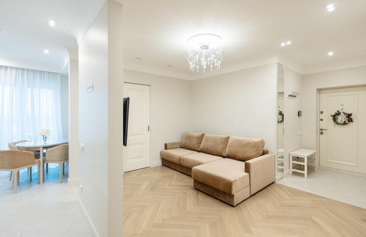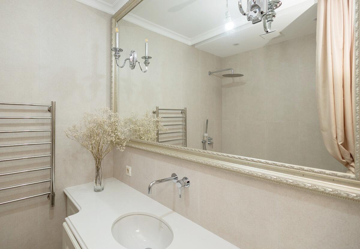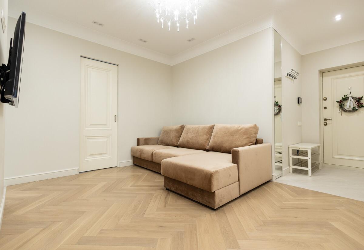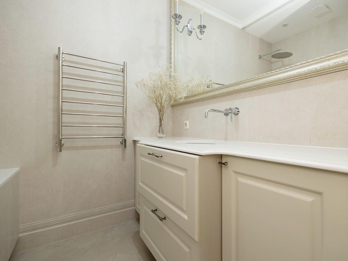 Потолки и стены окрашены, в гостиной и спальнях на полу паркет Tarwood, в кухне полы из плитки с подогревом. Современная техника: встроенный духовой шкаф, индукционная панель, стиральная и сушильная машины Electrolux (производства Италия). Кухонный фартук из испанского керамогранита под оникс KERAMA MARAZZI, столешница из кварцевого агломерата. Лоджия из кухни. Санузел раздельный с ванной Villeroy & Boch, со встроенным биде Boheme. Мебель на заказ из надёжных качественных материалов, кровати с подъёмными механизмами и нишами для хранения. Встроенный зеркальный шкаф в прихожей и большой гардероб в спальне, вместят все ваши вещи.