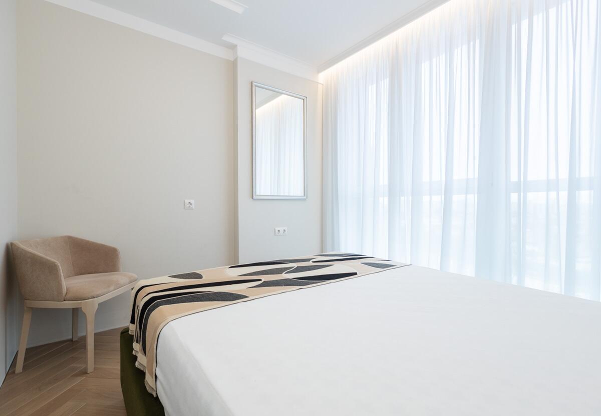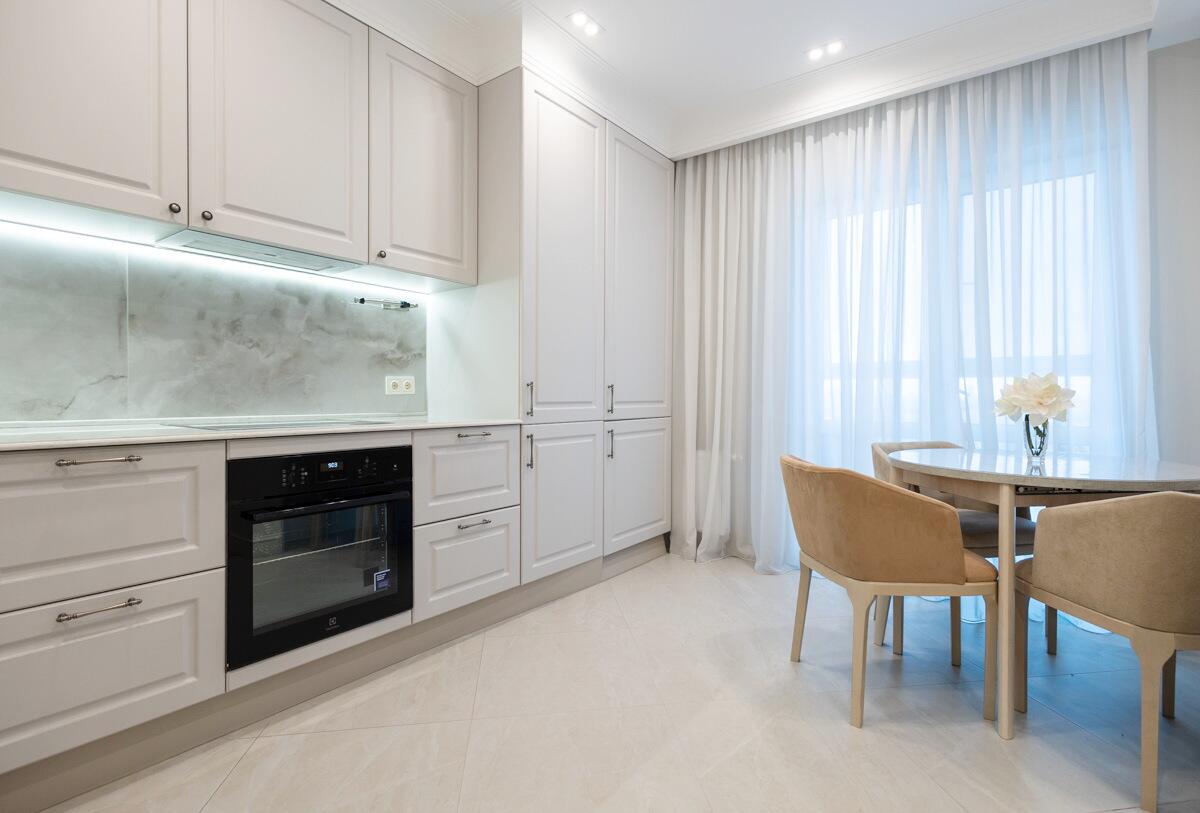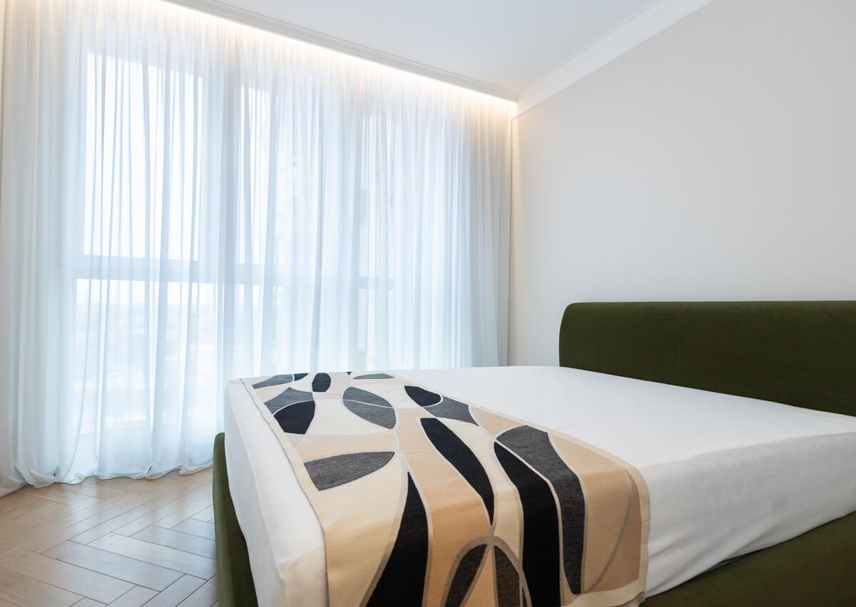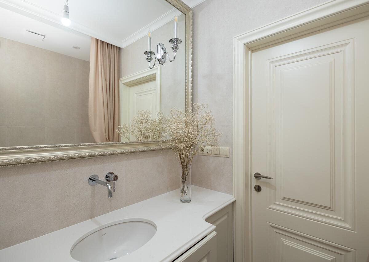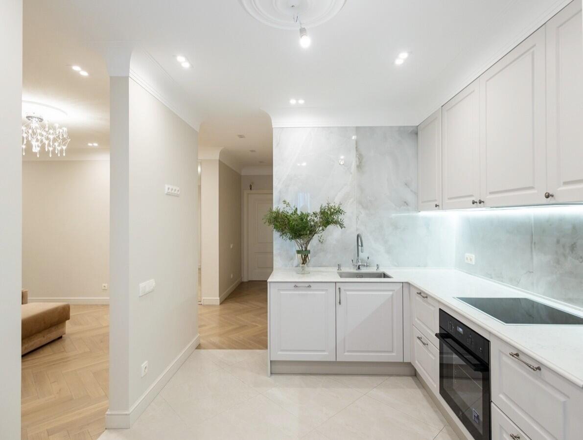 Потолки и стены окрашены, в гостиной и спальнях на полу паркет Tarwood, в кухне полы из плитки с подогревом. Современная техника: встроенный духовой шкаф, индукционная панель, стиральная и сушильная машины Electrolux (производства Италия). Кухонный фартук из испанского керамогранита под оникс KERAMA MARAZZI, столешница из кварцевого агломерата. Лоджия из кухни. Санузел раздельный с ванной Villeroy & Boch, со встроенным биде Boheme. Мебель на заказ из надёжных качественных материалов, кровати с подъёмными механизмами и нишами для хранения. Встроенный зеркальный шкаф в прихожей и большой гардероб в спальне, вместят все ваши вещи.