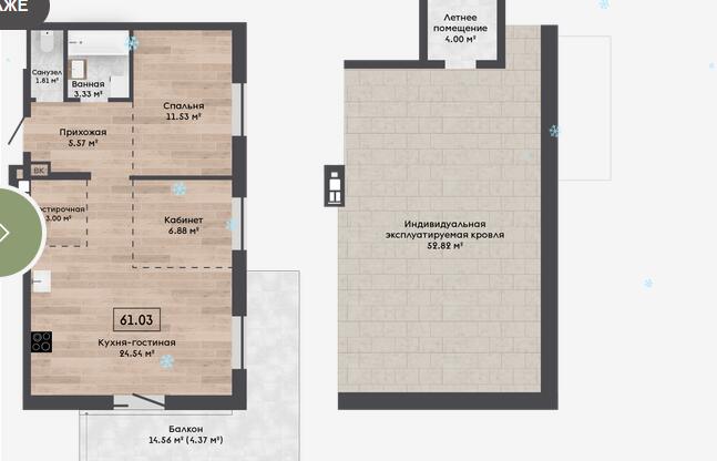 Квартира с террасой на крыше - 52,82м2.