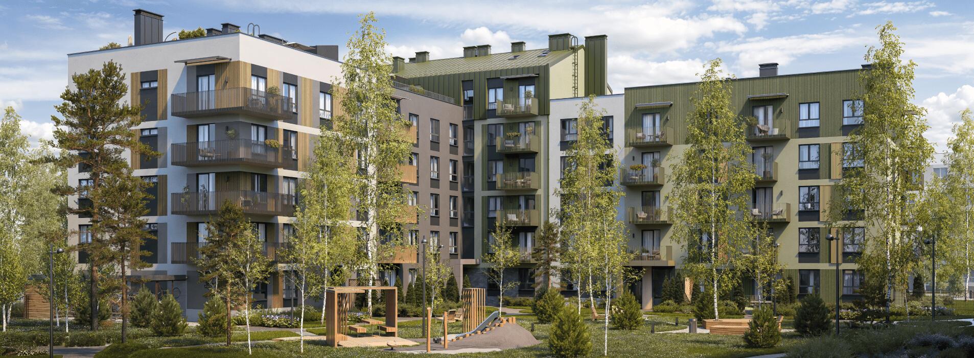С двух сторон обрамлен зеленым коридором, обеспечивая жителям живописные виды из окон.