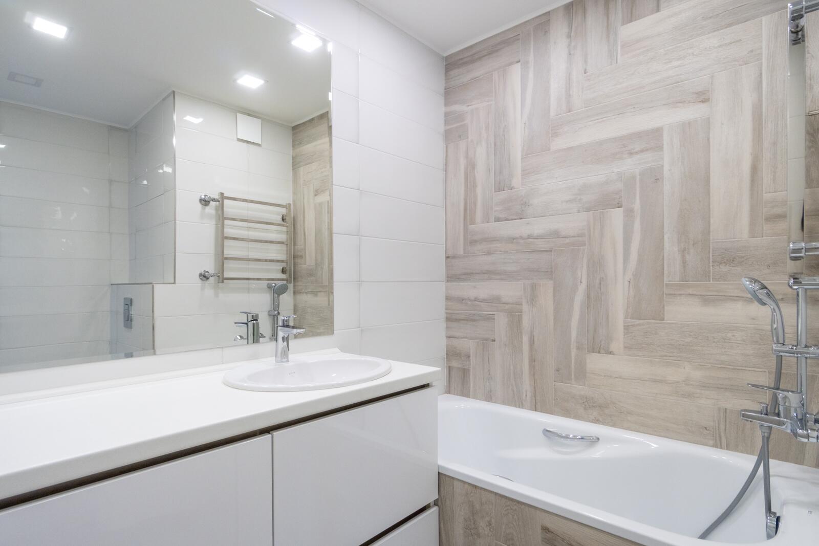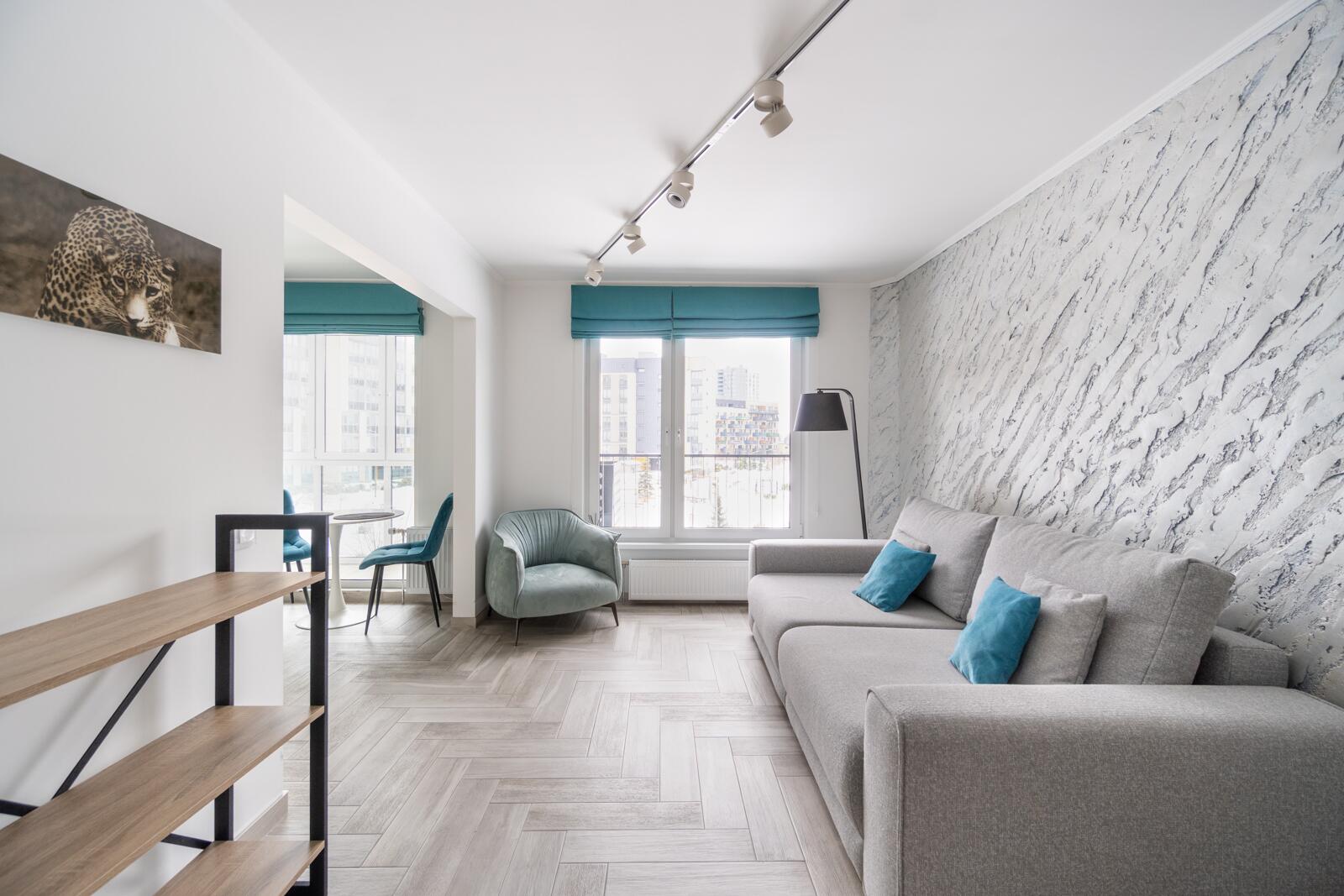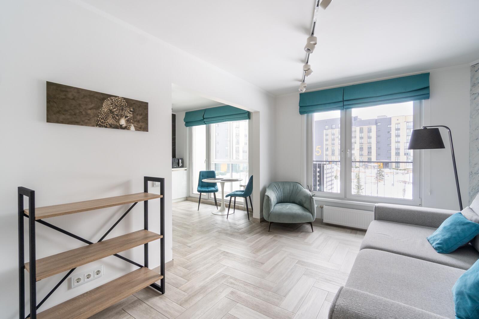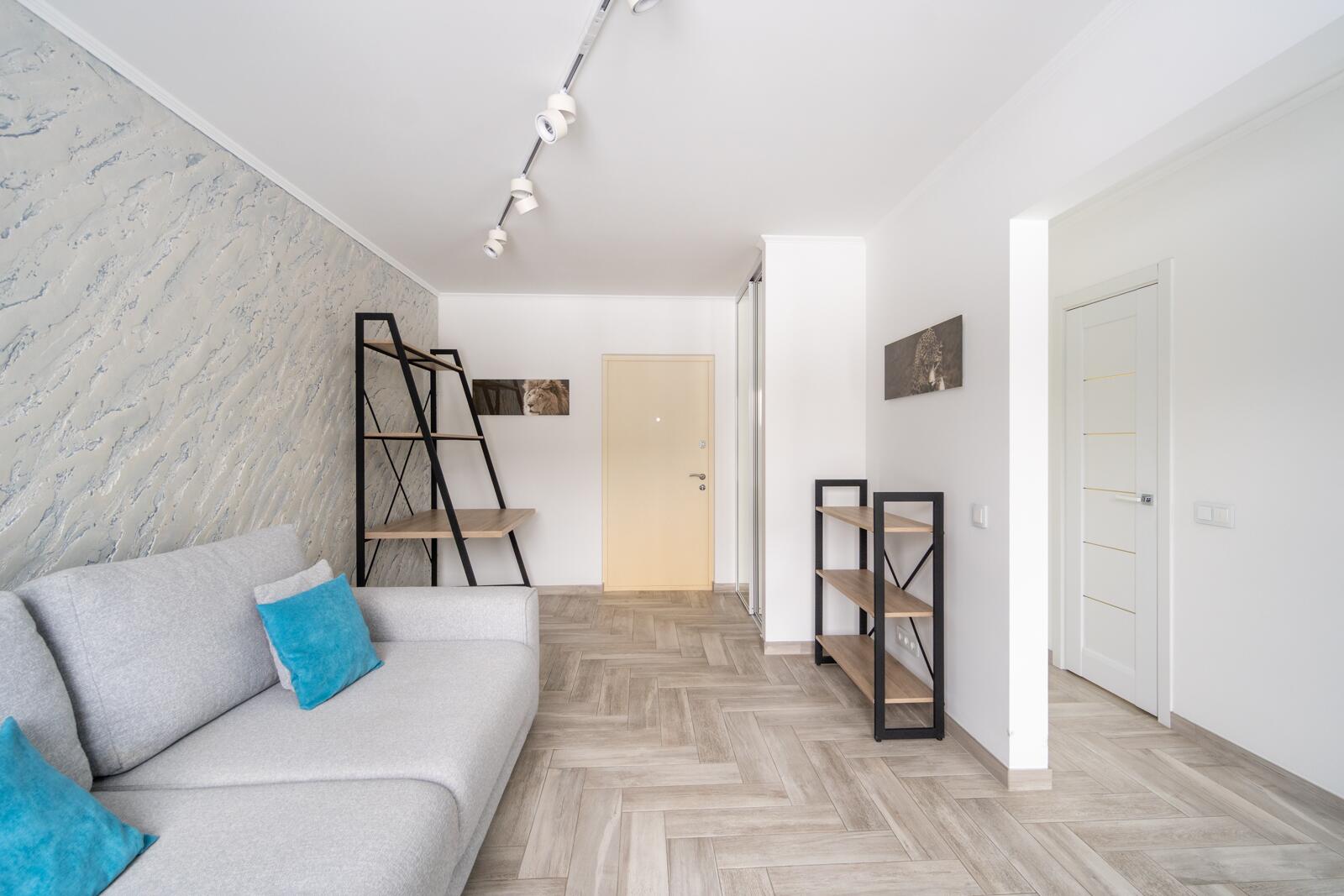 Стены выровнены «в ноль», частично окрашены, частично декоративная штукатурка. Потолки ровные, светлые, трековое освещение — можно менять сценарии света. Испанская плитка, тёплый пол на кухне и в санузле. Металлическая входная дверь, проведено оптоволокно. Санузел — настоящая премиальная зона: