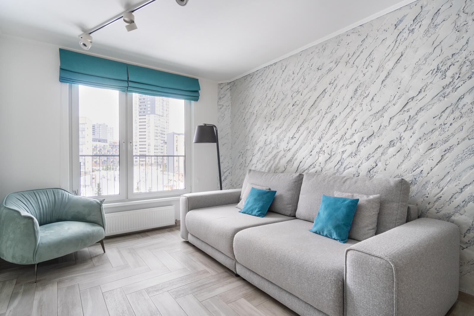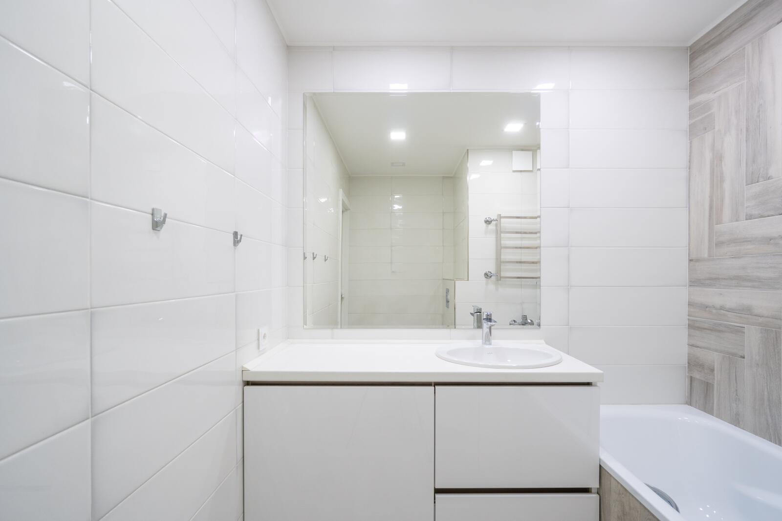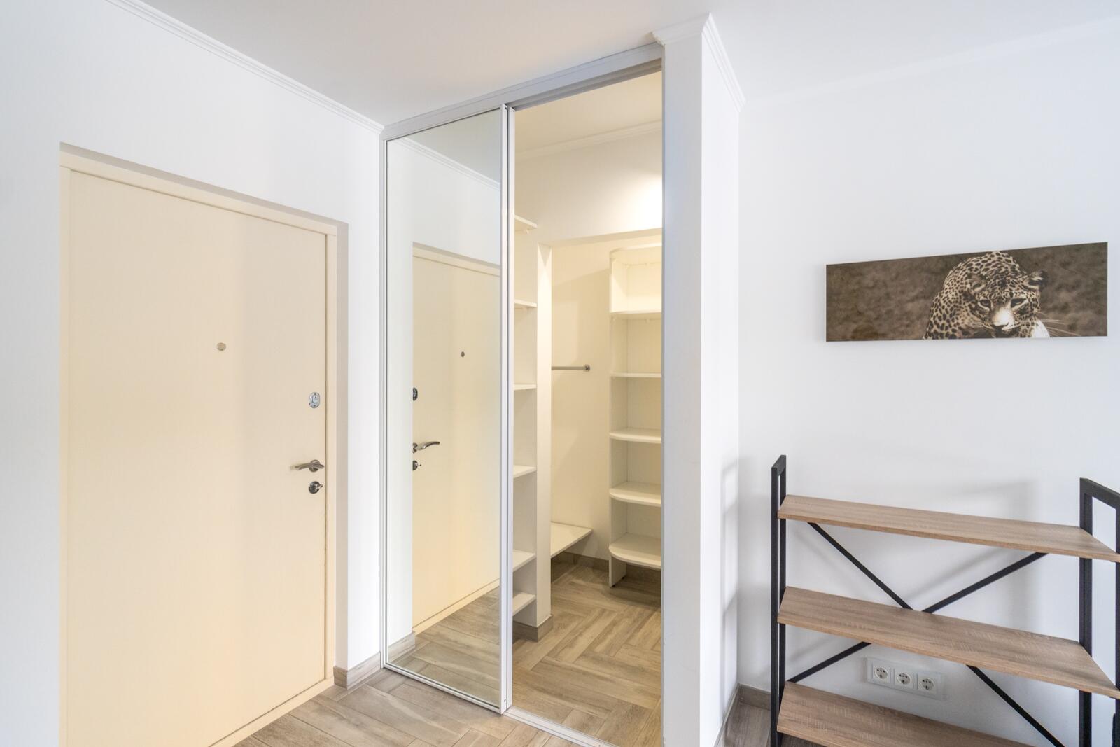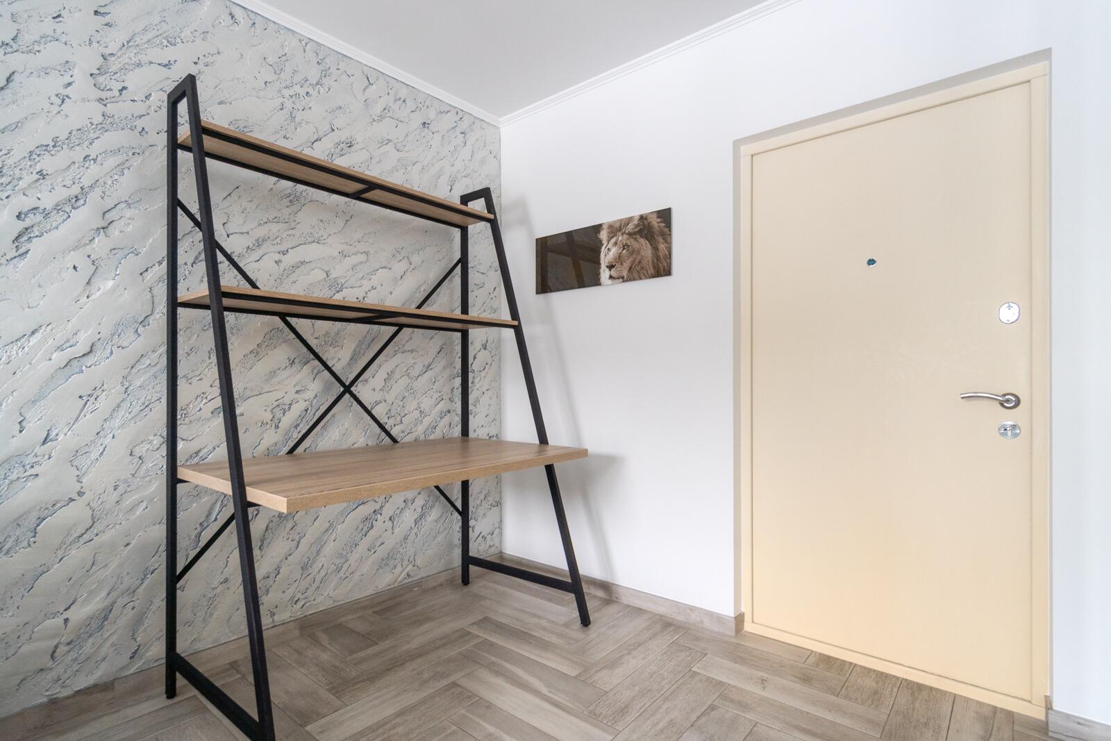 Стены выровнены «в ноль», частично окрашены, частично декоративная штукатурка. Потолки ровные, светлые, трековое освещение — можно менять сценарии света. Испанская плитка, тёплый пол на кухне и в санузле. Металлическая входная дверь, проведено оптоволокно. Санузел — настоящая премиальная зона: