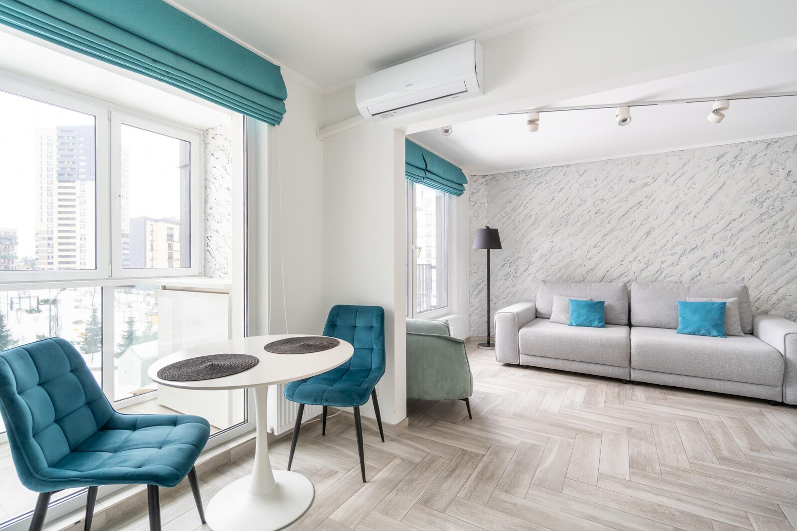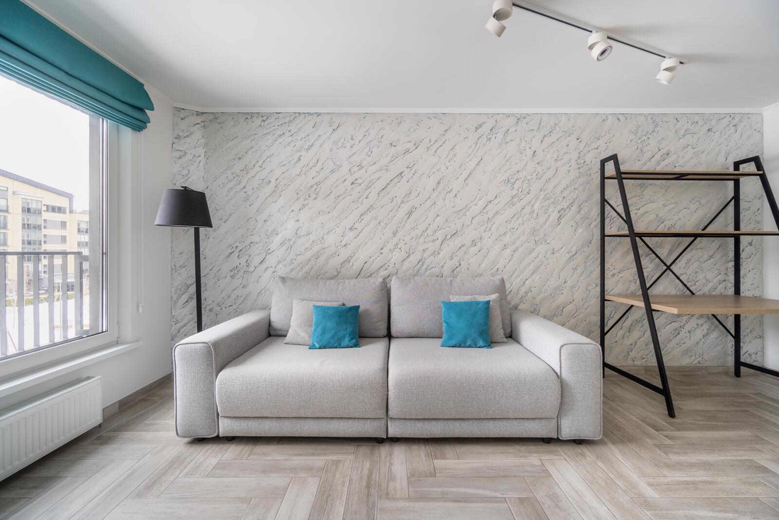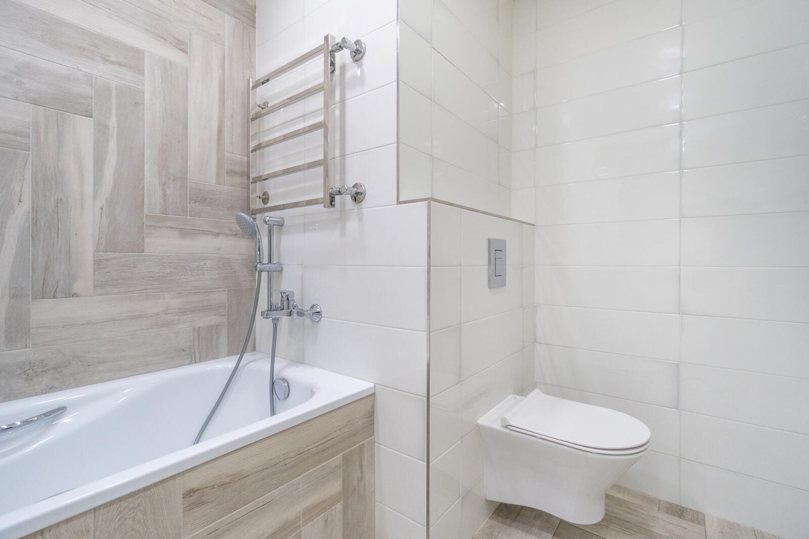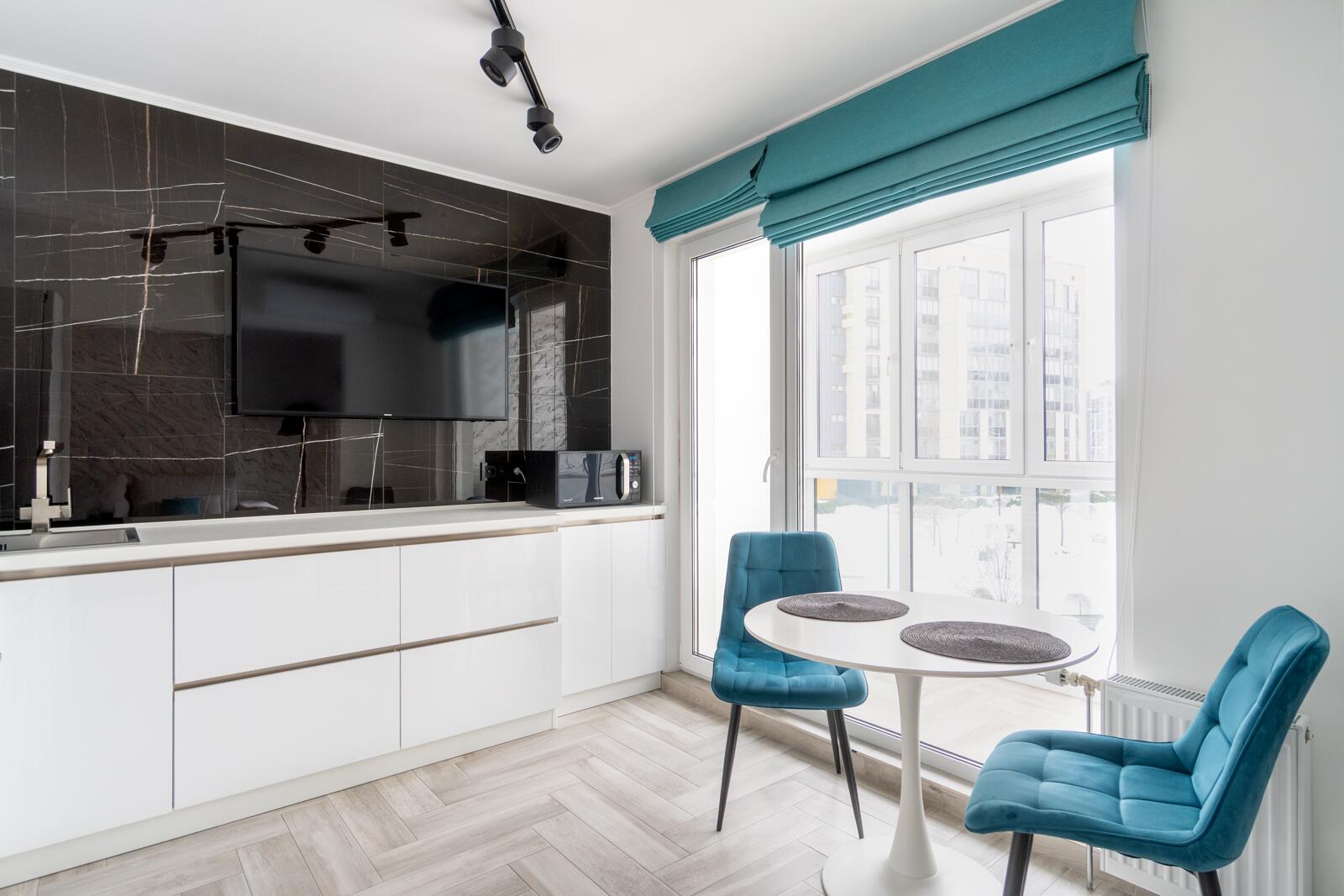 Стены выровнены «в ноль», частично окрашены, частично декоративная штукатурка. Потолки ровные, светлые, трековое освещение — можно менять сценарии света. Испанская плитка, тёплый пол на кухне и в санузле. Металлическая входная дверь, проведено оптоволокно. Санузел — настоящая премиальная зона: