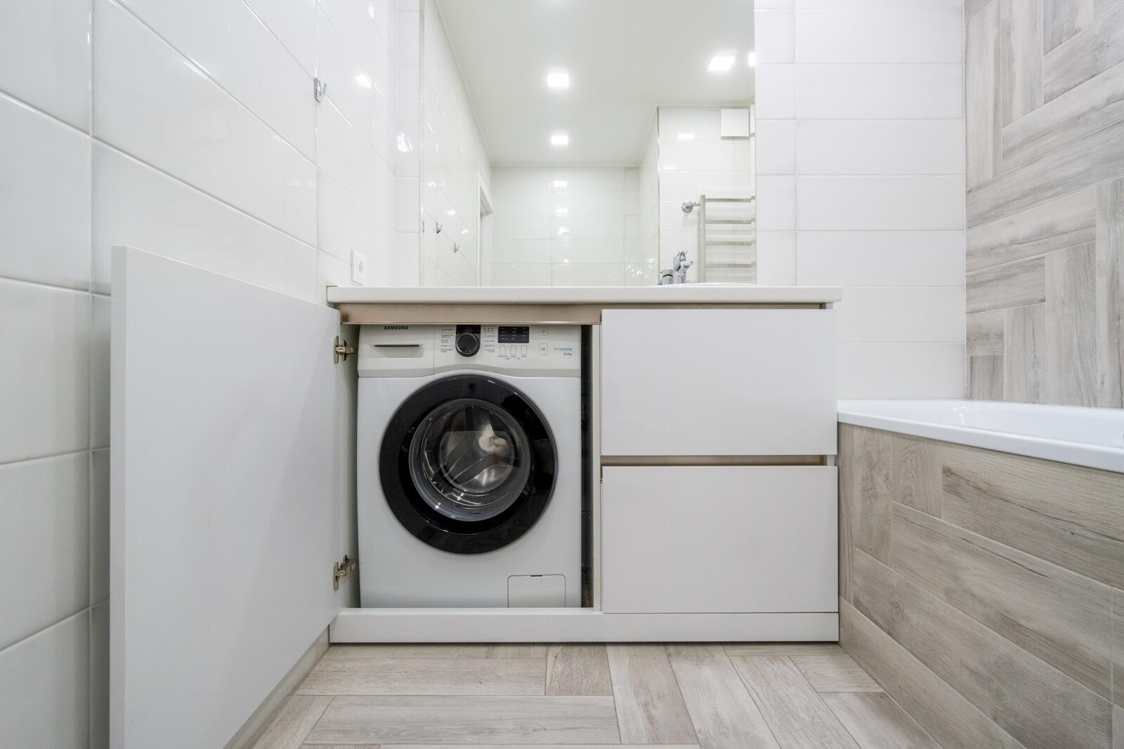 ванна Roca, подвесной унитаз и смесители Grohe; встроенная тумба со стиральной машиной; продуманные системы хранения; плитка из салона «Сквирел». Полноценный гардероб со штангами и полками — редкость для квартир такого формата.