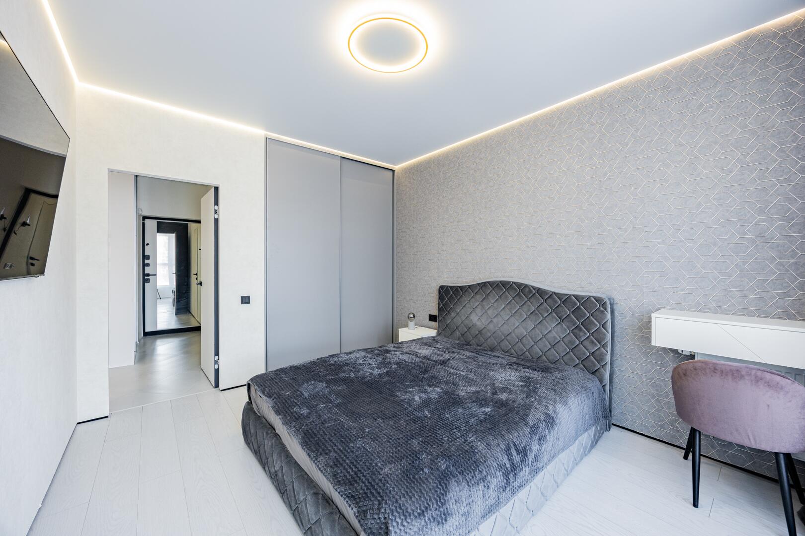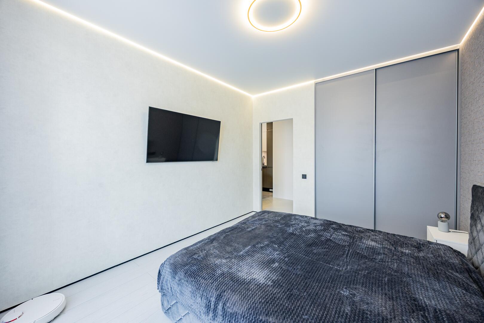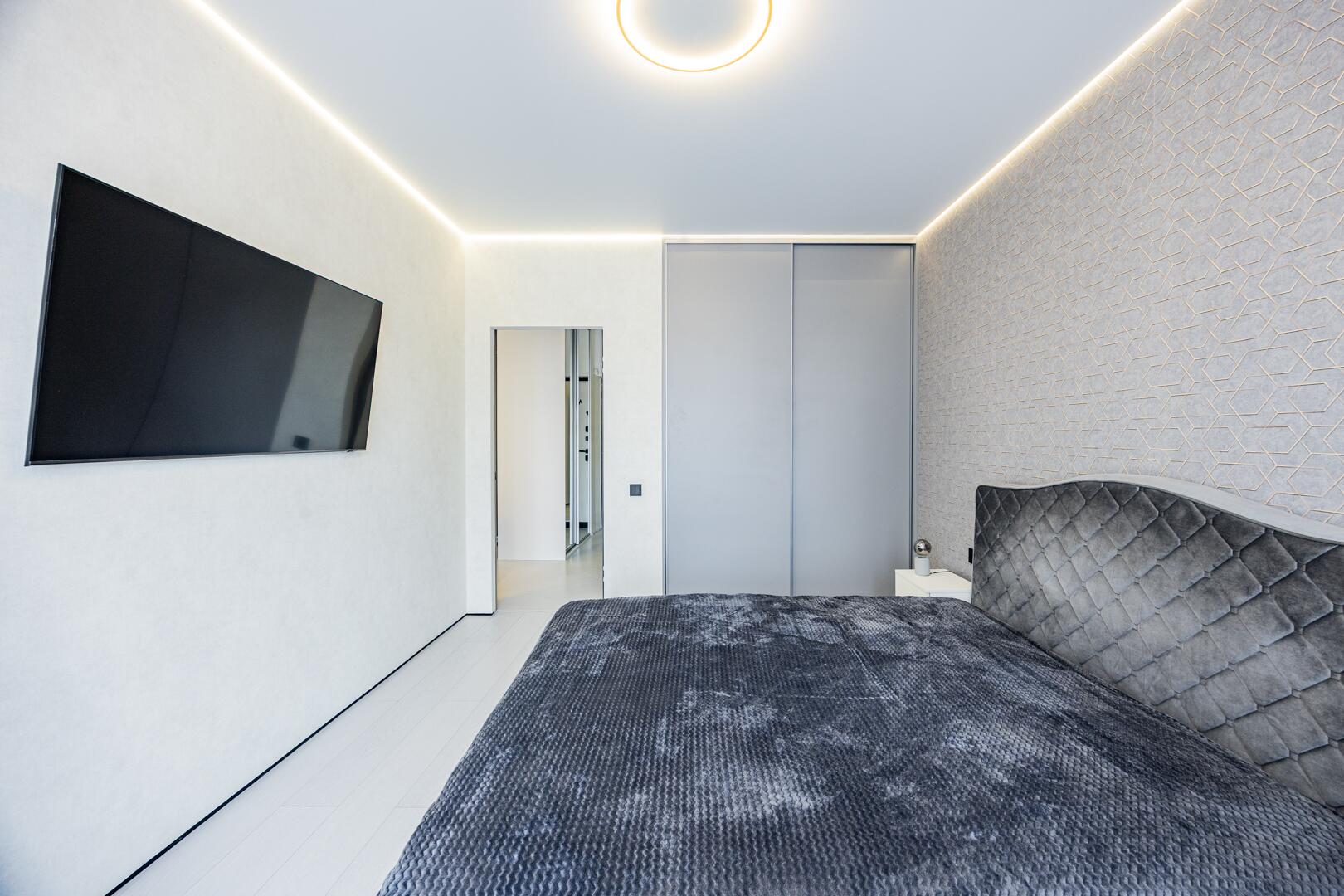 На полу испанская плитка, полы с подогревом. Все стены выровнены и окрашены декоративной краской, потолки с теневым профилем, оригинальные осветительные приборы, межкомнатные двери скрытого монтажа.