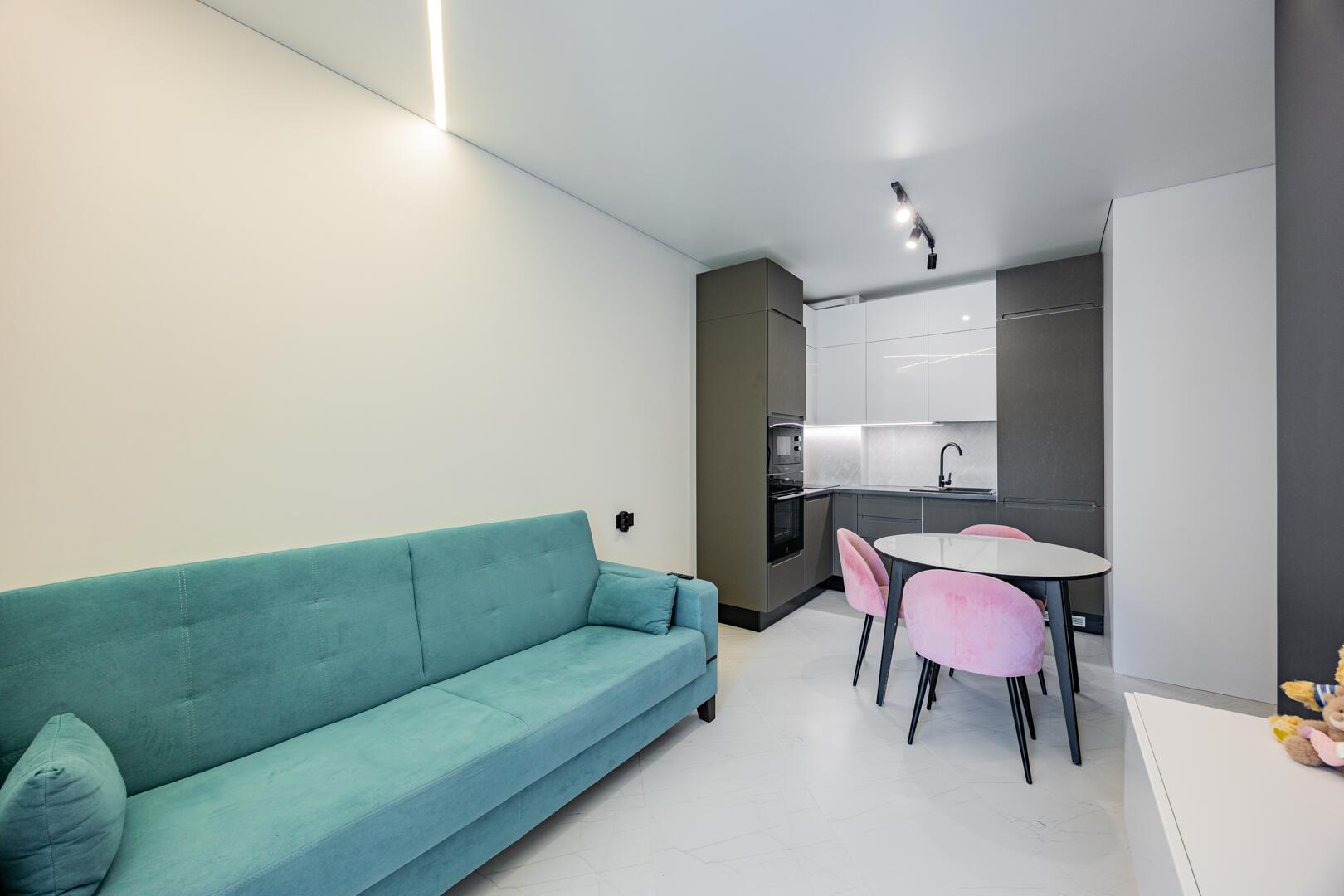 В кухне-гостиной комфортный диван, кухонный стол с раскладной системой.