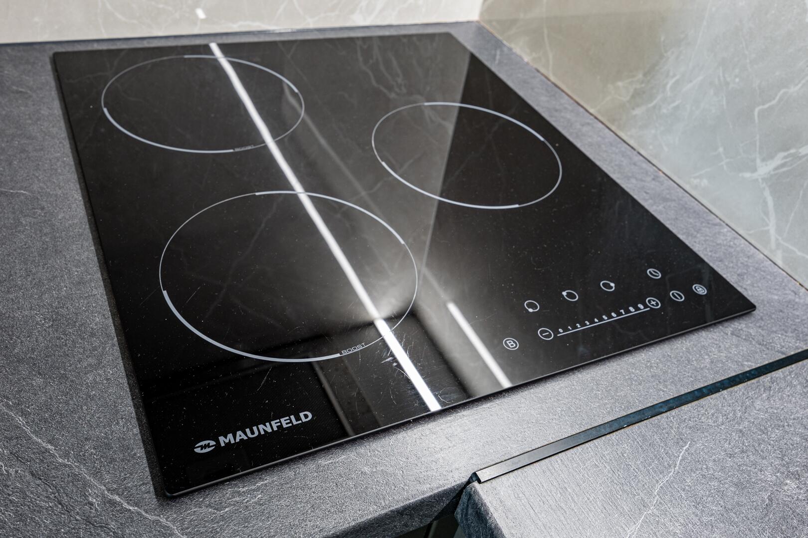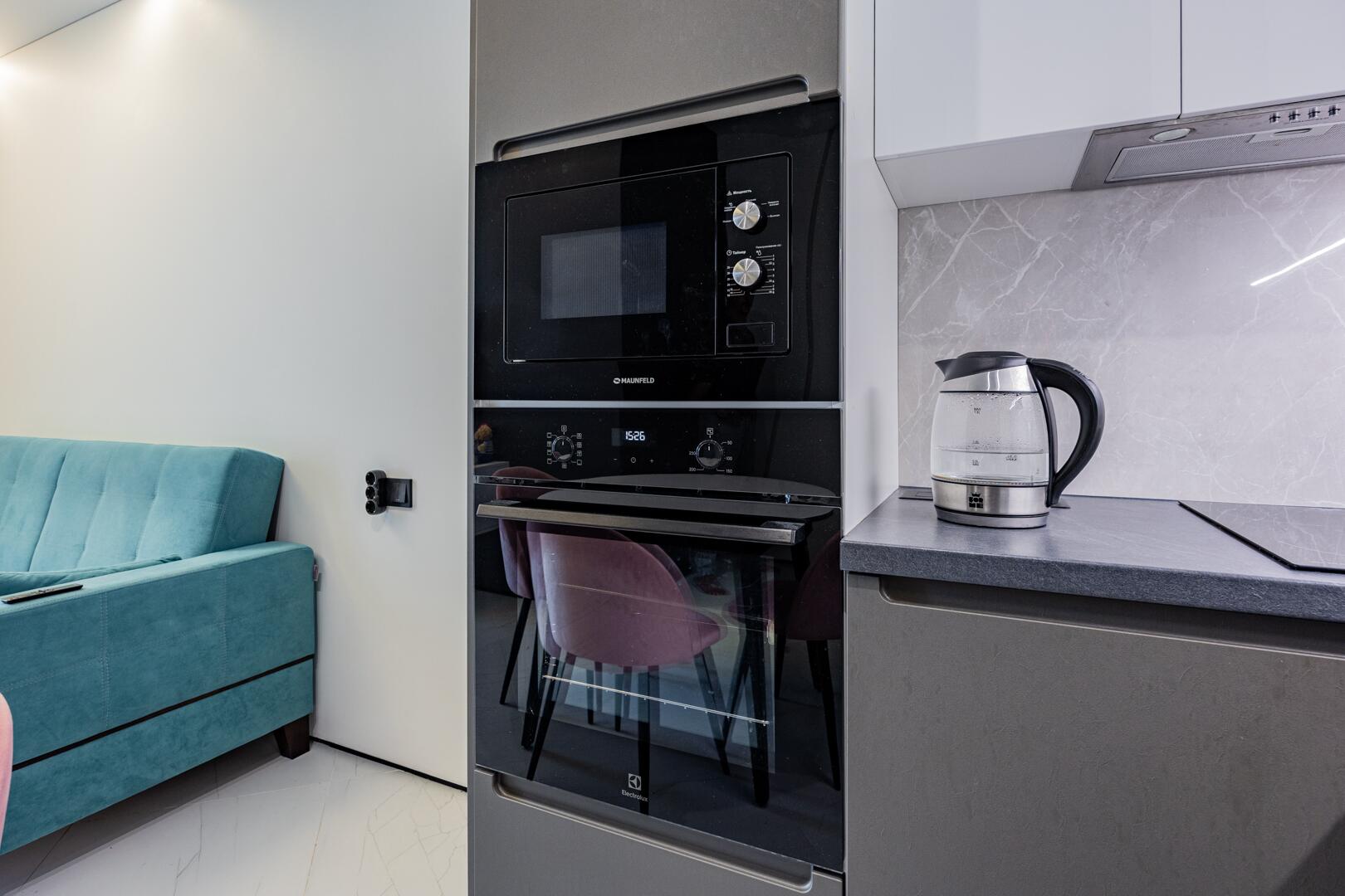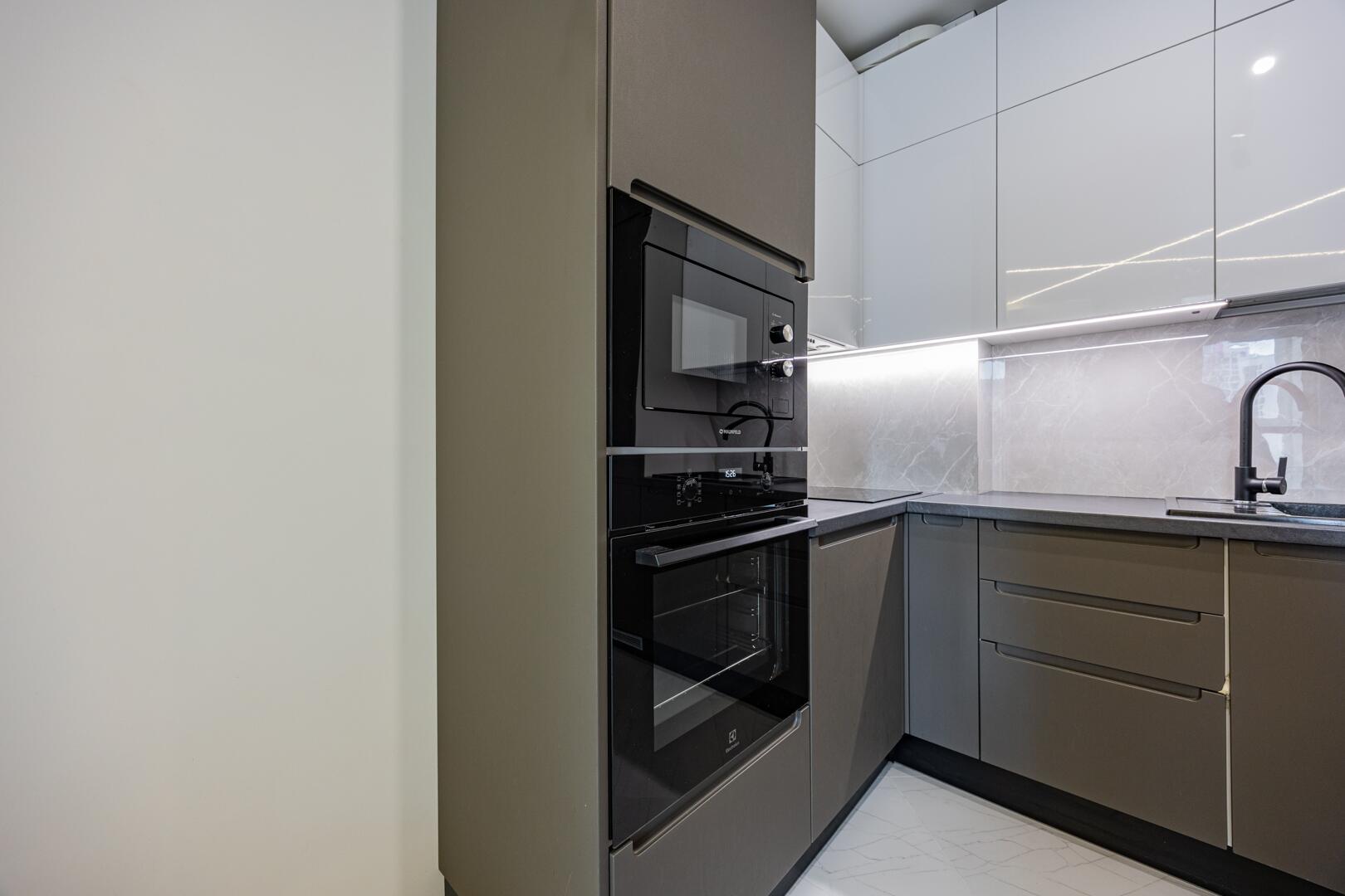 В прихожей вместительный встроенный шкаф-купе, встроенная кухня с крашенными фасадами МДФ, со всей техникой: электрическая индукционная плита, вытяжка, встроенный холодильник, встроенная микроволновая печь.