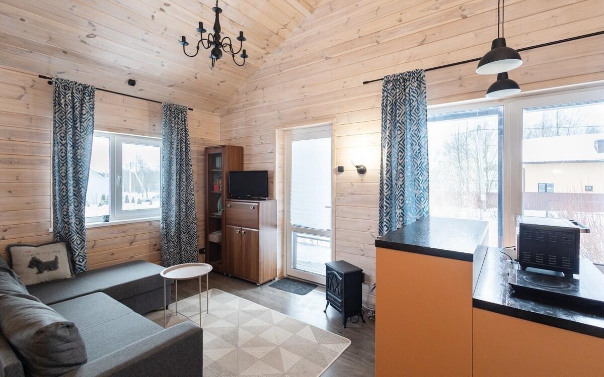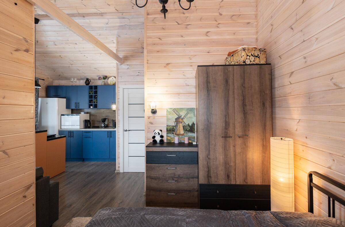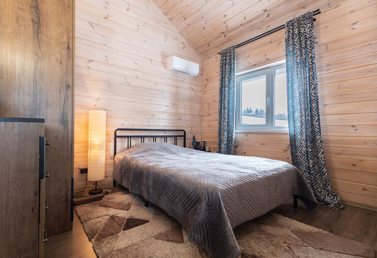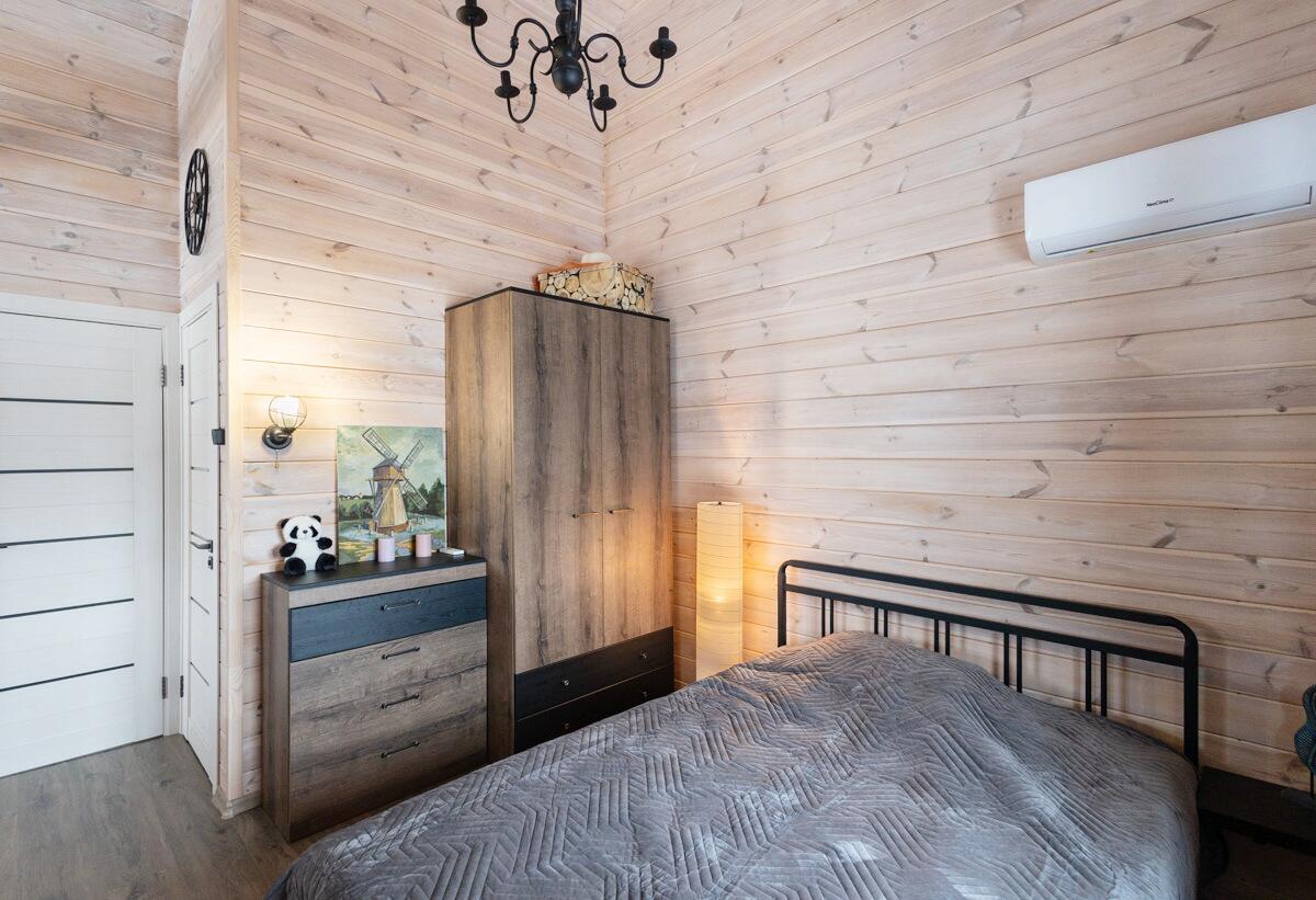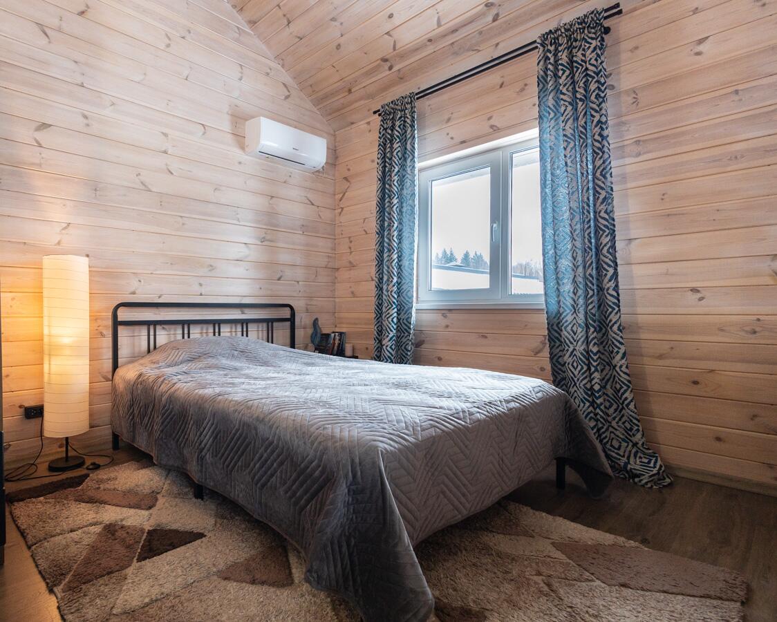 • Каркасная технология с премиум-отделкой: имитация бруса внутри и снаружи, пропитка Teknos для долговечности, обработка огнебио-составами. Утеплитель 150 мм в стенах и крыше, 200 мм в полу — тепло зимой, прохлада летом.
