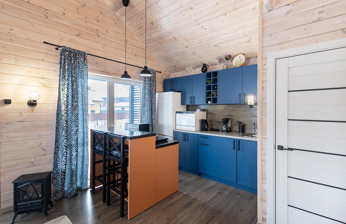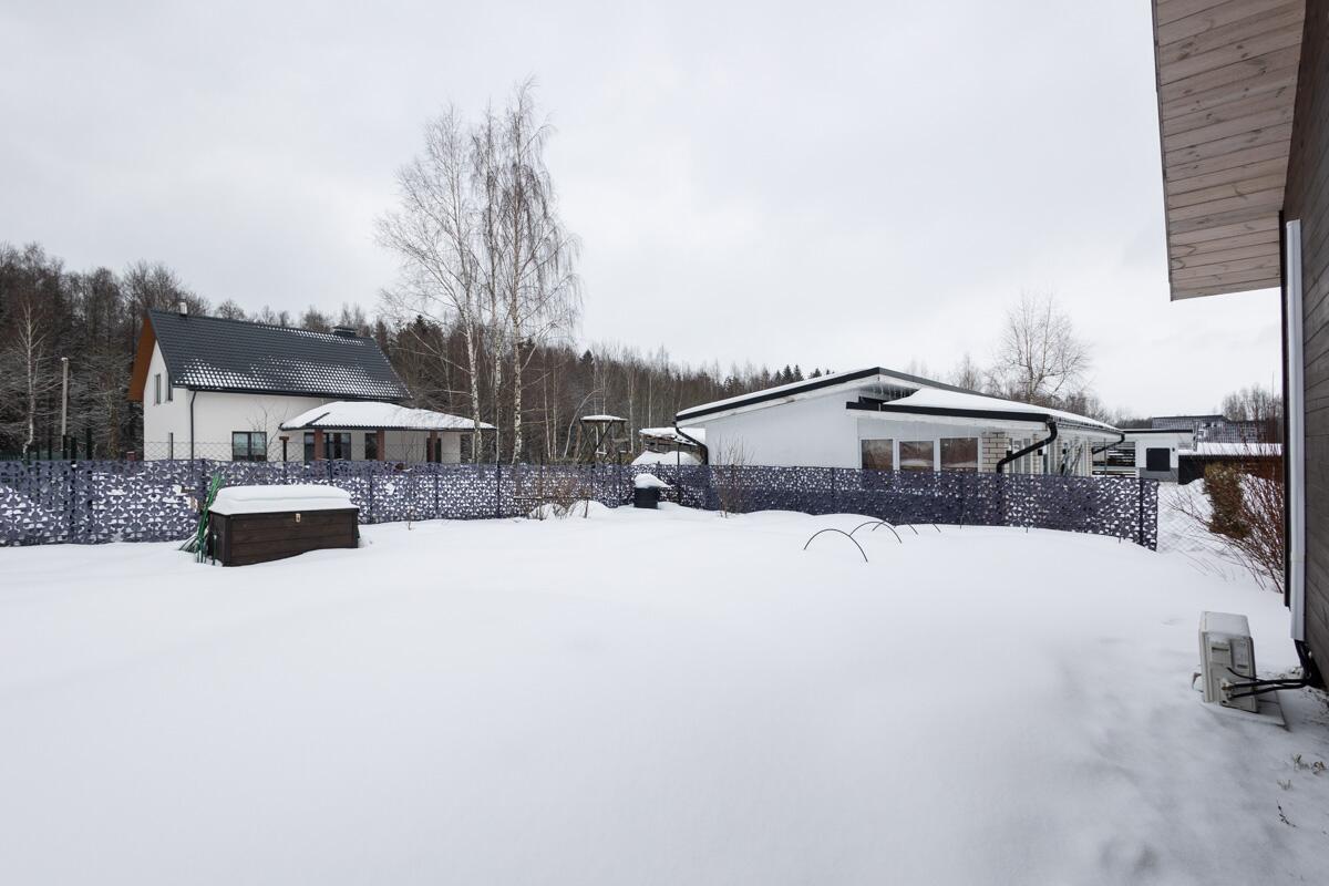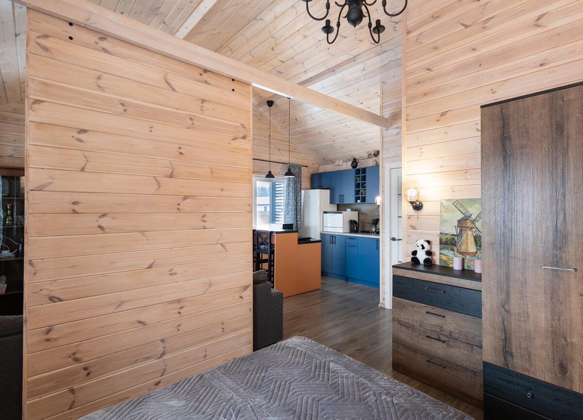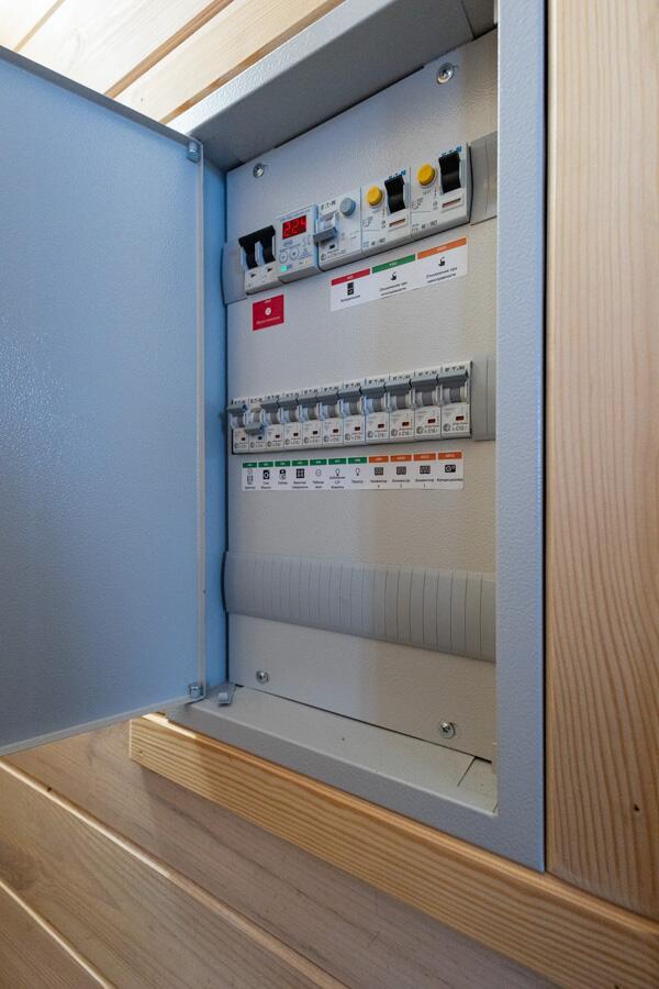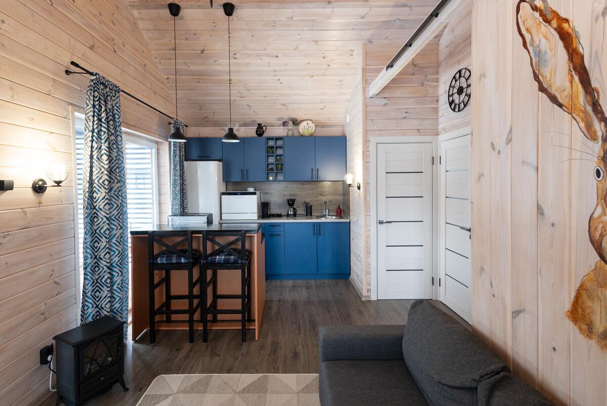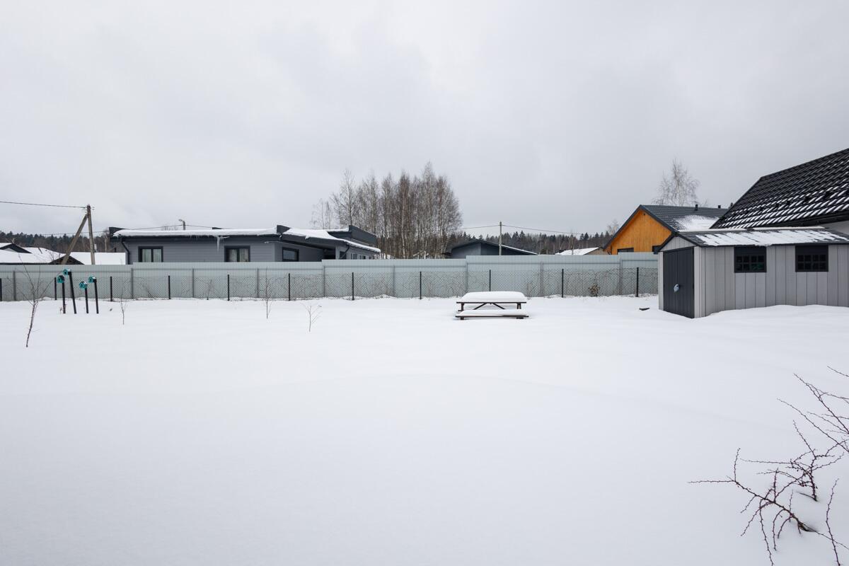 • Каркасная технология с премиум-отделкой: имитация бруса внутри и снаружи, пропитка Teknos для долговечности, обработка огнебио-составами. Утеплитель 150 мм в стенах и крыше, 200 мм в полу — тепло зимой, прохлада летом.
