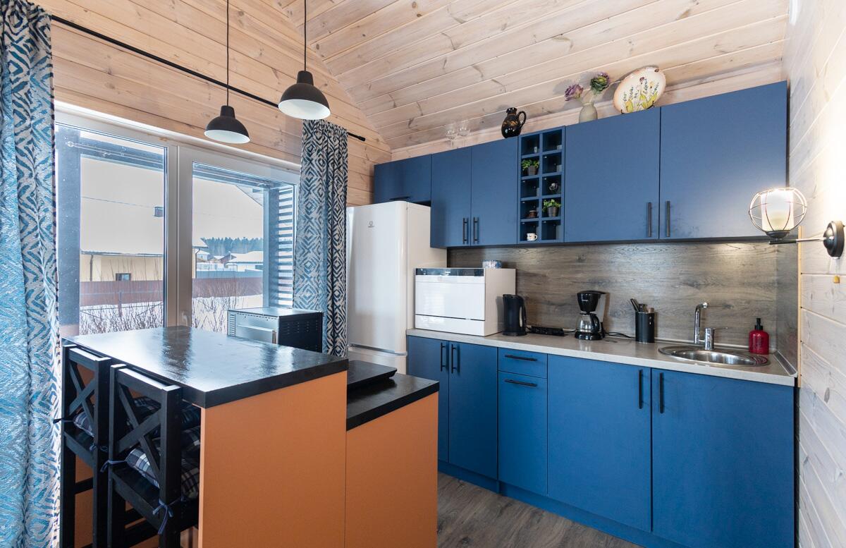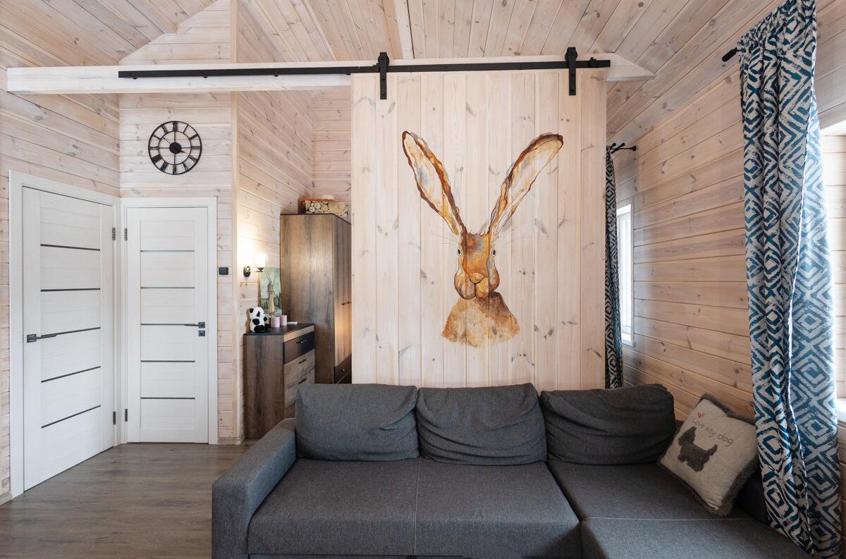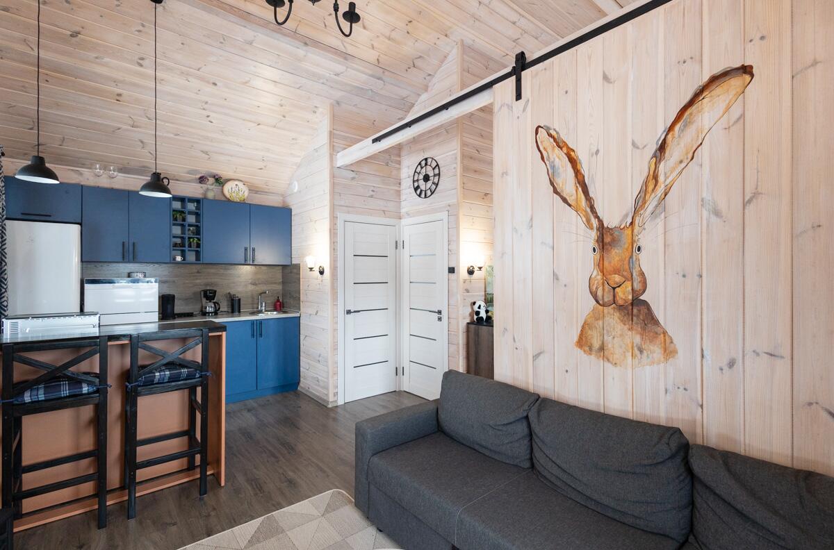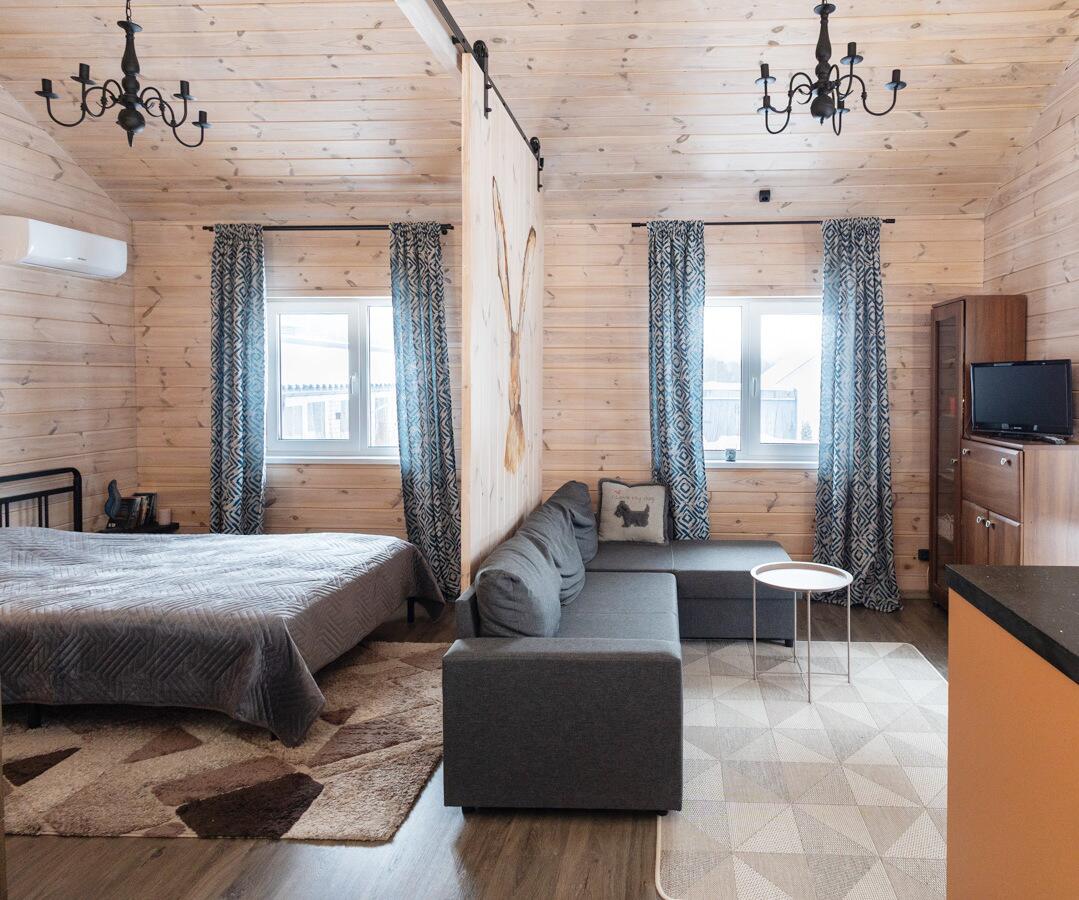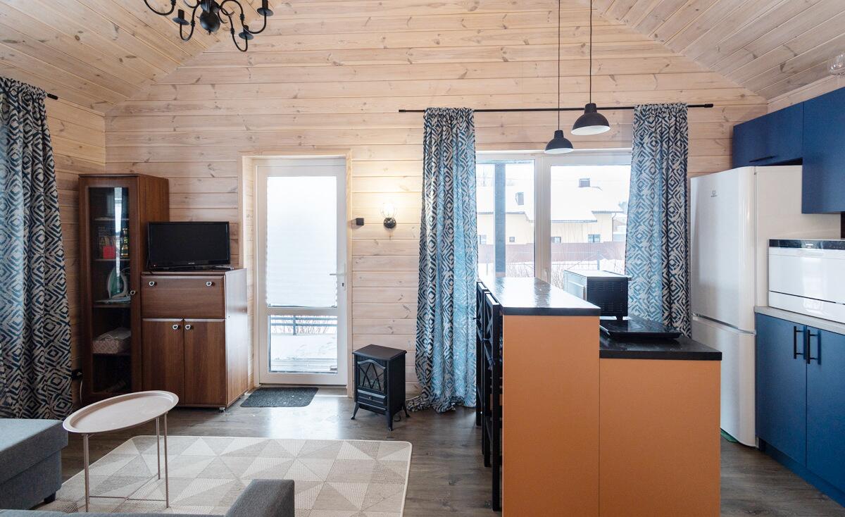 • Каркасная технология с премиум-отделкой: имитация бруса внутри и снаружи, пропитка Teknos для долговечности, обработка огнебио-составами. Утеплитель 150 мм в стенах и крыше, 200 мм в полу — тепло зимой, прохлада летом.