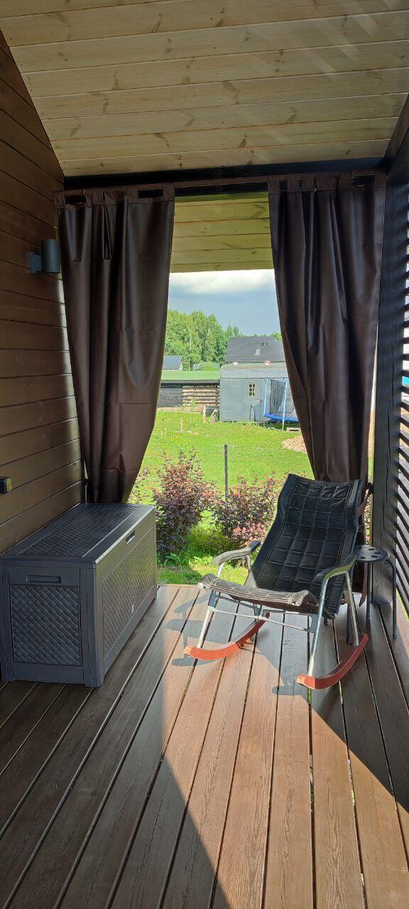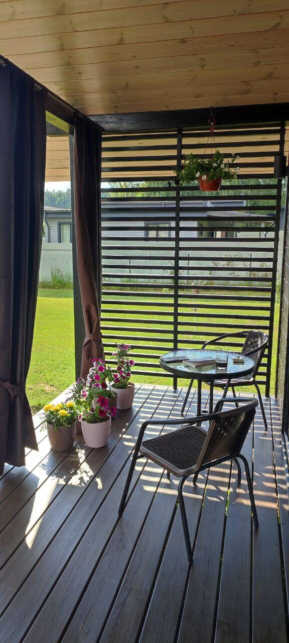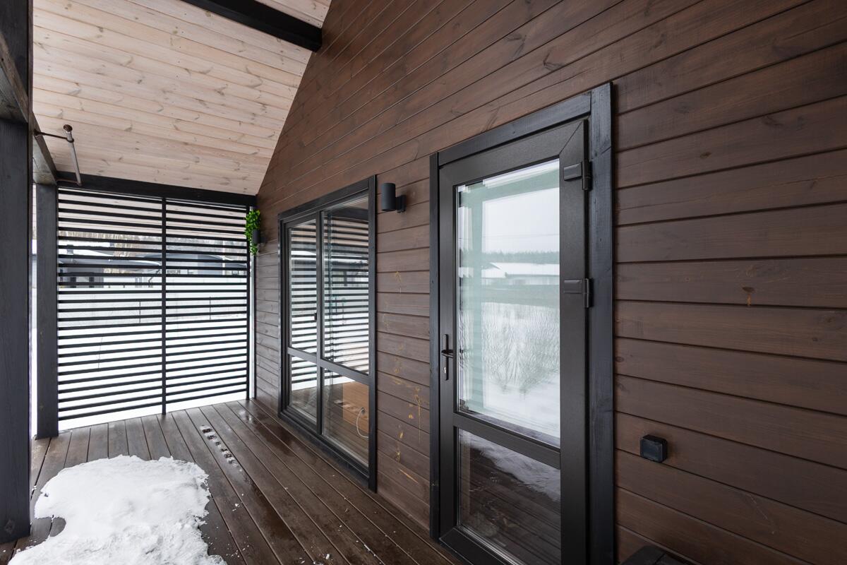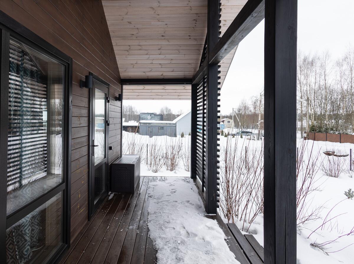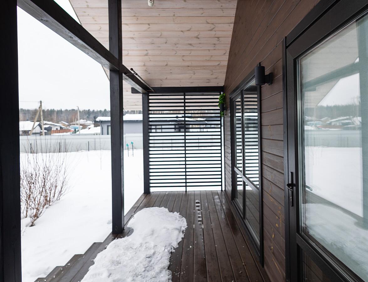 • Терраса из сибирской лиственницы с панорамными окнами в пол и дополнительным выходом — идеально для утреннего кофе с видом на природу.
