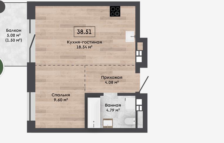 Общая площадь 38.51 м²
