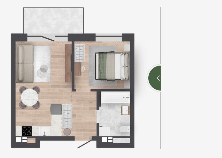 Квартиры с террасами на 1-м этаже площадью от 18 до 28 кв.м — полноценные террасы с видом в зеленый коридор и во двор.