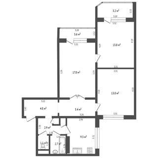 Общая площадь квартиры — 75,1 м2 (СНБ) Гостиная — 17,8 м2 с лоджией Спальня — 13,8 м2 с балконом Детская — 13,8 м2 Кухня — 9,3 м2 Полностью готова к проживанию. Установлены стеклопакеты, металлическая входная дверь. Вся мебель и техника остаётся новым владельцам.