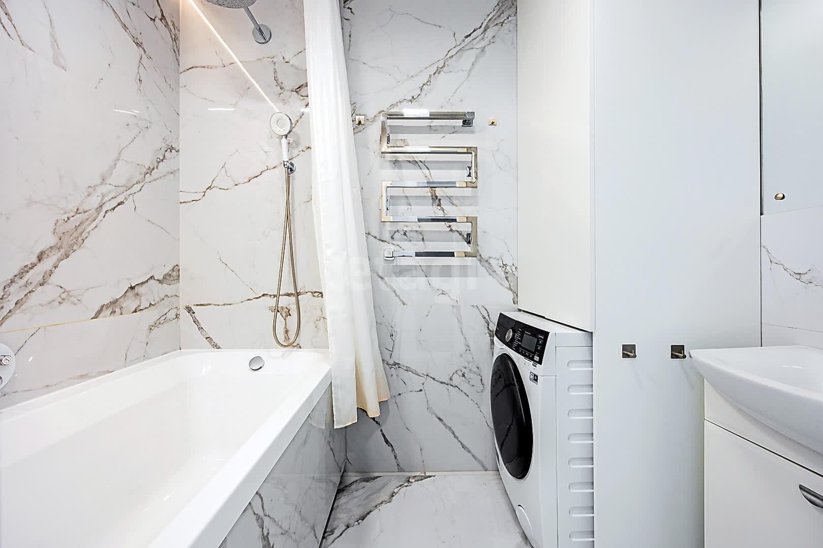 - 2-й санузел с большой комфортной ванной Radomir Хельга 170x90 с удобной системой регулировки и управления "смарт-бокс" Grohe, раковиной, стирально-сушильной машиной Electrolux на 10 кг, проточный электрический водонагреватель Electrolux, стильный и функциональный полотенцесушитель Ростела Грация обеспечивает удобство и дополняет визуальное впечатление