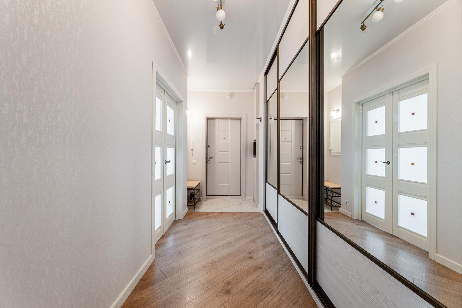 Отделка: пол – ламинат и плитка, потолок – натяжной и гипсокартонный, стены оклеены обоями, установлены стеклопакеты и входная металлическая дверь.