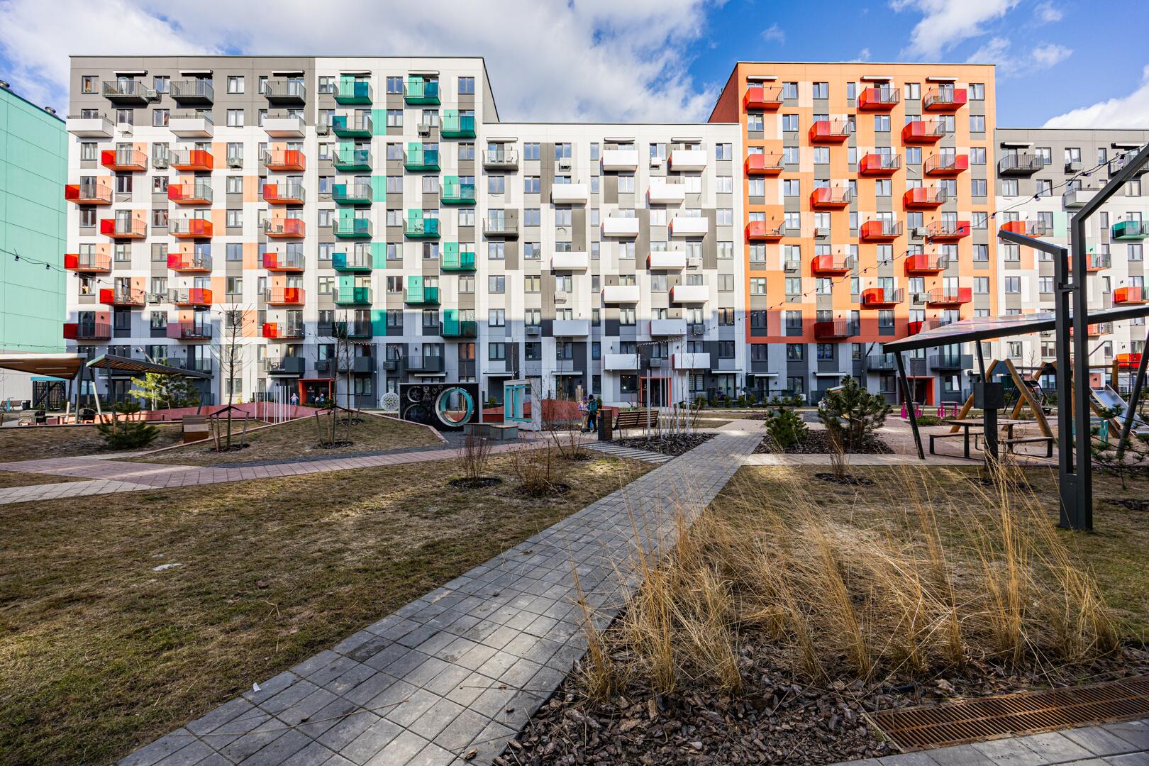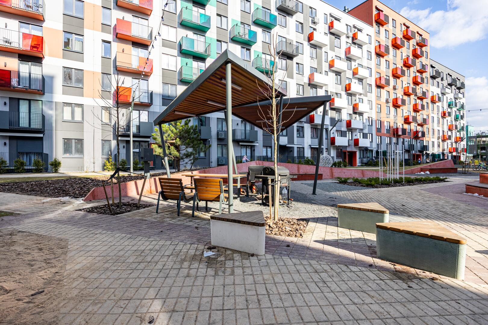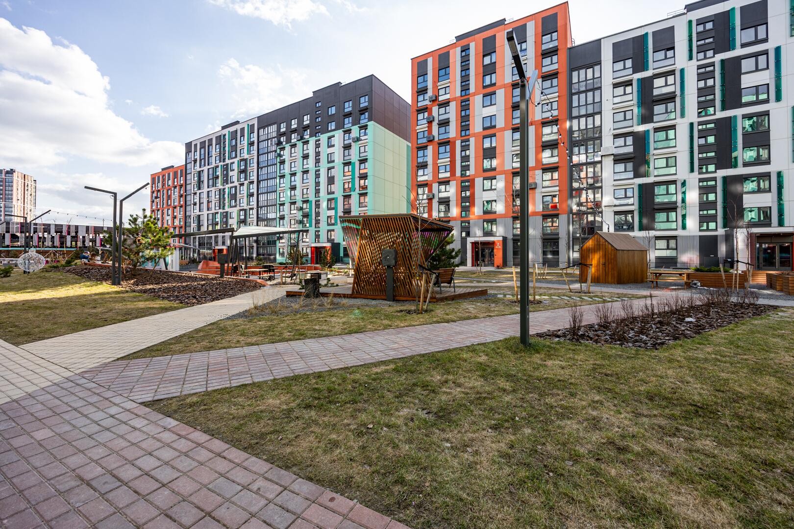 • Благоустроенная придомовая территория – закрытый двор свободный от автомобилей, все парковочные места расположены по внешнему периметру дома. Во дворе ландшафтное озеленение, летняя мебель, ночная подсветка, детская и тренажерная площадки. Есть свое место в велобоксе. Видеонаблюдение по всему кварталу, шлагбаумы, зарядки для электромобилей.