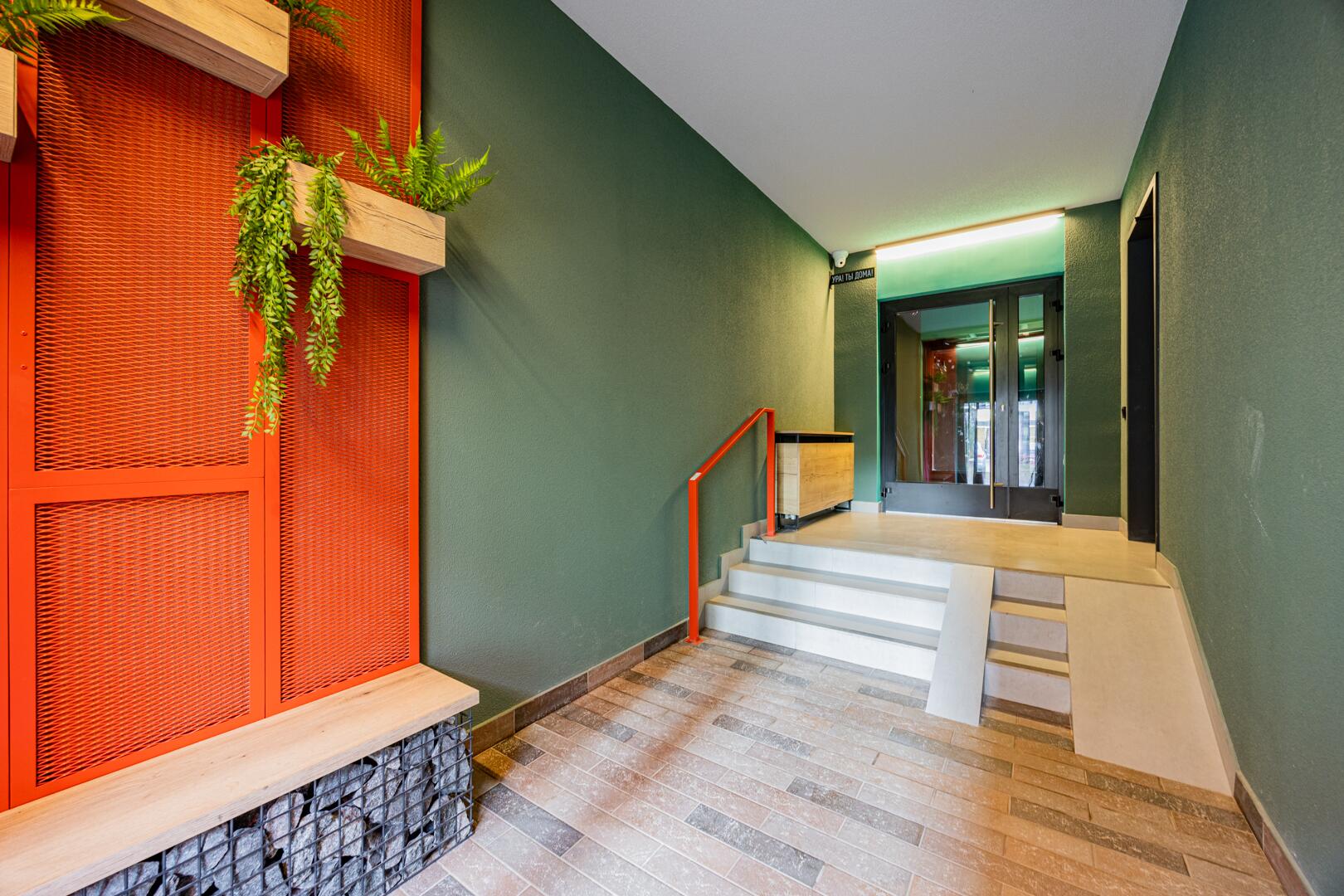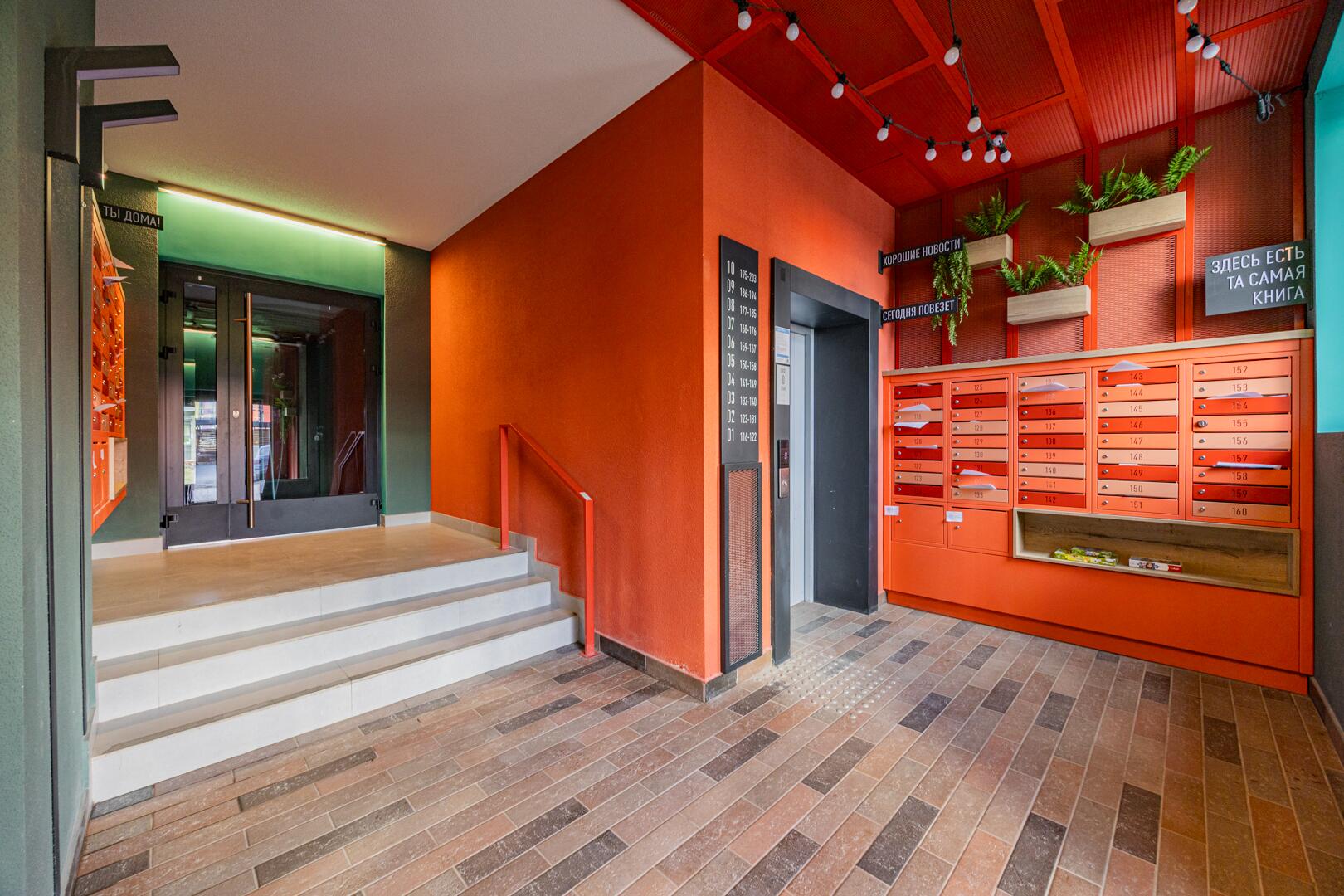 • На первом этаже – находится лапомойка, холл, два выхода из подъезда: один во двор, второй на улицу и к парковкам