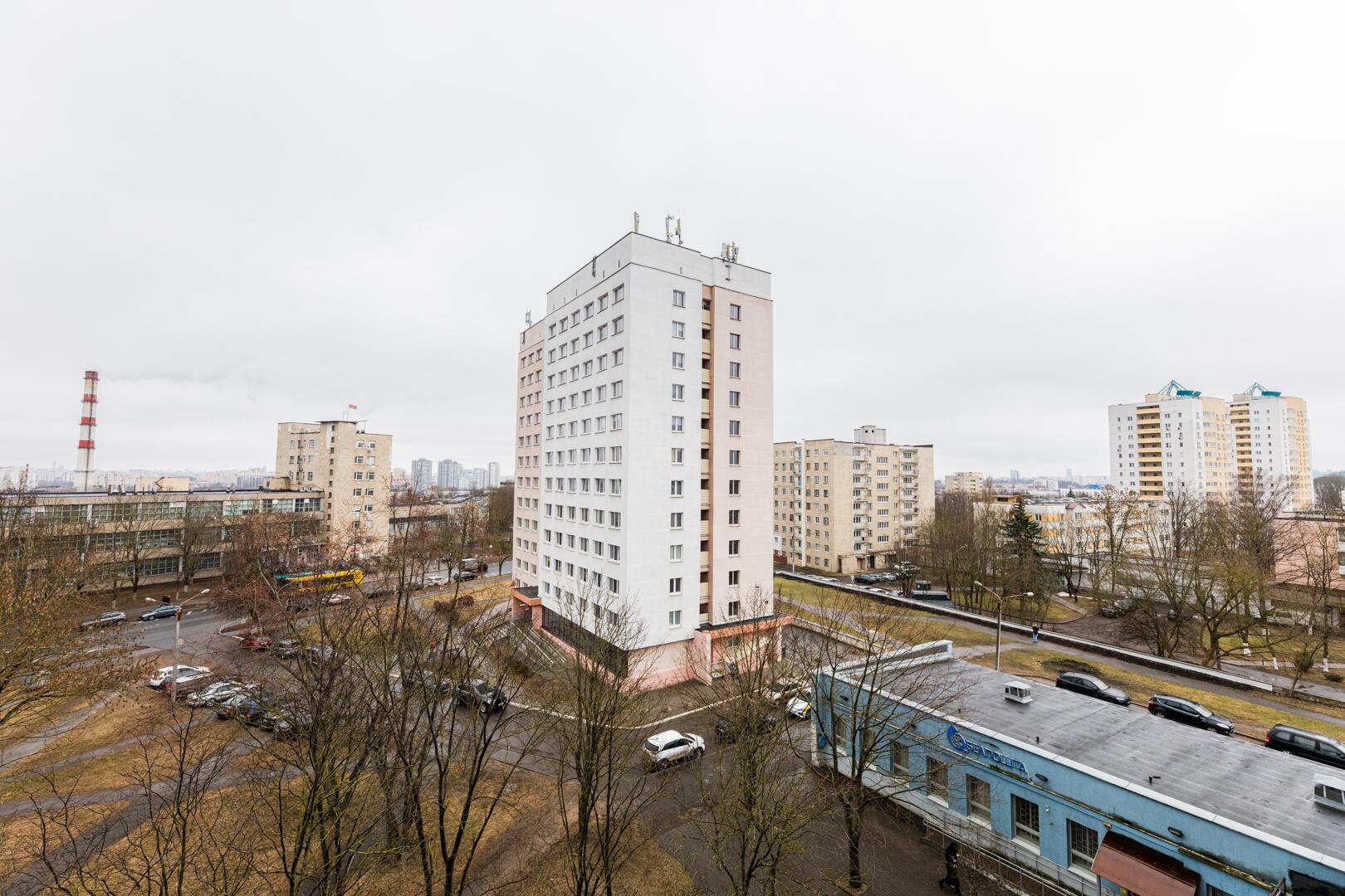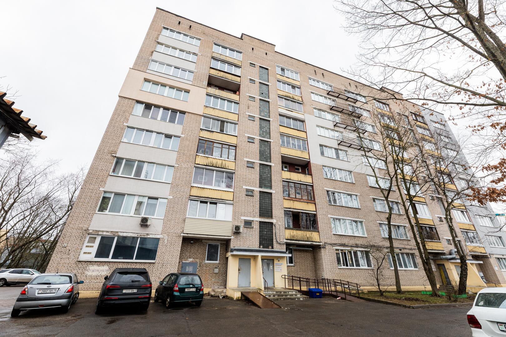 В квартире 2 раздельные комнаты, 1 проходная, просторный коридор, кухня с выходом на лоджию, раздельные санузел и ванная комната. Все окна выходят в сторону улицы Ольшевского. Перед домом тихий сквер и детская площадка. В соседних домах аптека, почта, продуктовый магазин, филиал Беларусбанка.