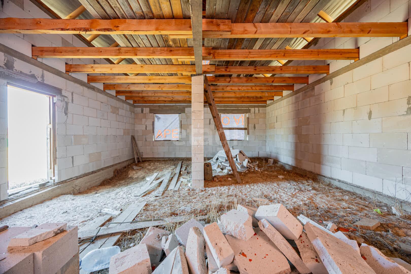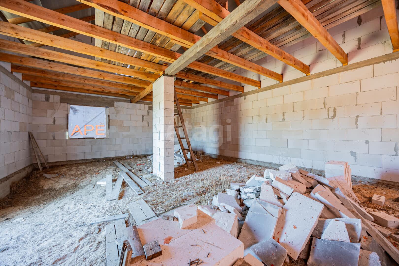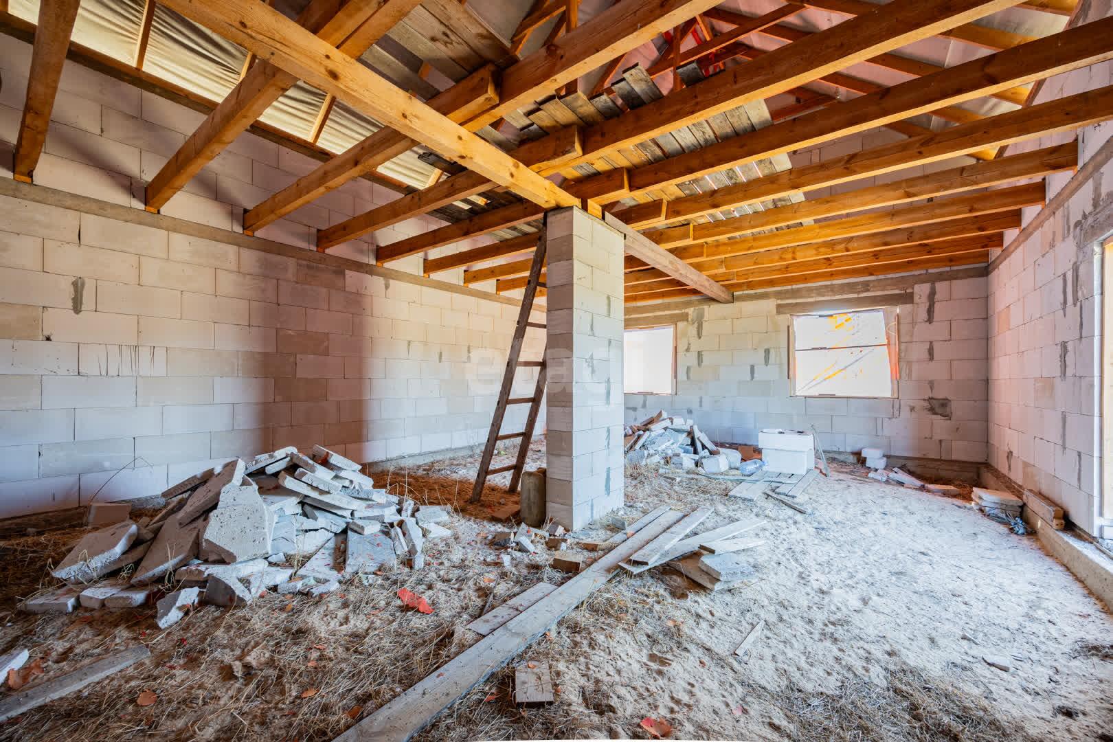 - Наружные и внутренние стены дома без отделки. Высота подкровельного пространства позволяет обустройство второго этажа.