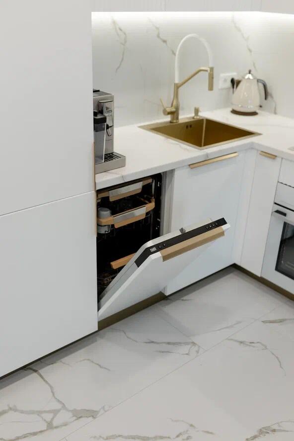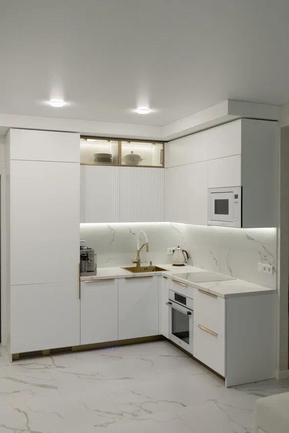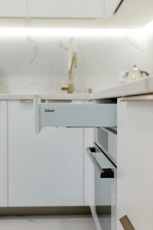 Отдельного внимания заслуживает кухонная зона – продуманная эргономика, индивидуальный проект, премиальная техника, фурнитура Blum.
