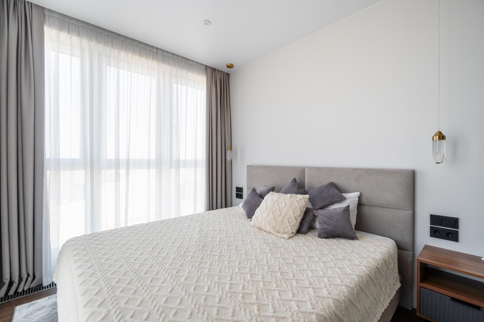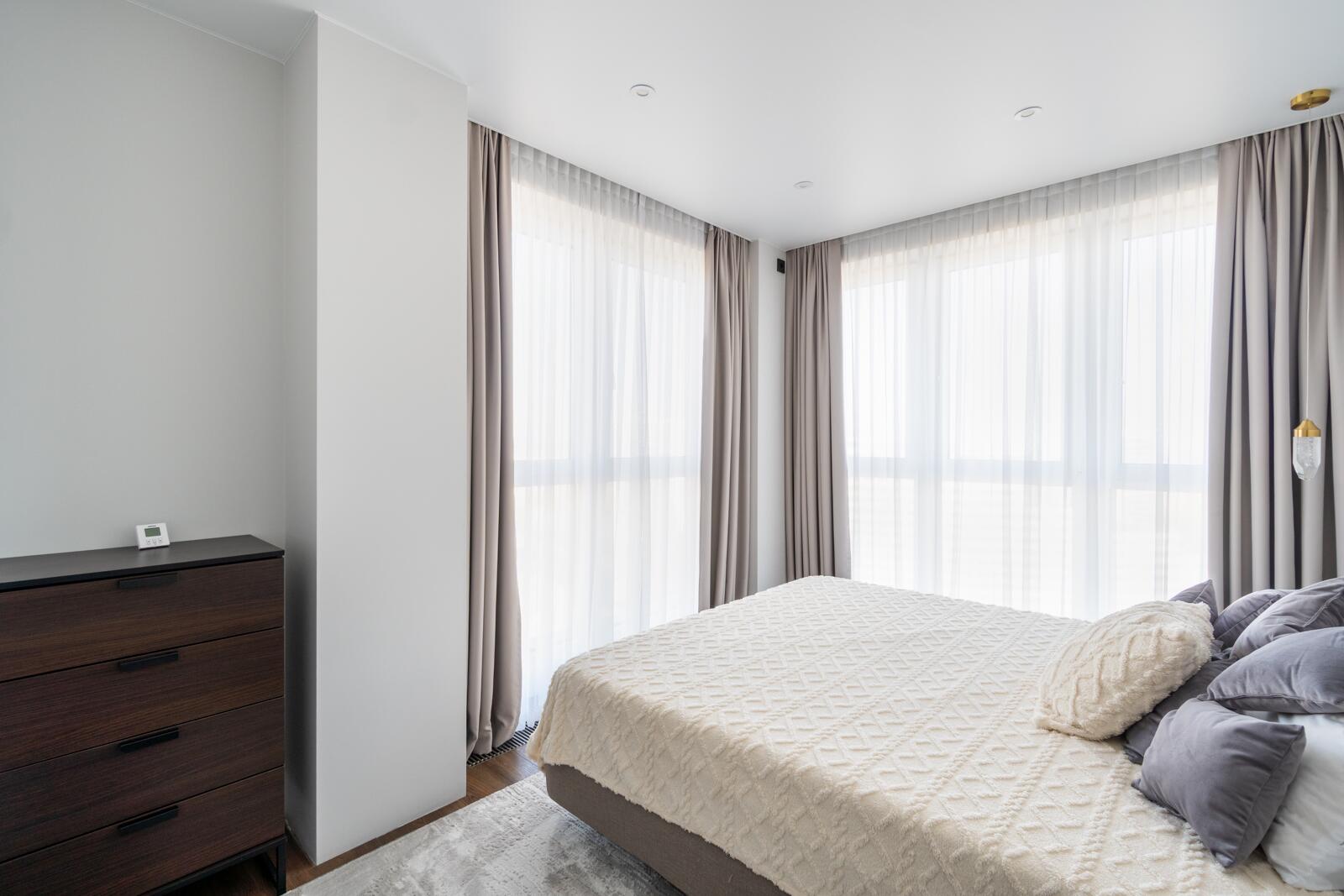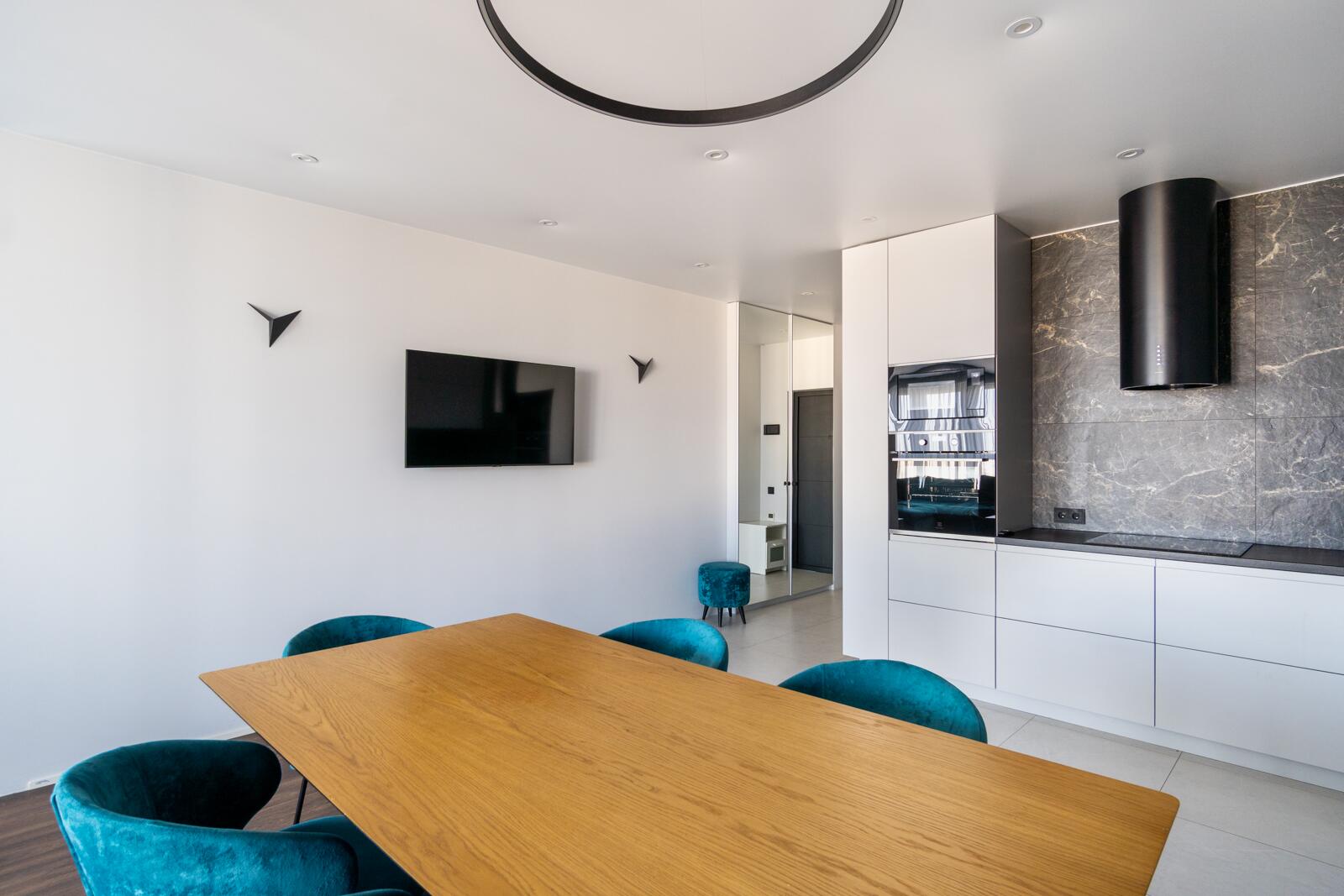 Квартира спроектирована с учетом максимального удобства и гармонии пространства. Прихожая оформлена в светлых тонах: на полу - плитка лучших европейских брендов стены украшены зеркалами, потолок натяжной. Здесь же находится вместительная гардеробная. Гостиная совмещена с кухней и представляет собой просторное, наполненное светом помещение с выходом на благоустроенную лоджию с панорамным видом на город - дополнительное место для отдыха и работы. Со спальной комнаты открываются красивейшие виды на город с двух сторон. Кухня сделана по индивидуальному дизайнерскому проекту и оборудована всей необходимой встроенной бытовой техникой «Electrolux»: холодильником, микроволновой печью, духовым шкафом, варочной панелью, вытяжкой, посудомоечной машиной. Современный ванная комната оборудована сантехникой - качественных европейских брендов. На полах - импортная керамическая плитка и ламинат. Выполнена грамотная электрика по всему периметру.