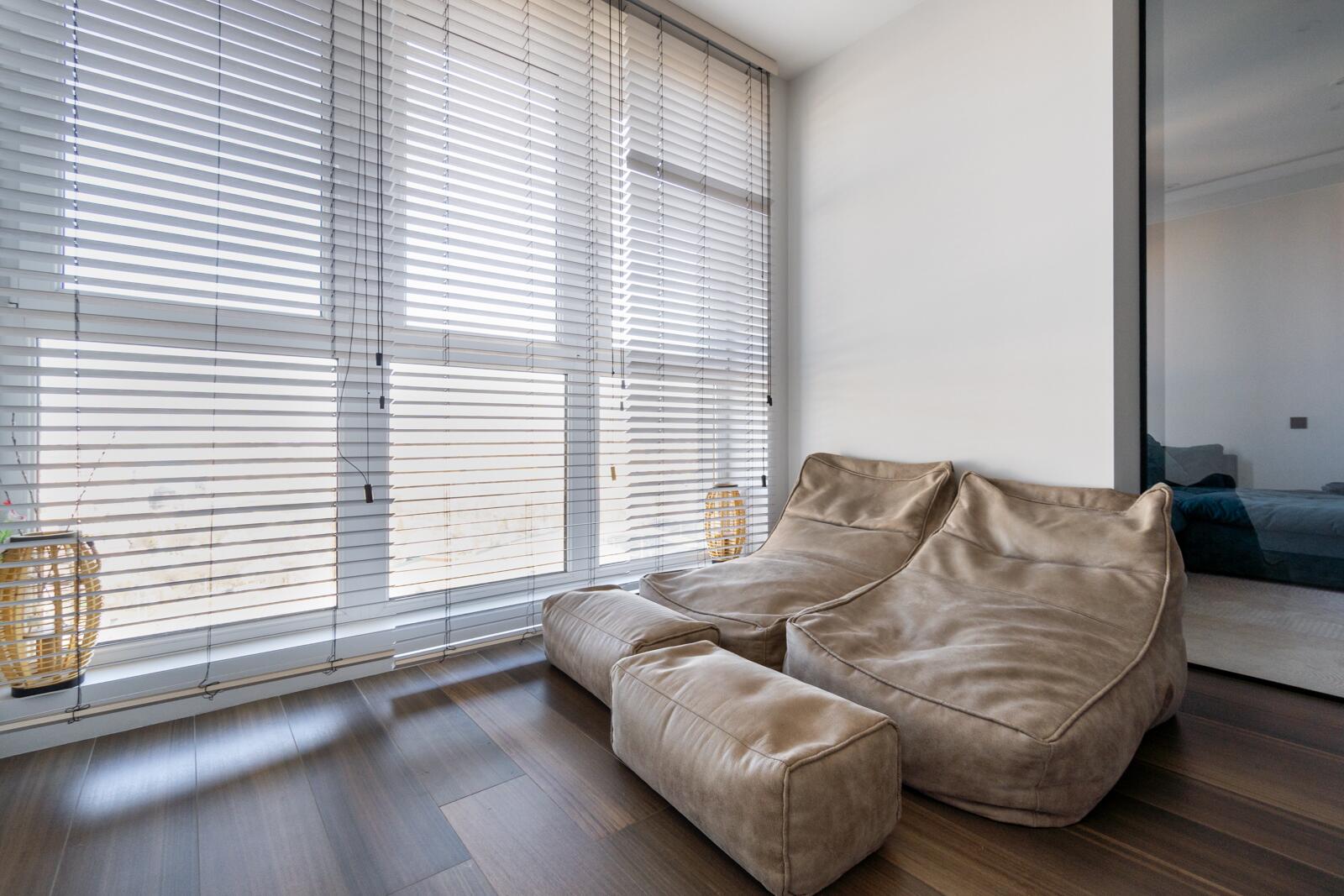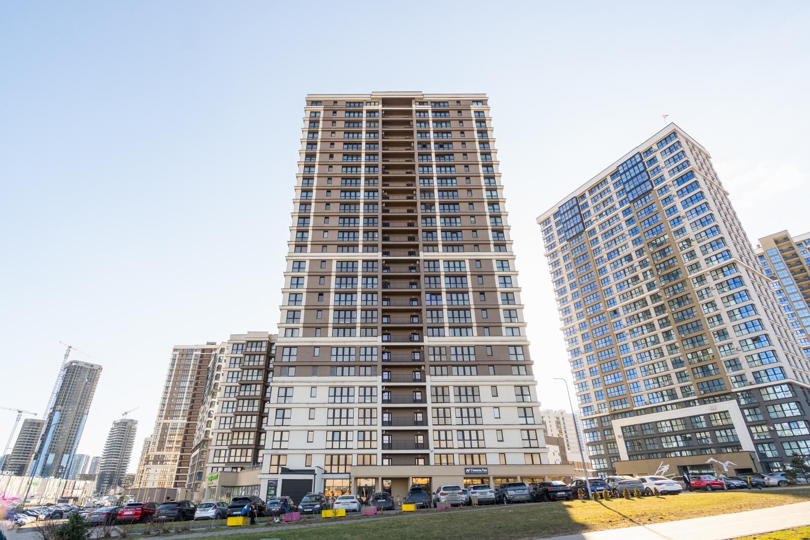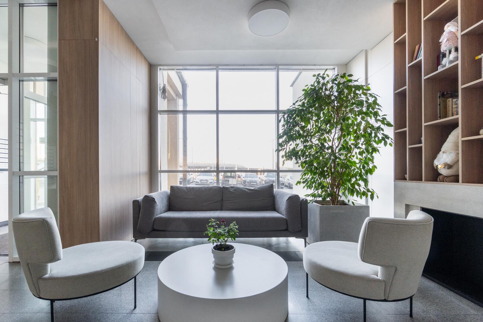 Квартира расположена в современном доме с благоустроенной территорией, видеонаблюдением и просторным подъездом, оформленным в современном стиле с зоной ожидания и мягкой мебелью.