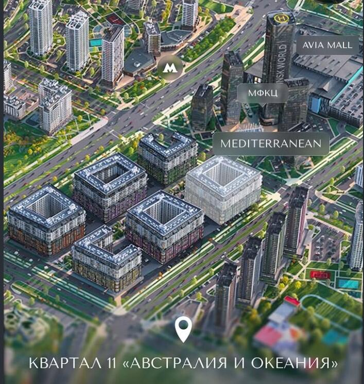 Зеленая парковая зона, международный финансовый центр и крупнейший торговый центр Авиа Молл в центре комплекса.