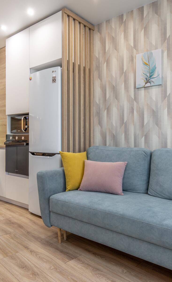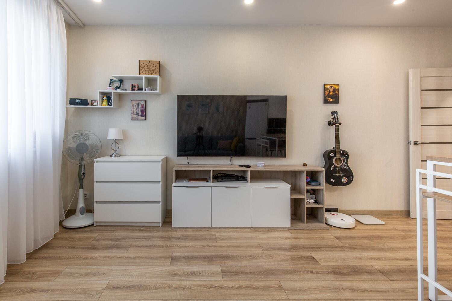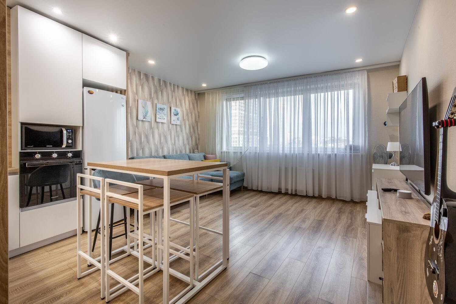 Функциональная планировка: спальня, гостиная с зоной отдыха и рабочим местом, изолированная кухня со столовой группой