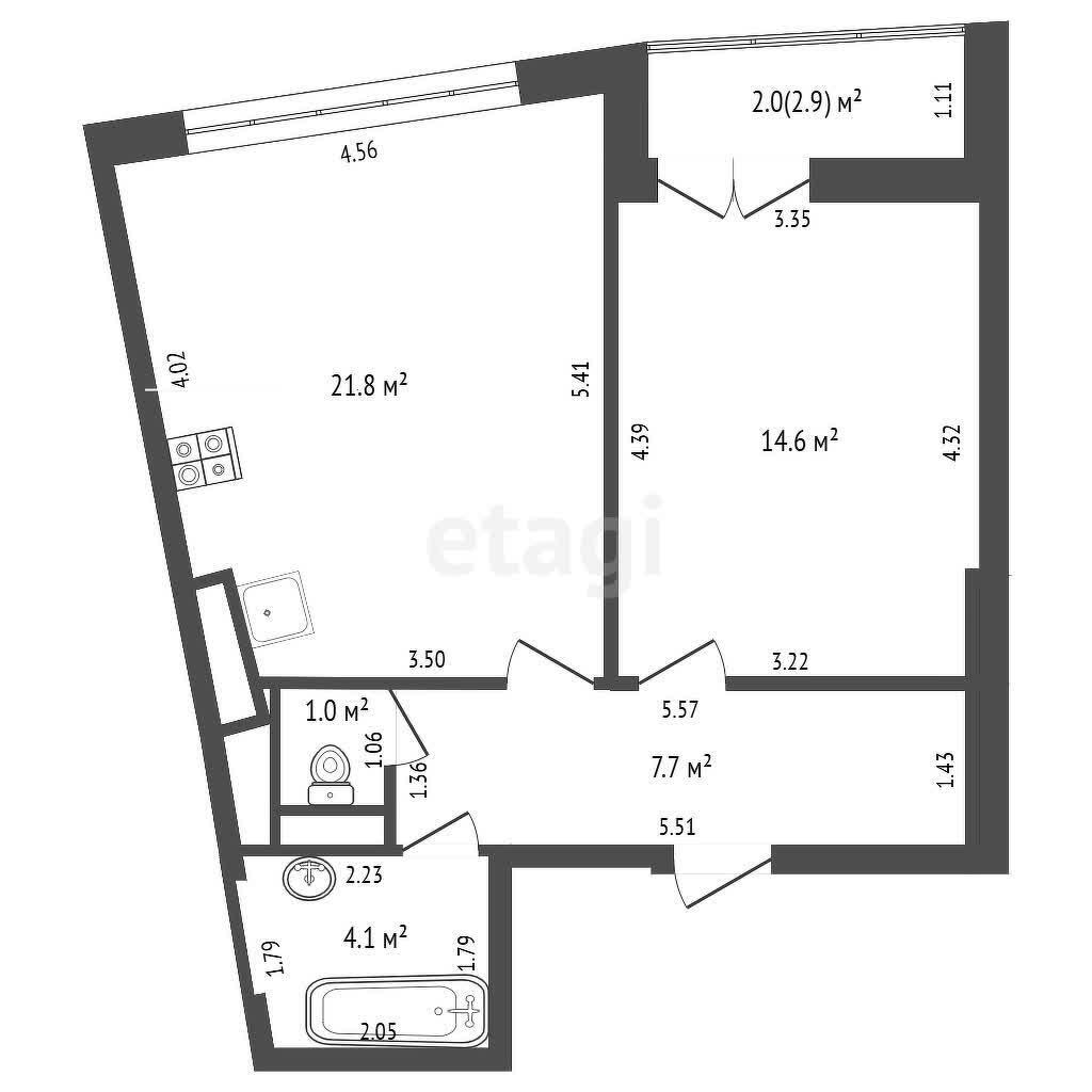 Общая площадь по СНБ — 51.1 м2.