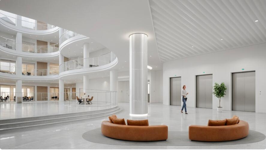 - Многофункциональные бизнес-апартаменты разделяются центральным атриумом на 2 изолированных блока. Каждый из блоков запроектирован самостоятельными входами с лестнично-лифтовым узлом, имеет самостоятельные эвакуационные выходы.